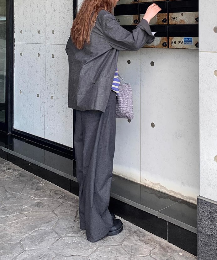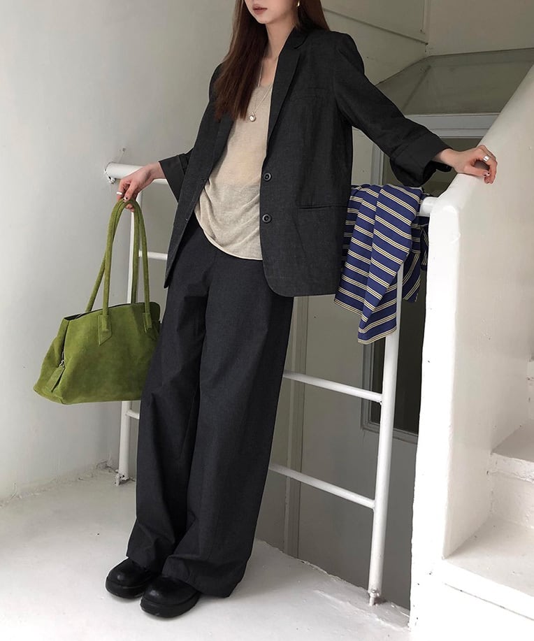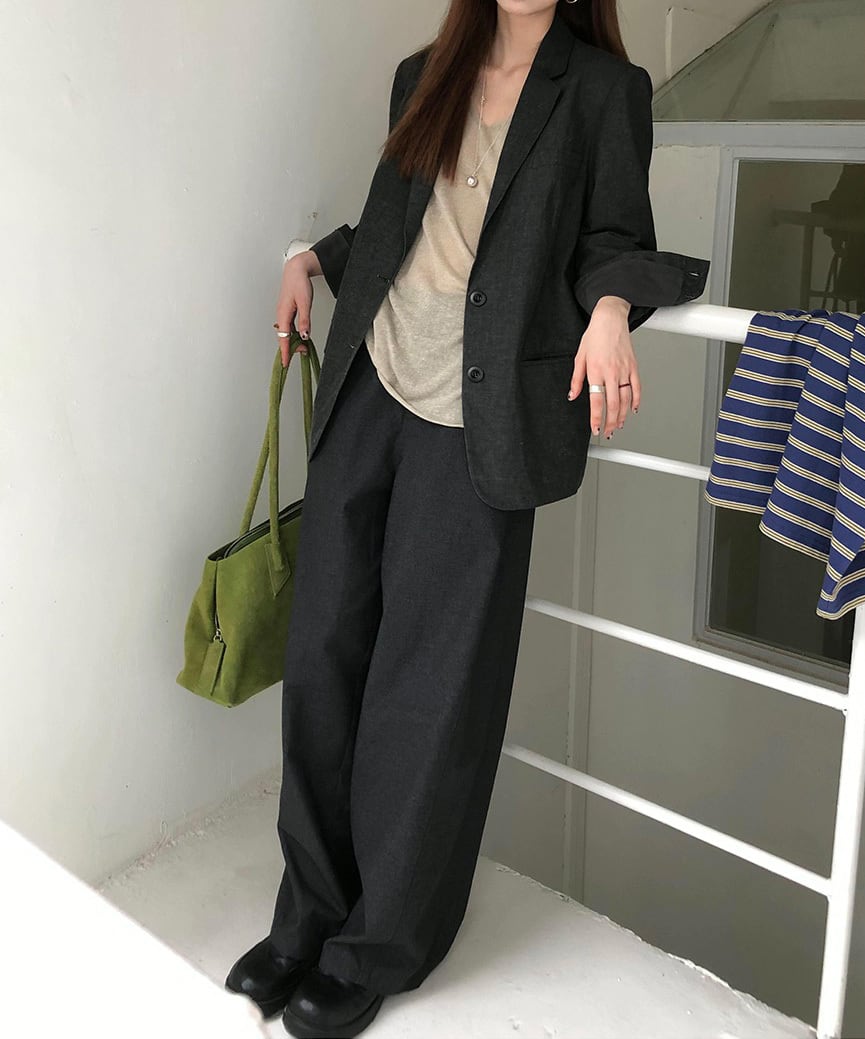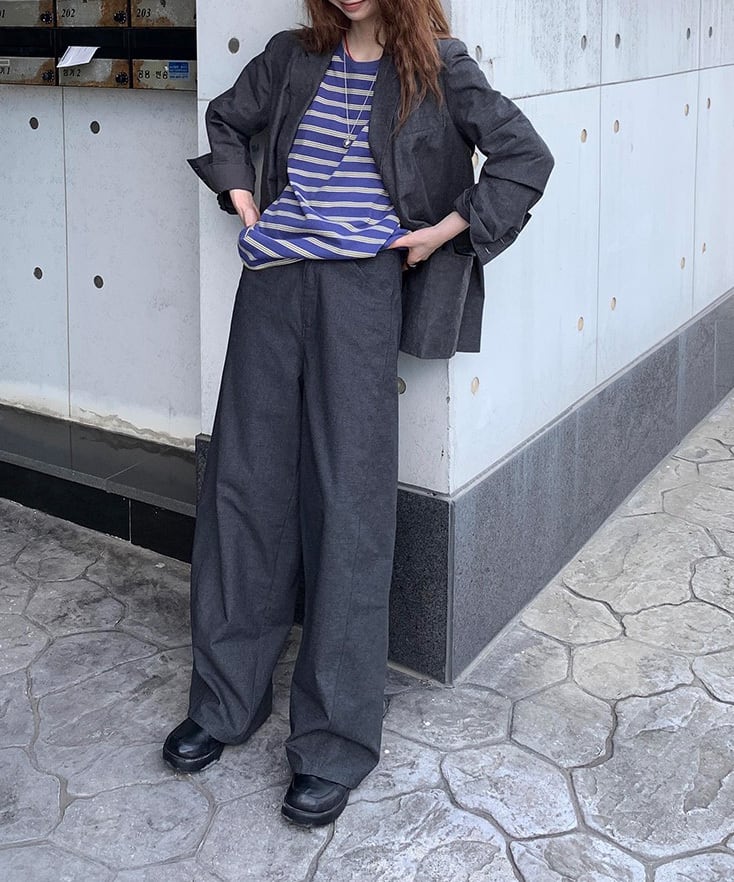 深みのあるカーボングレーが大人っぽい印象のワイドレッグパンツ。