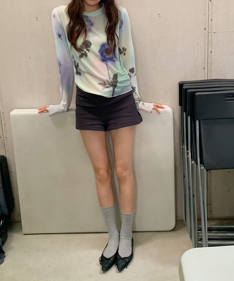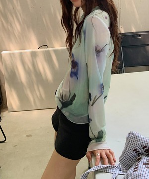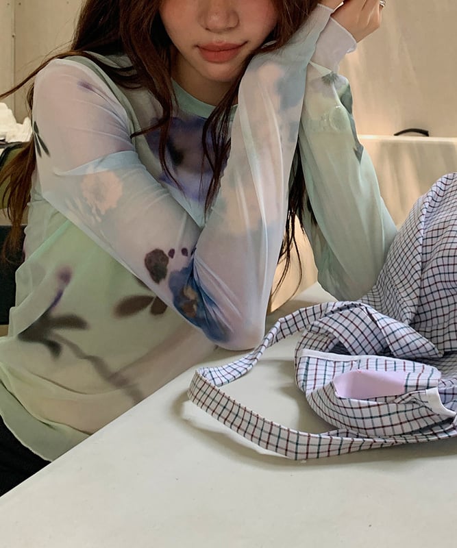 フラワープリントを施したメッシュ素材のロングカットソー。シアー感が軽やかで、インナーとのレイヤードで印象を自在に変えられます。一枚で華やかさをプラスする主役級アイテム