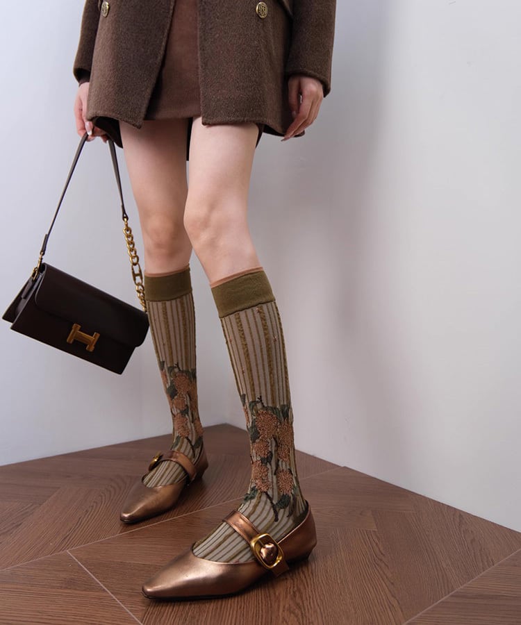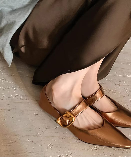 光を受けて優しく輝くブロンズカラーが魅力のローヒールパンプス。
