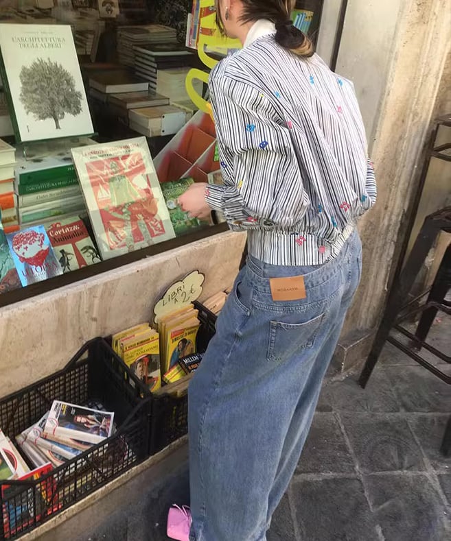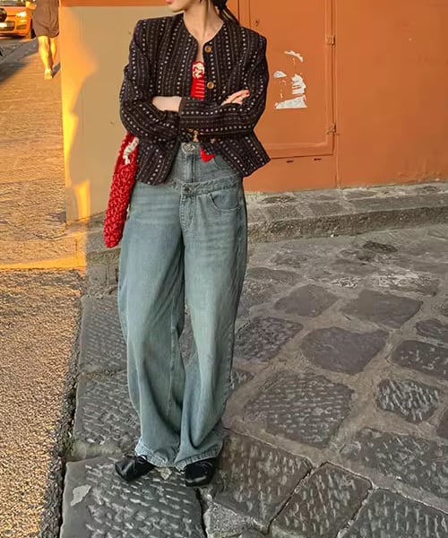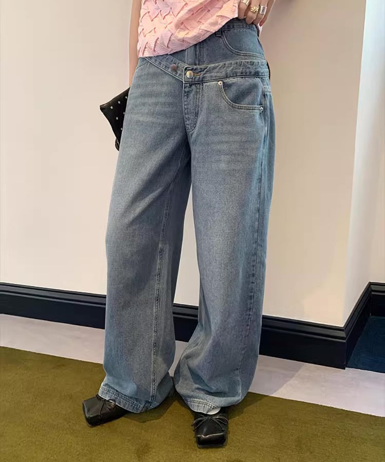 二枚ばきしているように見えるウエストデザインが印象的なツイルスラブデニム。立体感のあるシルエットで、シンプルなトップスと合わせるだけで個性が際立ちます。