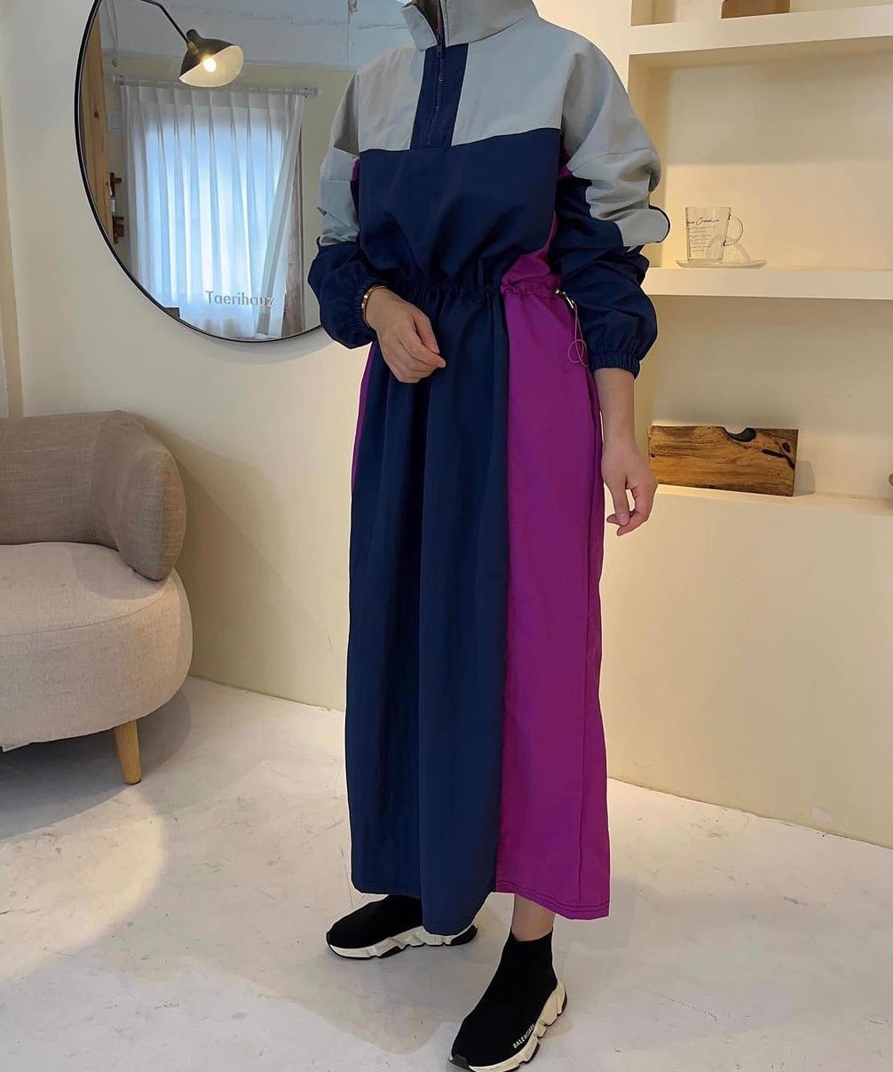 ロング丈のワンピースにハーフジップを施し、レトロな配色デザインが目を引く1枚。