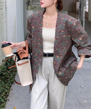 クラシカルな花柄を散りばめたノーカラージャケット。すっきりとした首元のラインが女性らしい抜け感を演出し、羽織るだけで華やかな印象に。ワンピースやデニムなど、合わせるアイテム次第でフォーマルにもカジュアルにも着こなせる万能アイテムです。