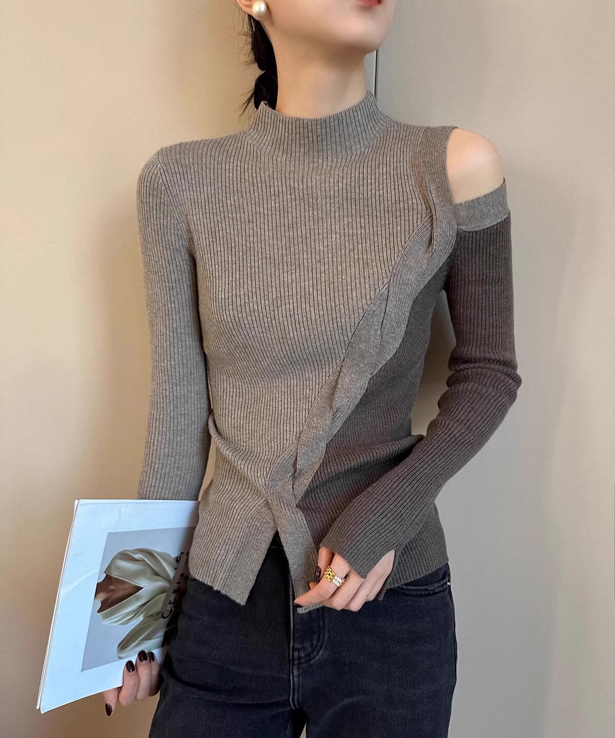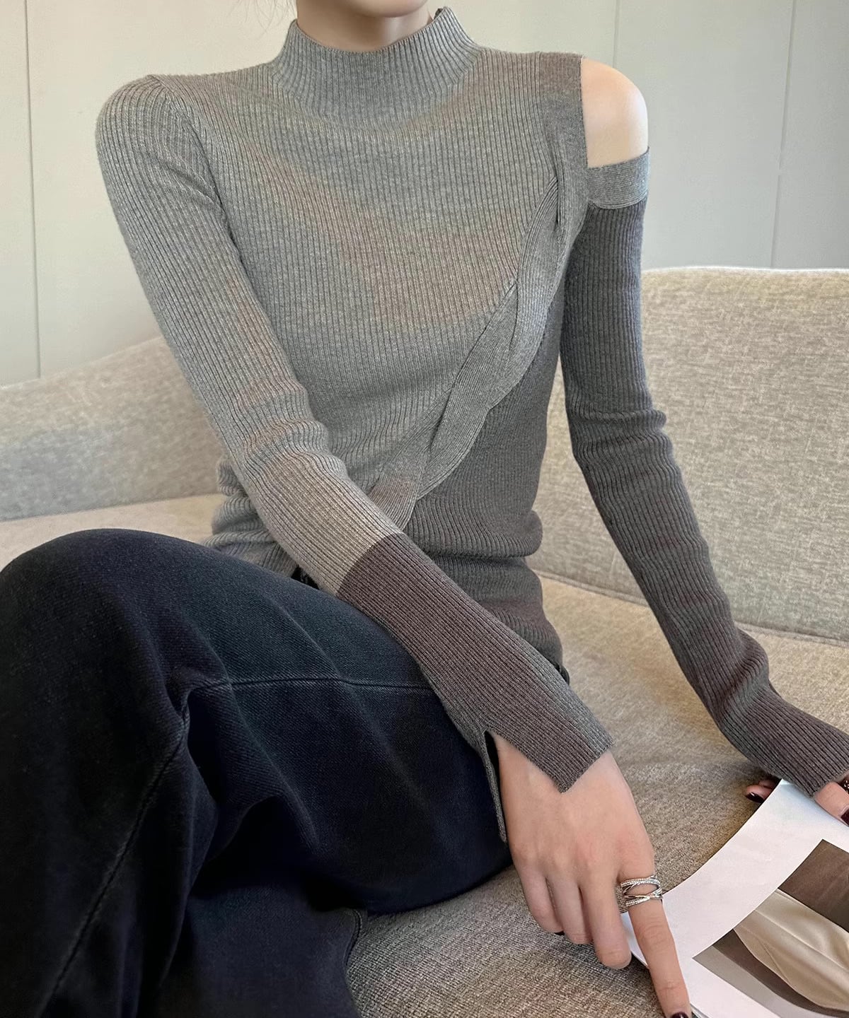 大胆なオフショルダーデザインに、ツイストと配色が効いたリブニット。
