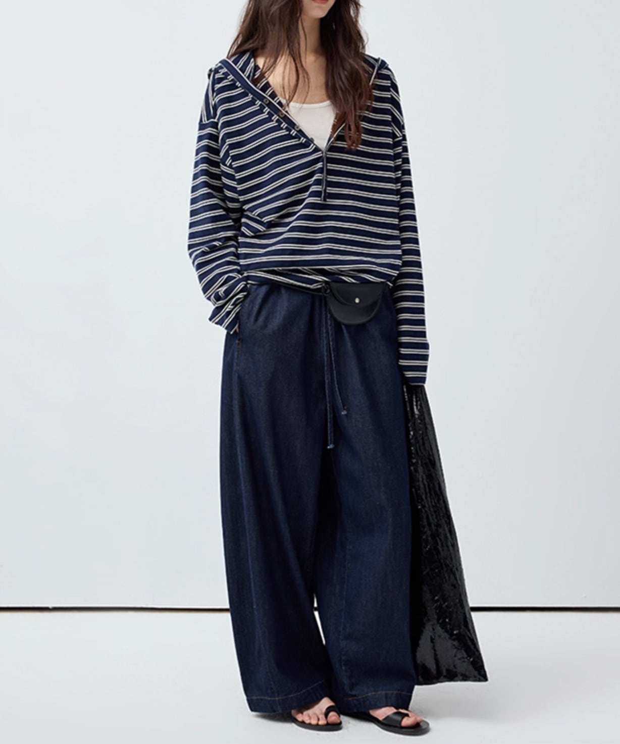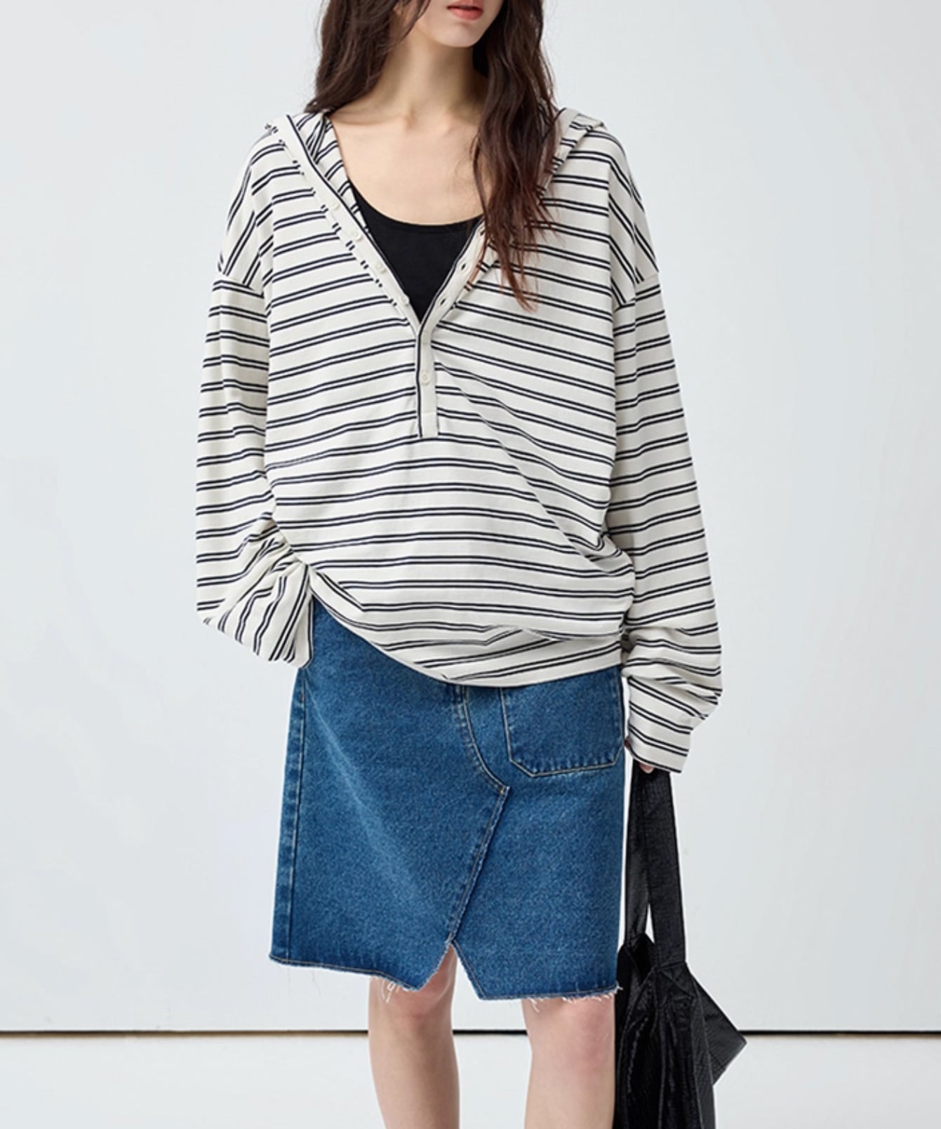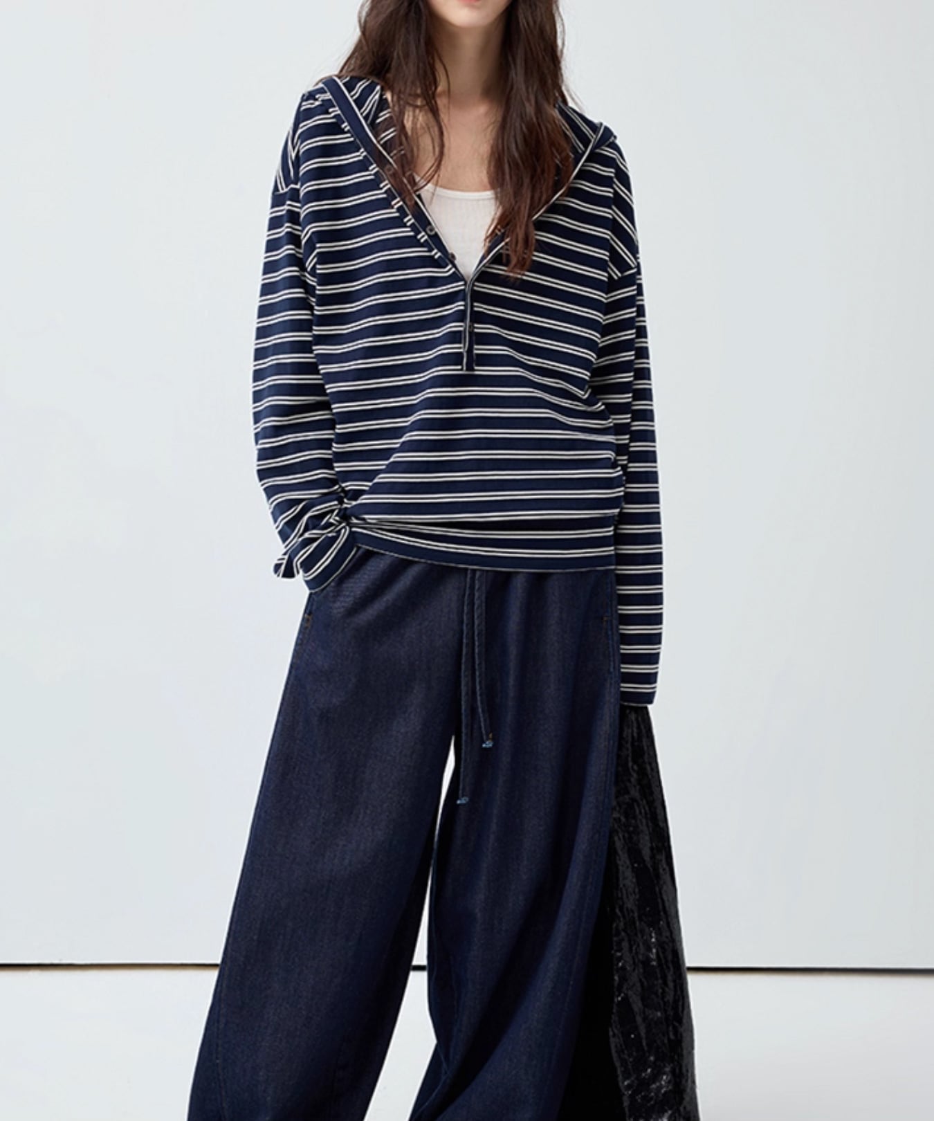 定番のボーダー柄ながら、首元の抜け感で大人っぽさを演出。