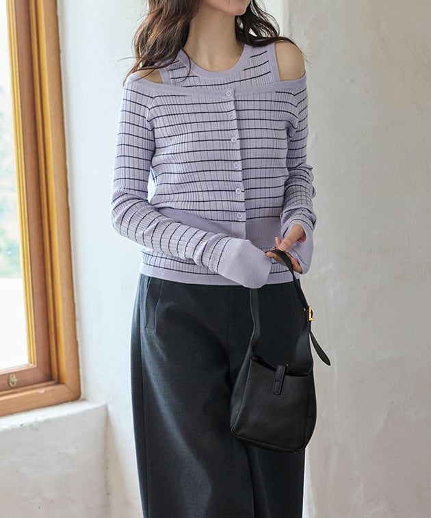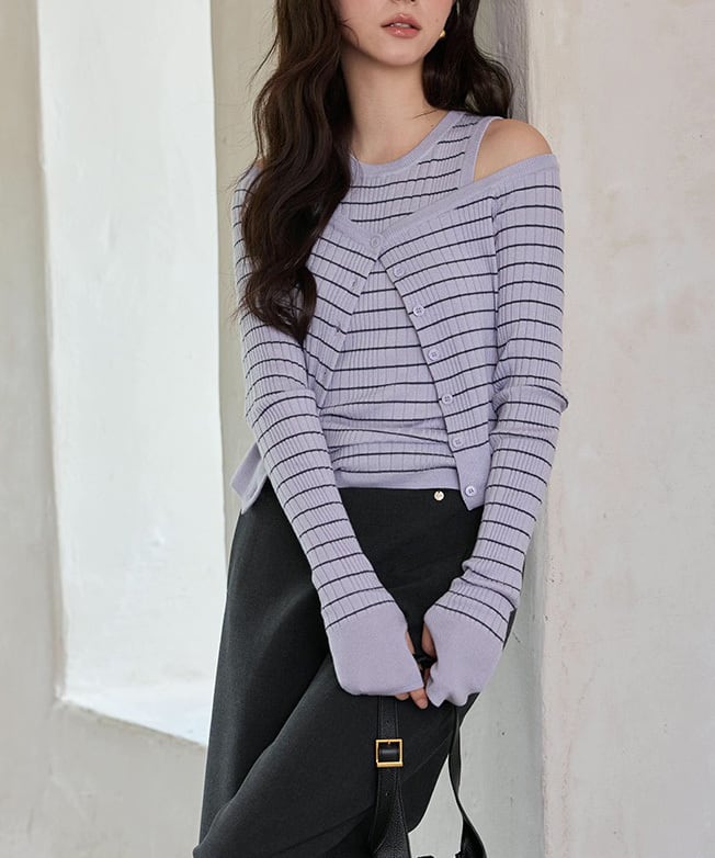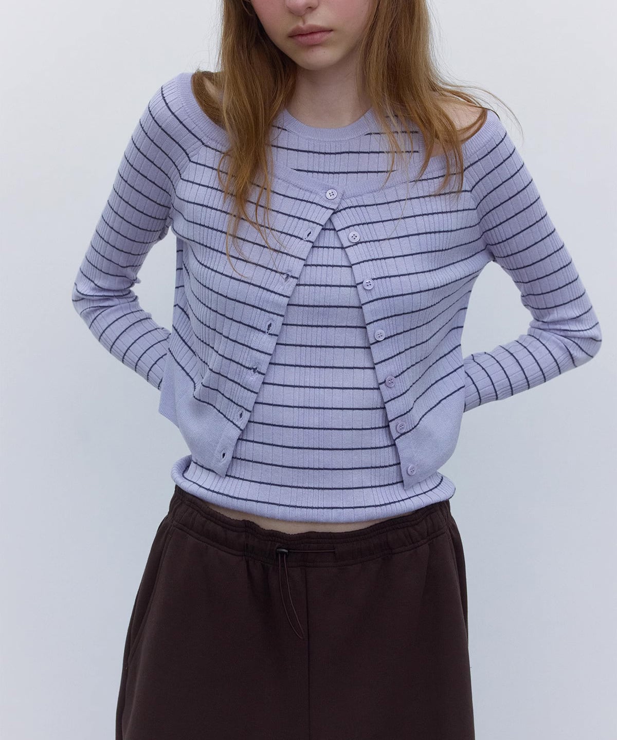 1枚で抜け感を演出するボーダータンクと、シンプルに羽織れるカーディガンのセット。