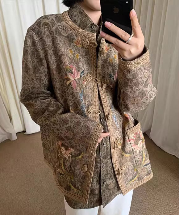 異国情緒漂うチャイナバックルと、レトロなタペストリー調の生地が魅力のジャケット。大人のスタイリングに深みを与える一枚で、デニムと合わせてカジュアルに、ワイドパンツやワンピースに羽織ってクラシカルに着こなせます。