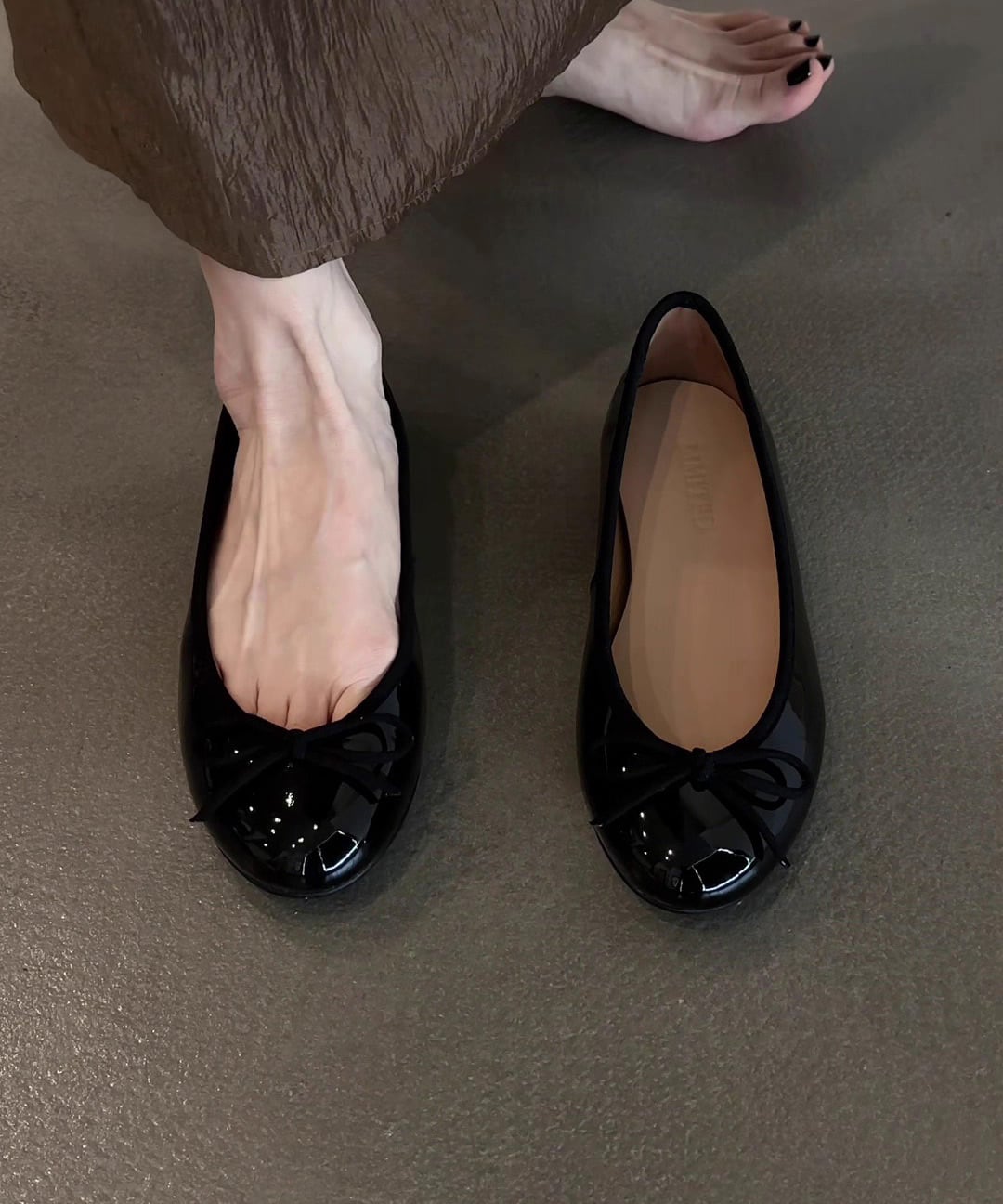 ツヤ感のあるパテント素材を使用したラウンドトゥバレエ。