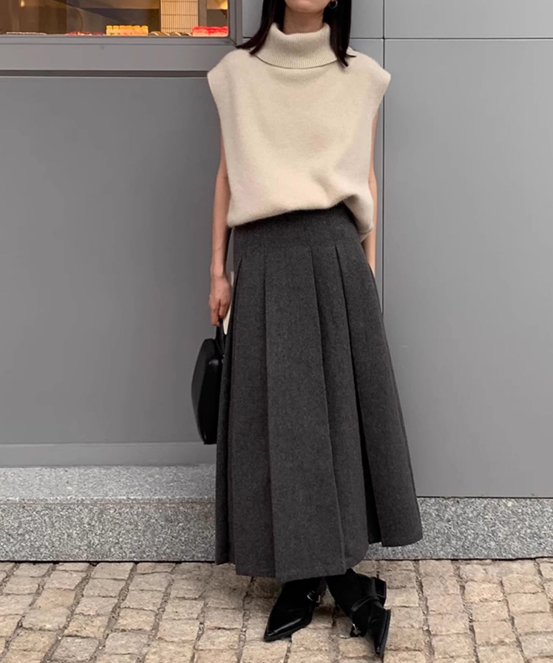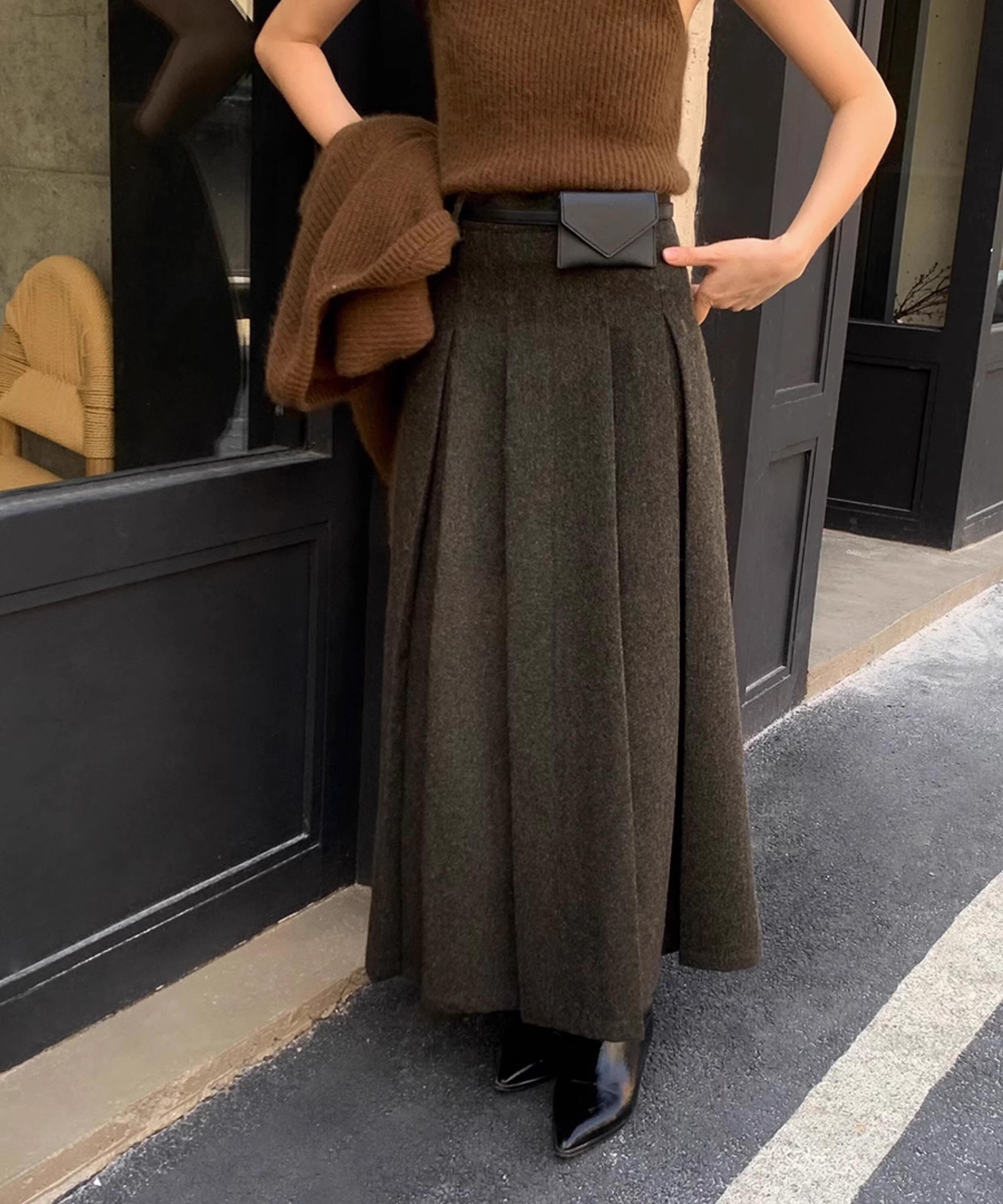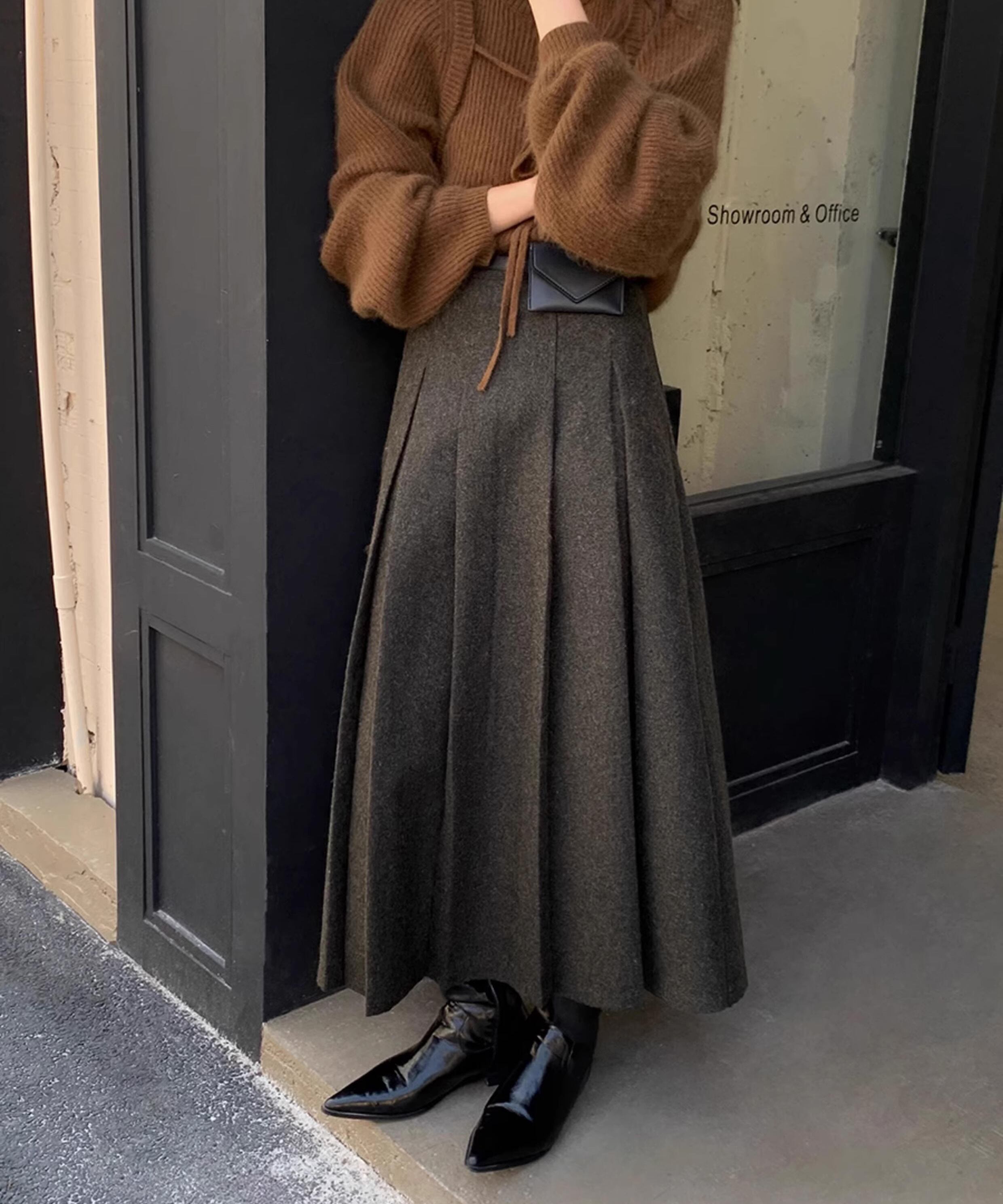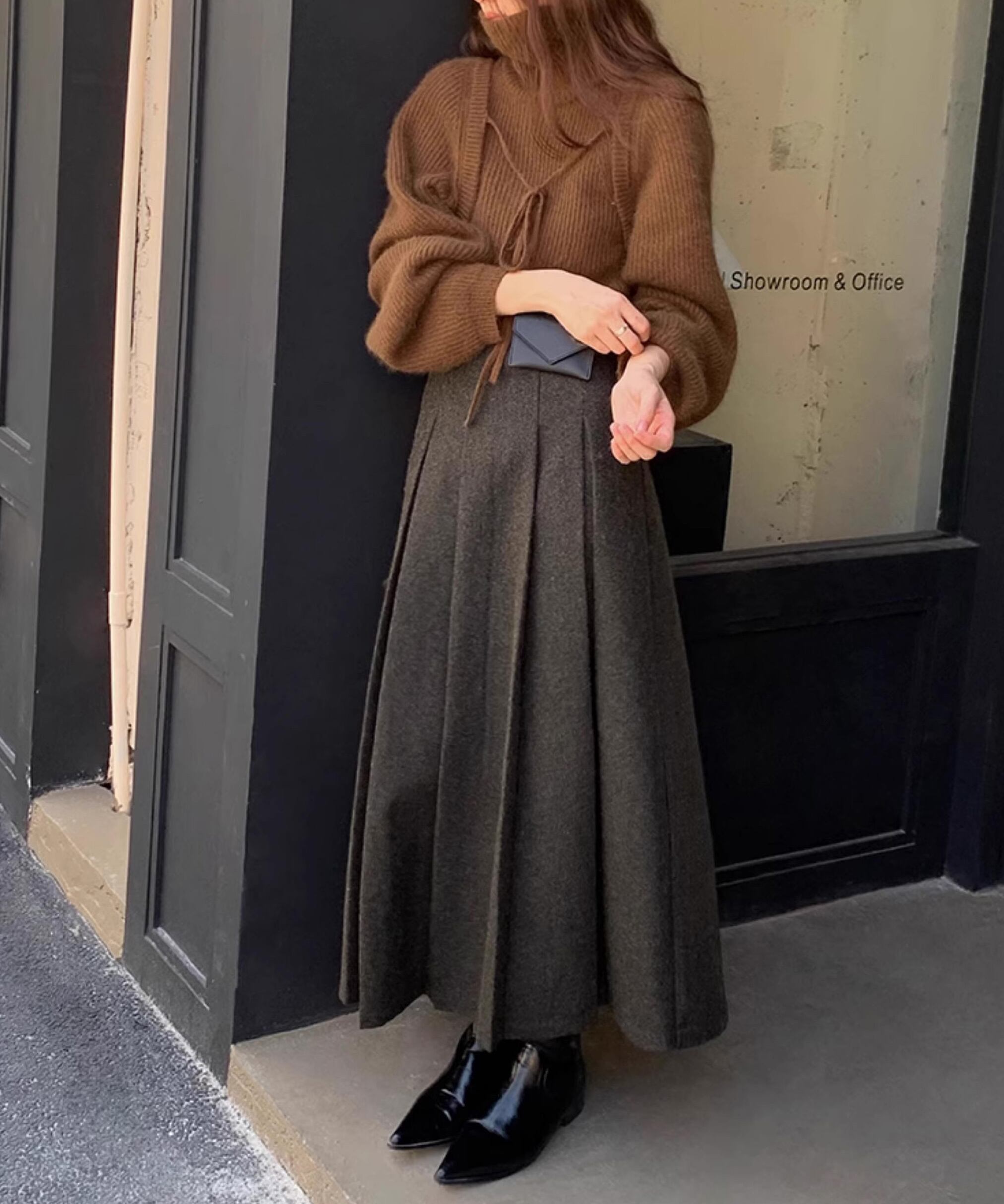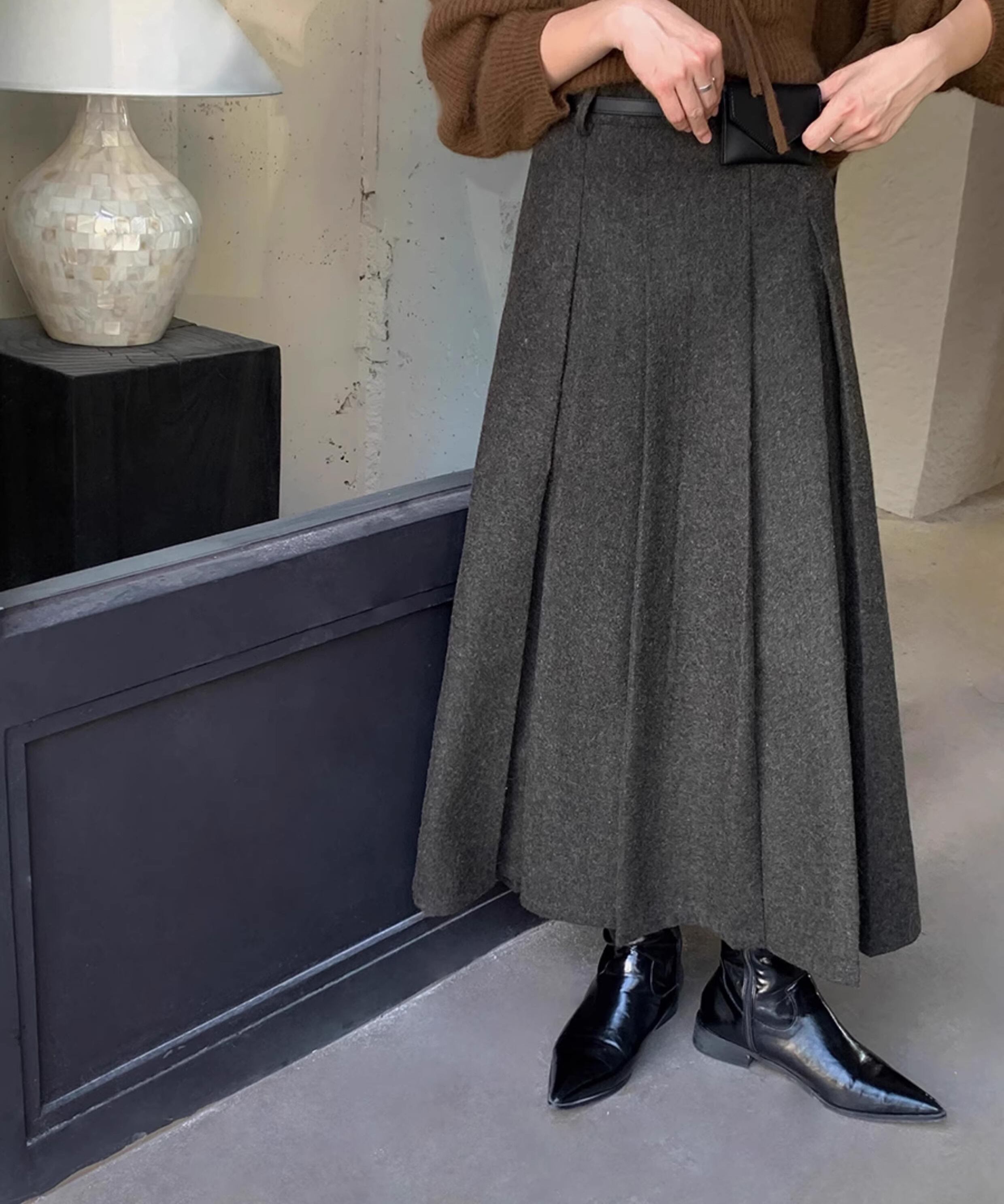 ウール混素材であたたかさもあり、歩くたびに揺れるシルエットがエレガント。ニットやブーツとの相性抜群の冬映えスカート。