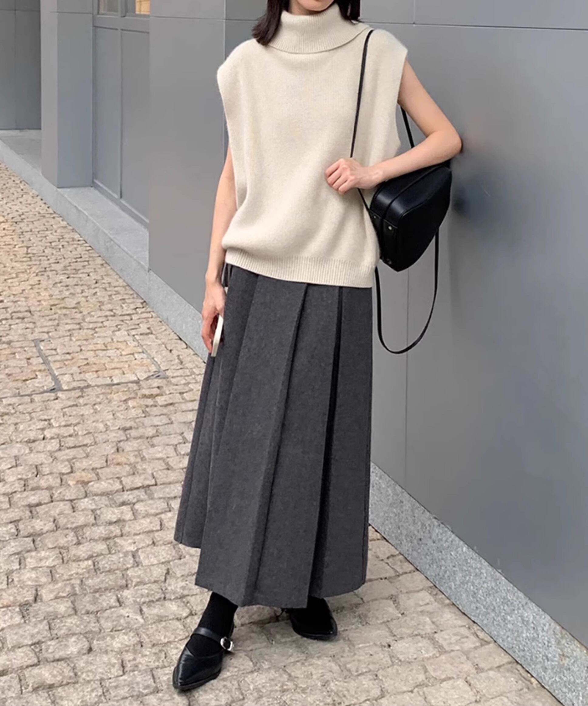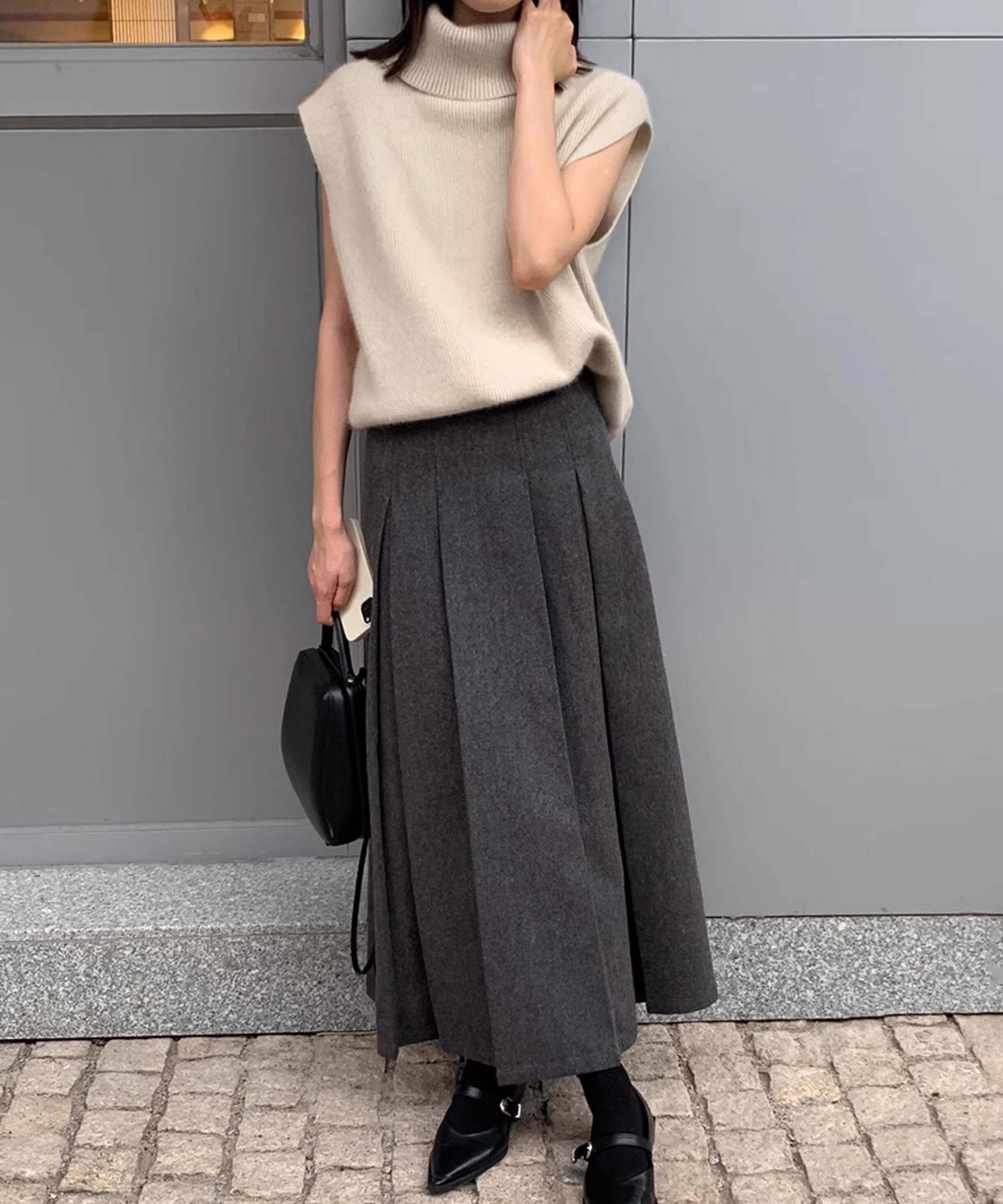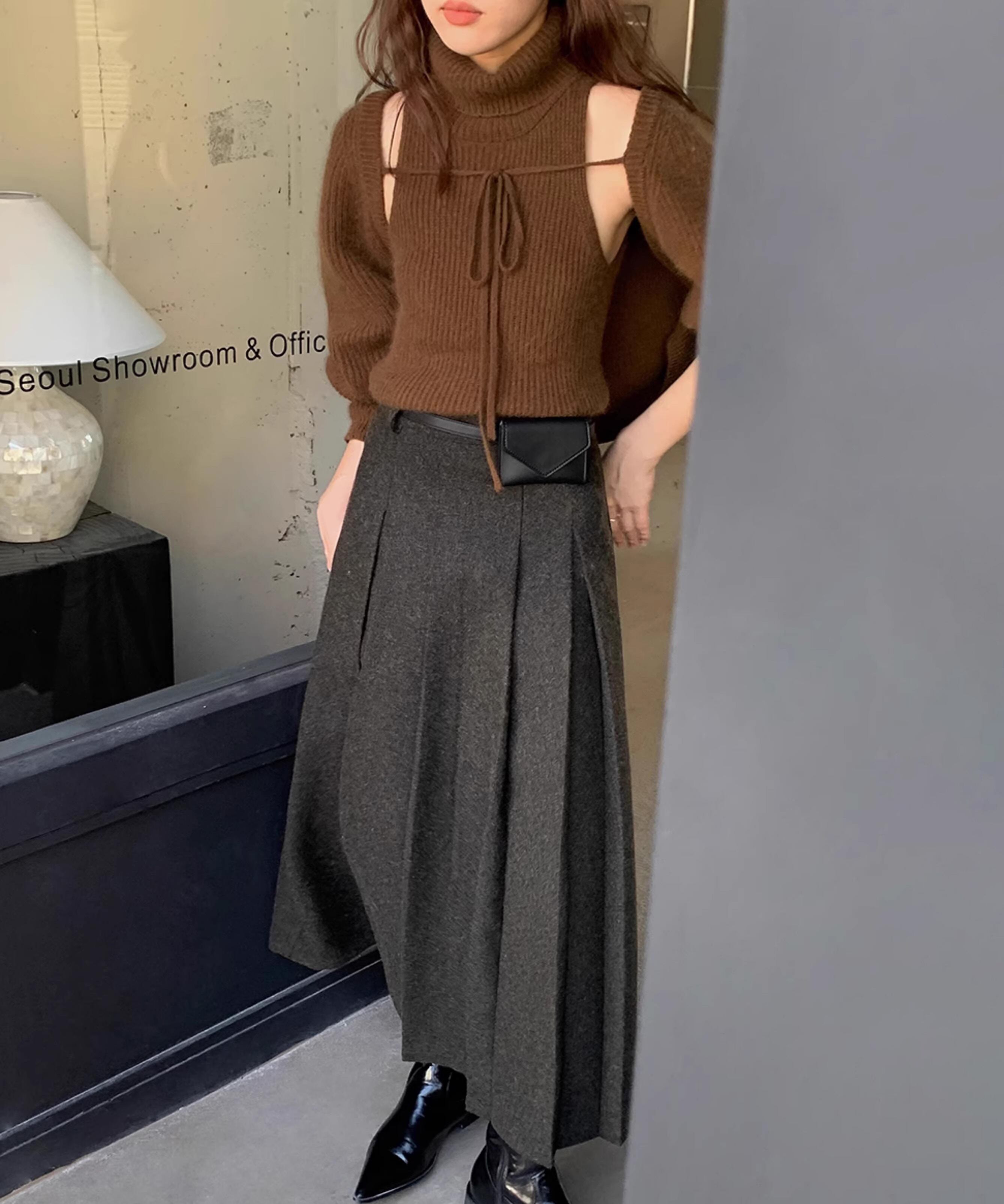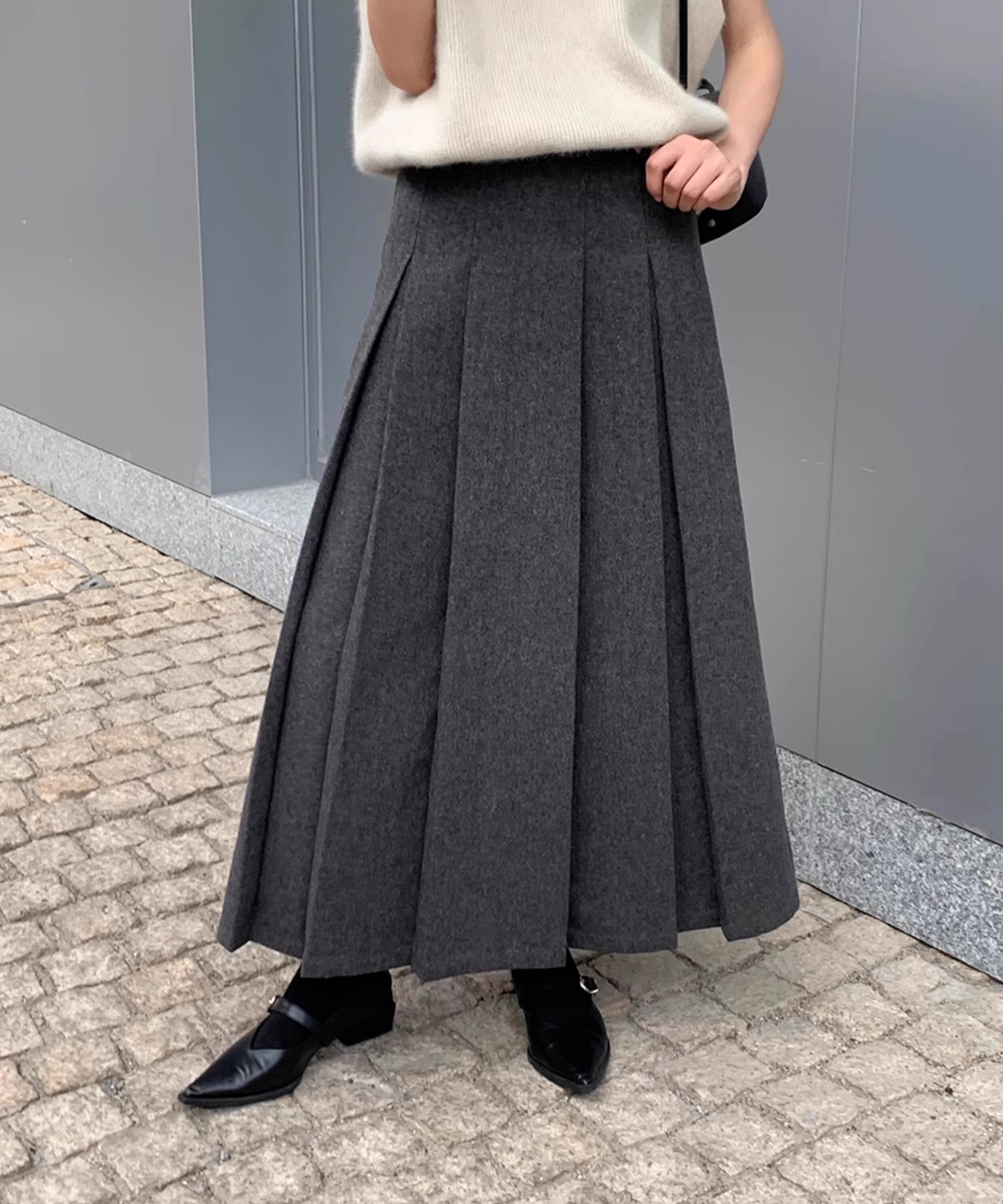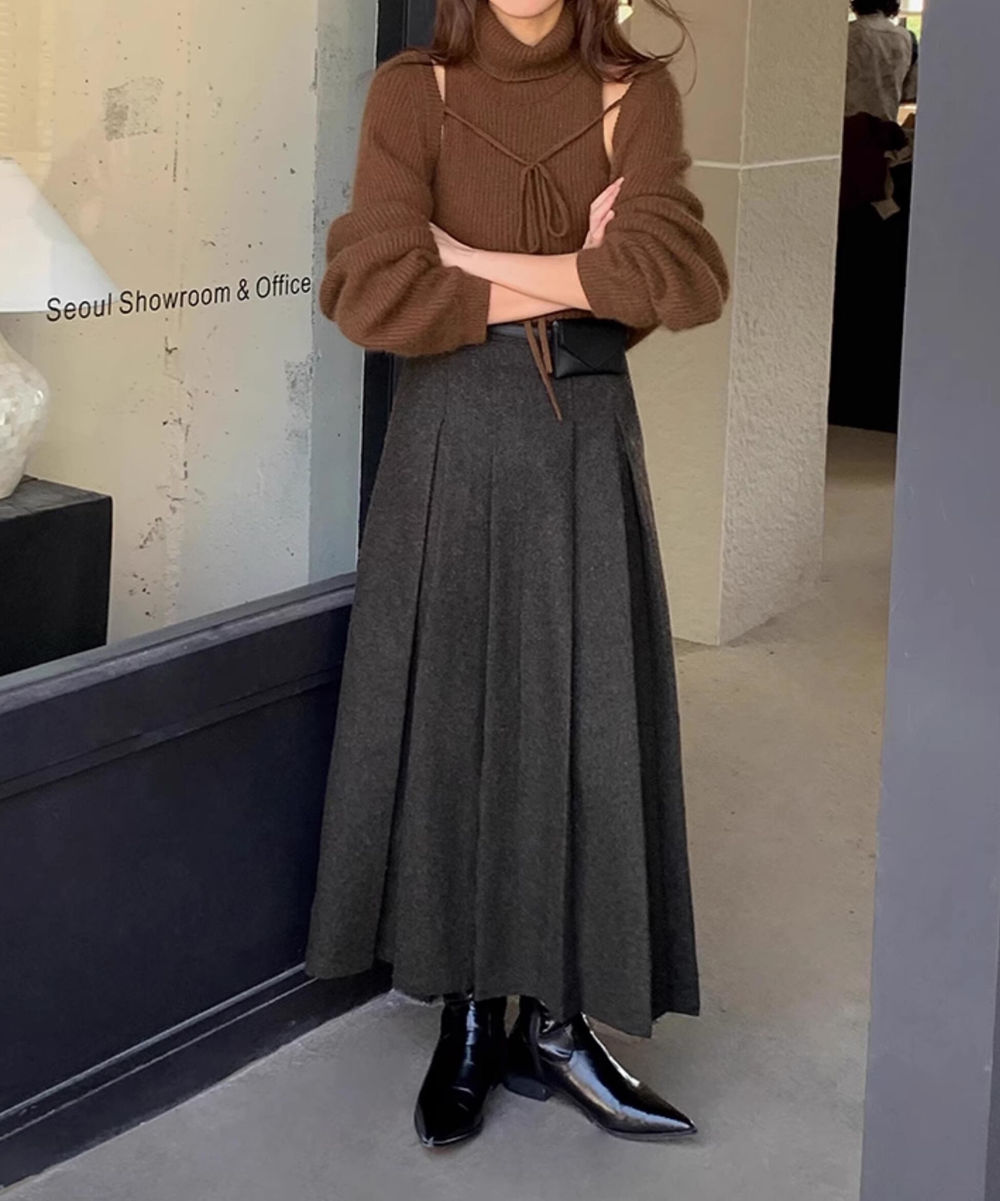 ウール混素材であたたかさもあり、歩くたびに揺れるシルエットがエレガント。ニットやブーツとの相性抜群の冬映えスカート。