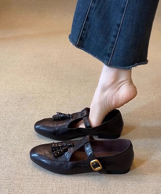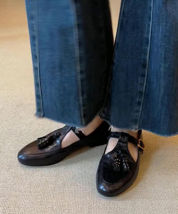 クラシックなTストラップに、繊細なタッセルがアクセント。