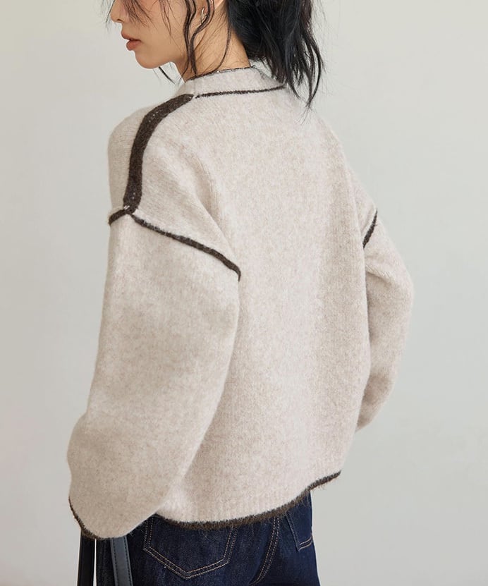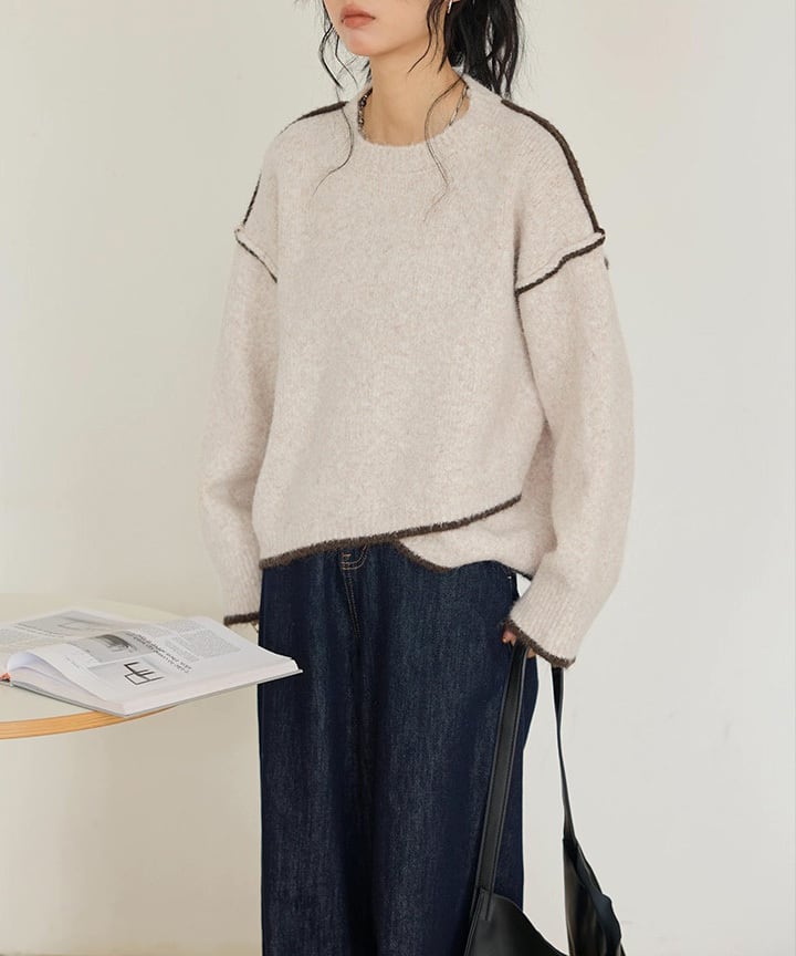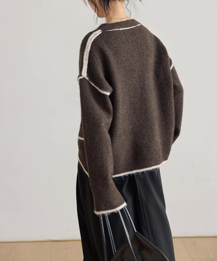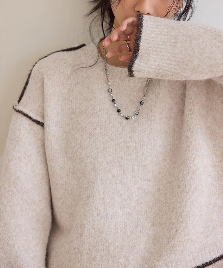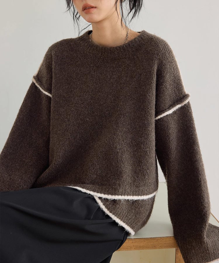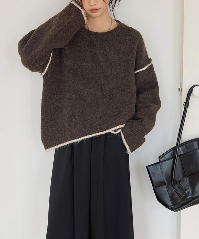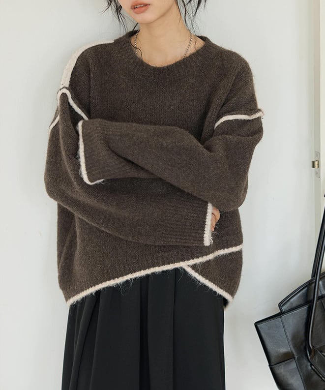 配色デザインが印象的なモダンニット。ゆるめのシルエットで抜け感を演出しながらも、リブ袖で上品に。1枚で映える主役トップスです。