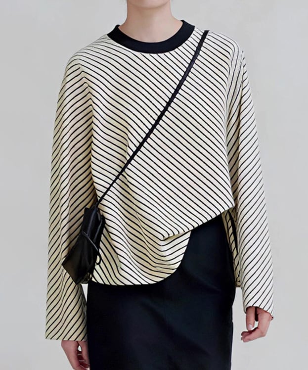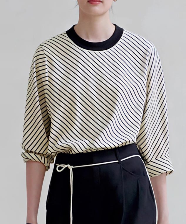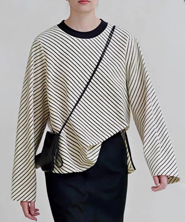 抜け感のあるロング丈で、斜めストライプボーダーでも子どもっぽくならない。 スリット入りで動きやすく、1枚で旬のスタイルが完成します。 ジャケットやベストのインにもぴったり