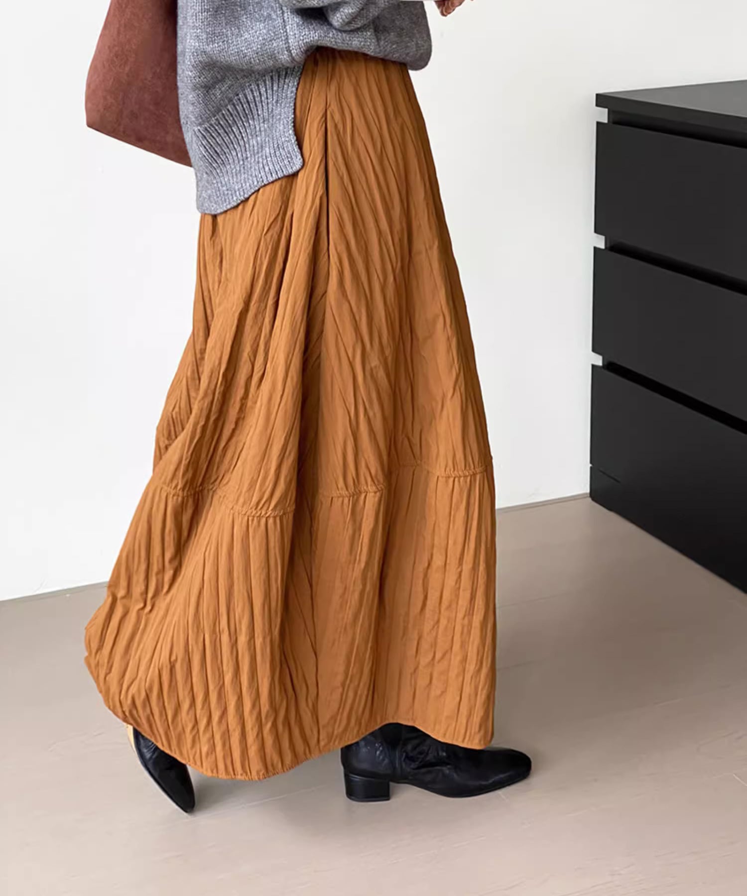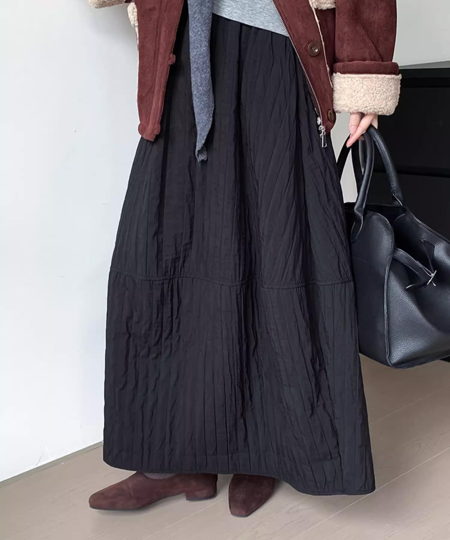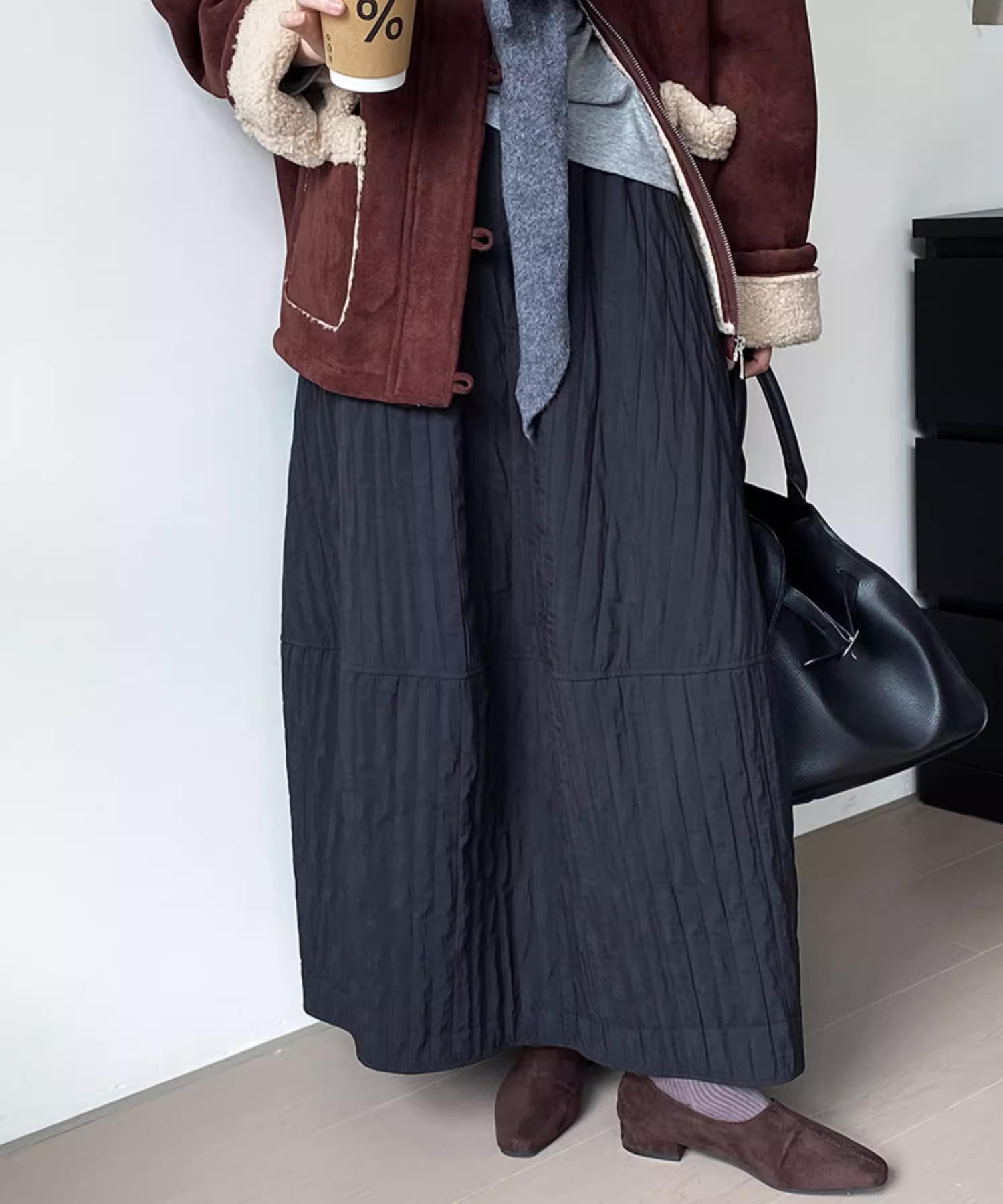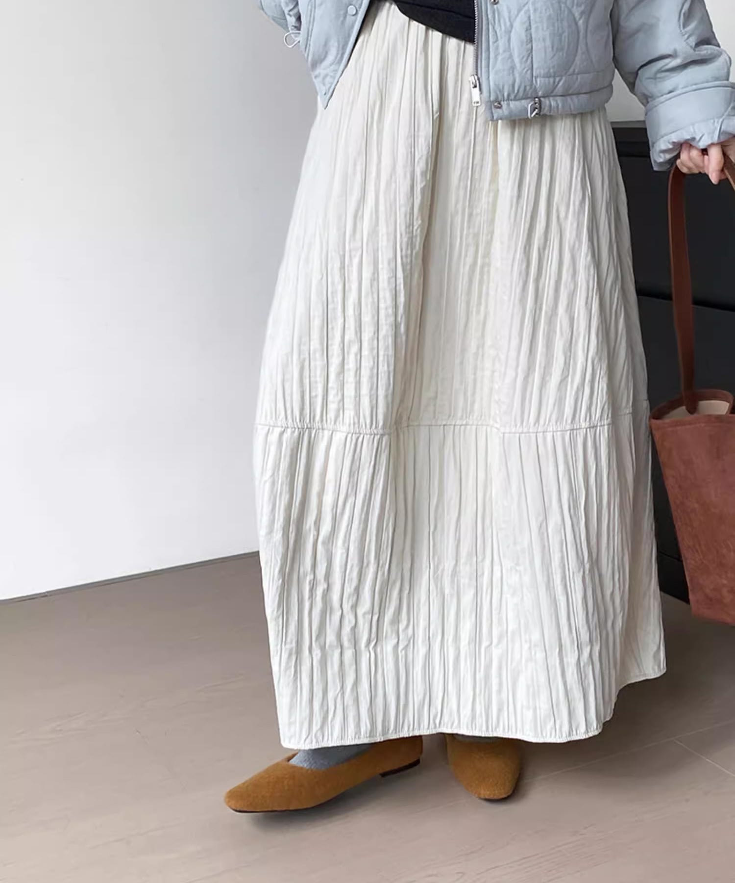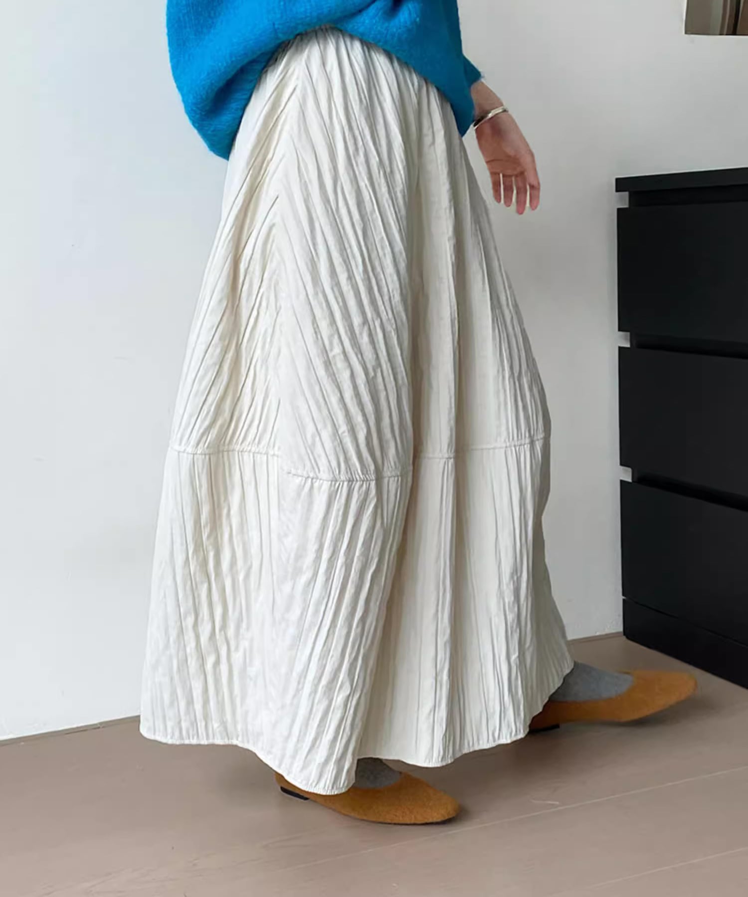 エンボス加工による立体的な表情が印象的。切り替えデザインが動くたびに美しいラインを演出します。ウエストはすっきり見せながらも履き心地はラクちん。オンオフ問わず使える万能アイテムです。