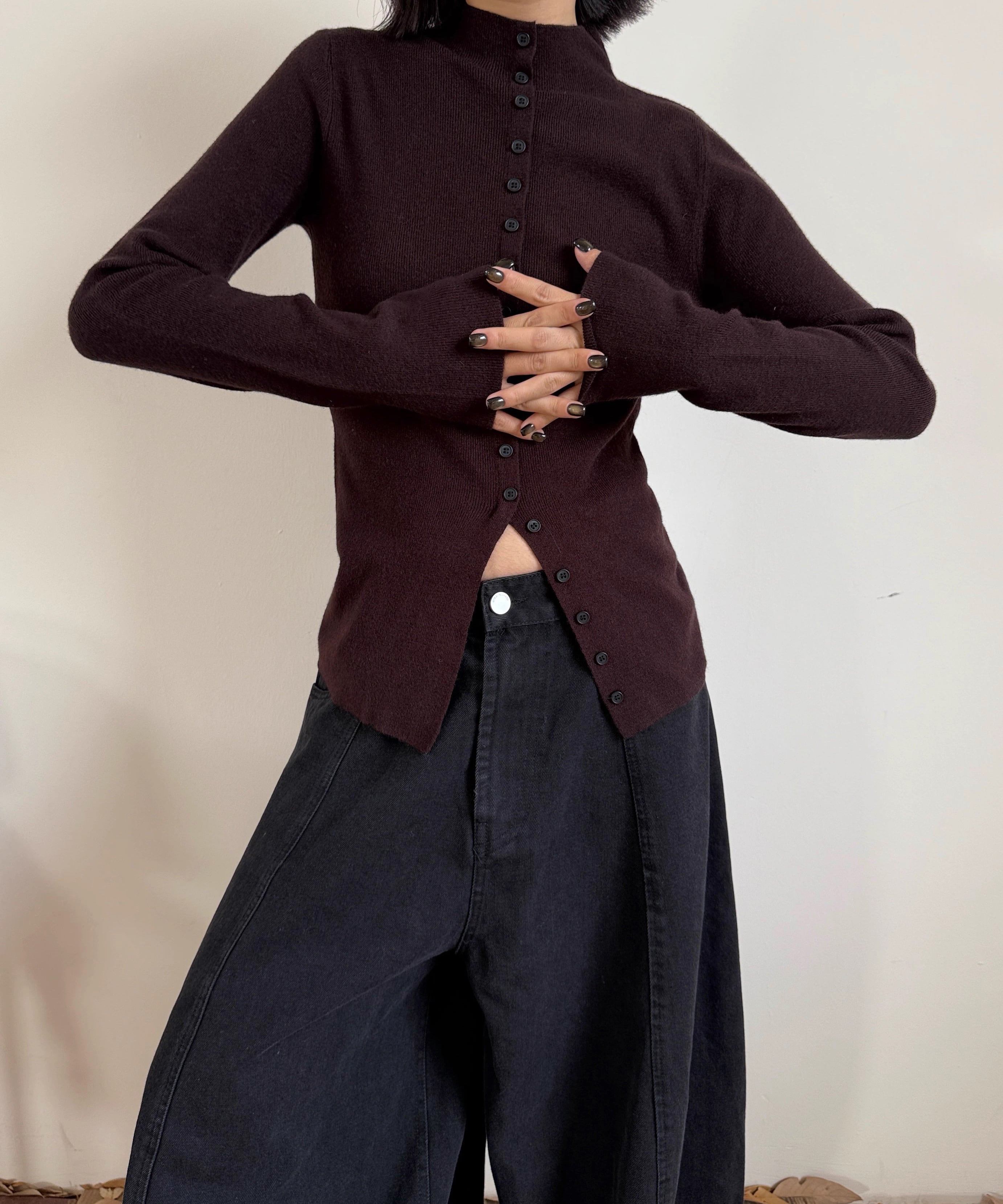 前面に入ったスリットがポイントのタートルネックニット。
