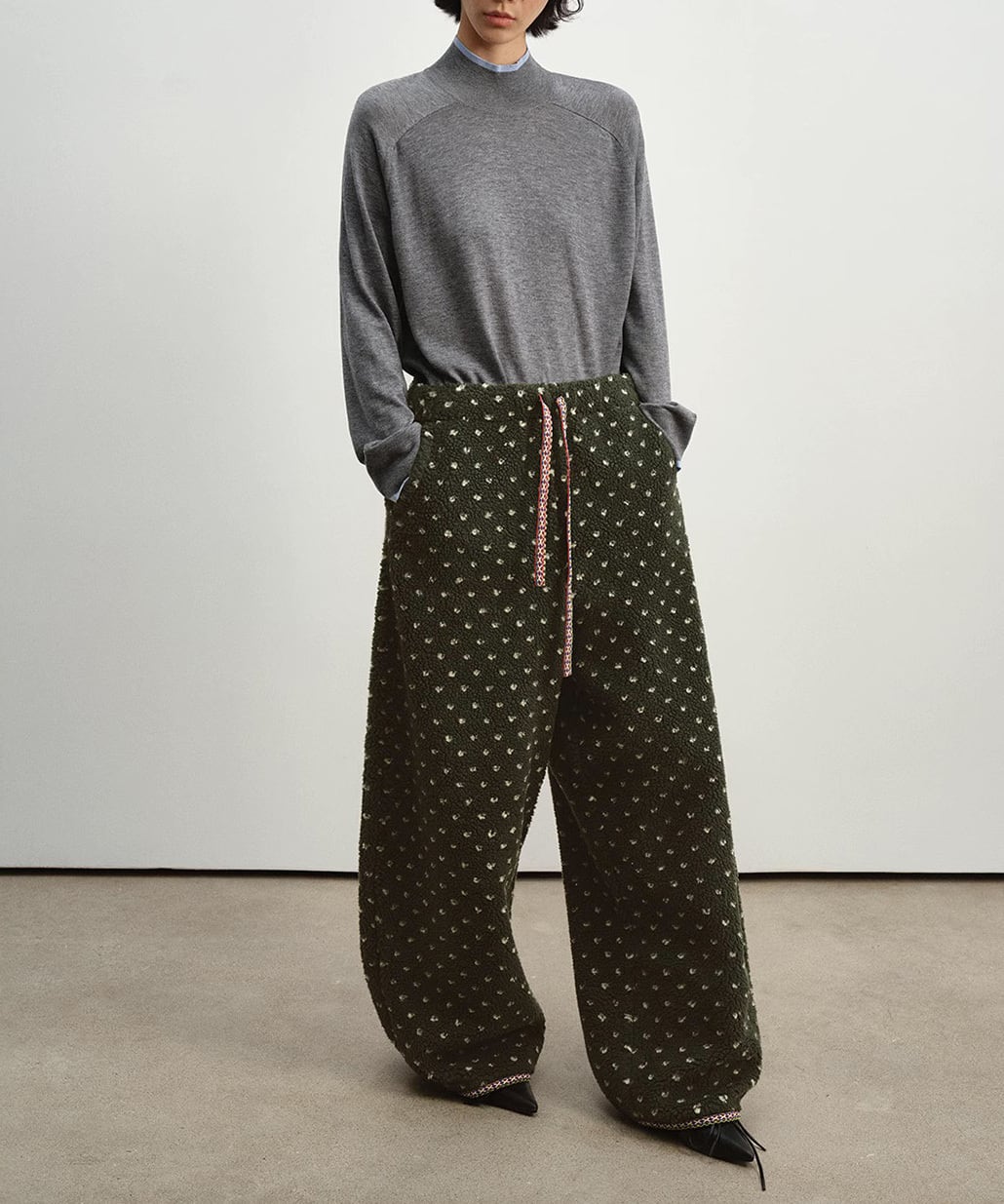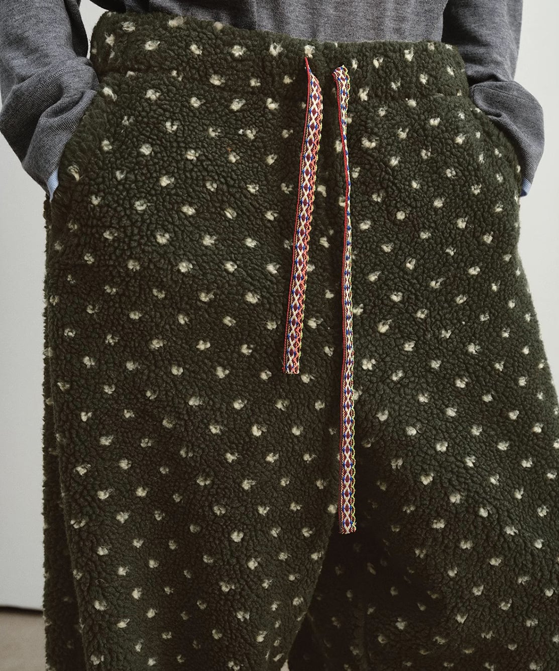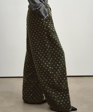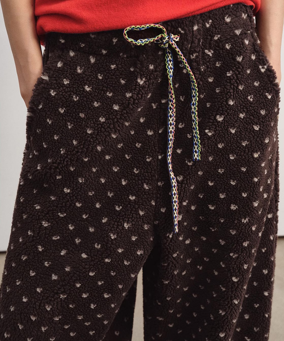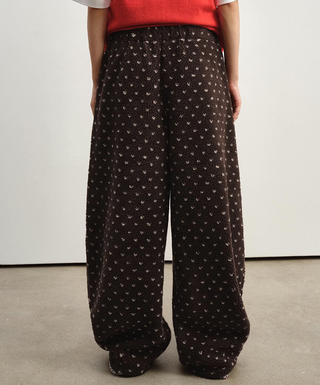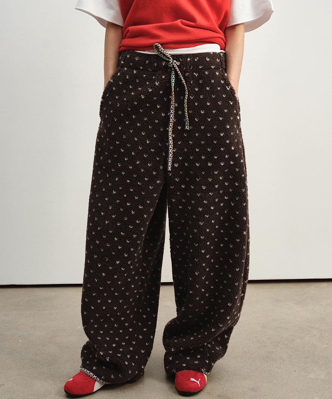ふんわりとしたボア素材にハート柄を散りばめた、存在感のあるデザインパンツ。 柔らかい質感と立体感のあるシルエットが、着こなしに可愛さと遊び心をプラスしてくれます。