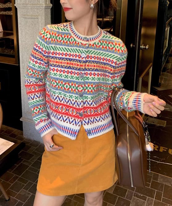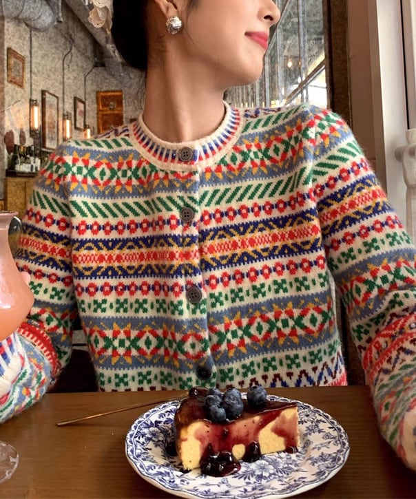 存在感のあるカラフルなジャガード柄が目を惹くニットカーディガン。柔らかな肌触りとほどよい厚みで、季節の変わり目から冬まで長く活躍します。羽織るだけでコーデの主役になるデザイン性と、デイリーに使いやすい着心地の良さを兼ね備えた一枚。シンプルなボトムスに合わせるだけで華やかな印象に。