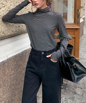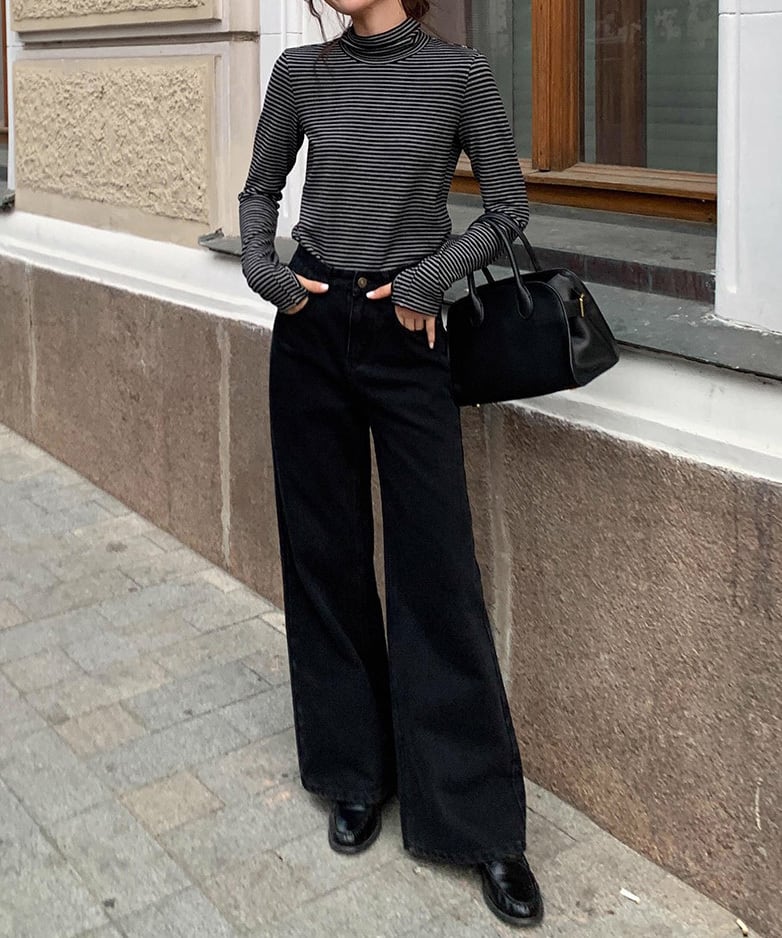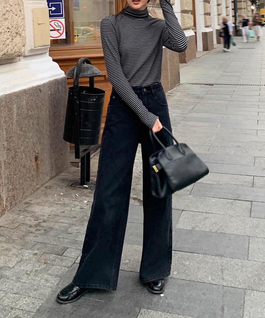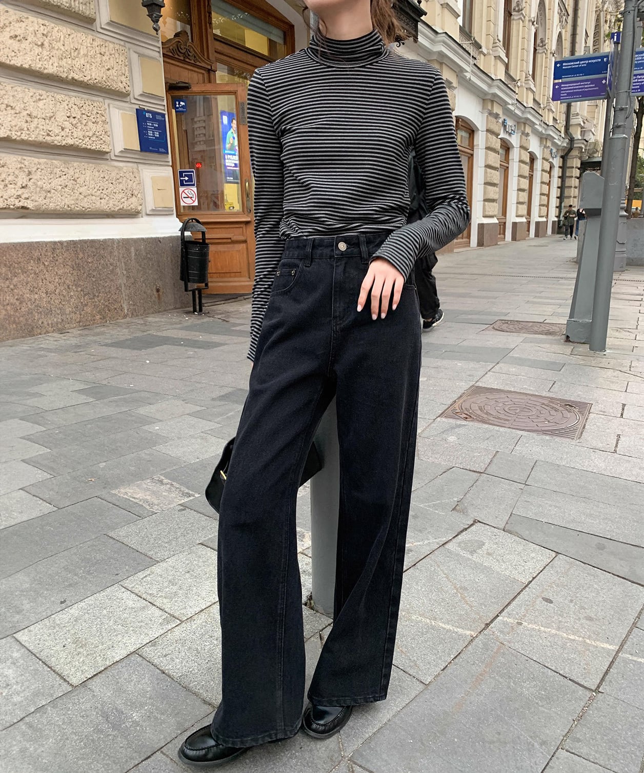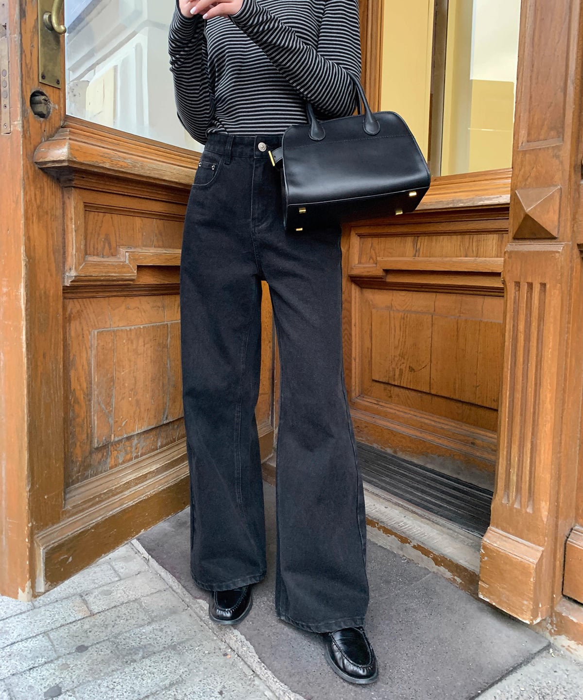 脚をすっきり長く見せるハイウエストのブラックデニム。柔らかめの生地で動きやすく、日常に使いやすい一本です。カジュアルにもきれいめにも合わせやすいシンプルなデザインで、大人のワードローブに一本あると便利な定番デニム。