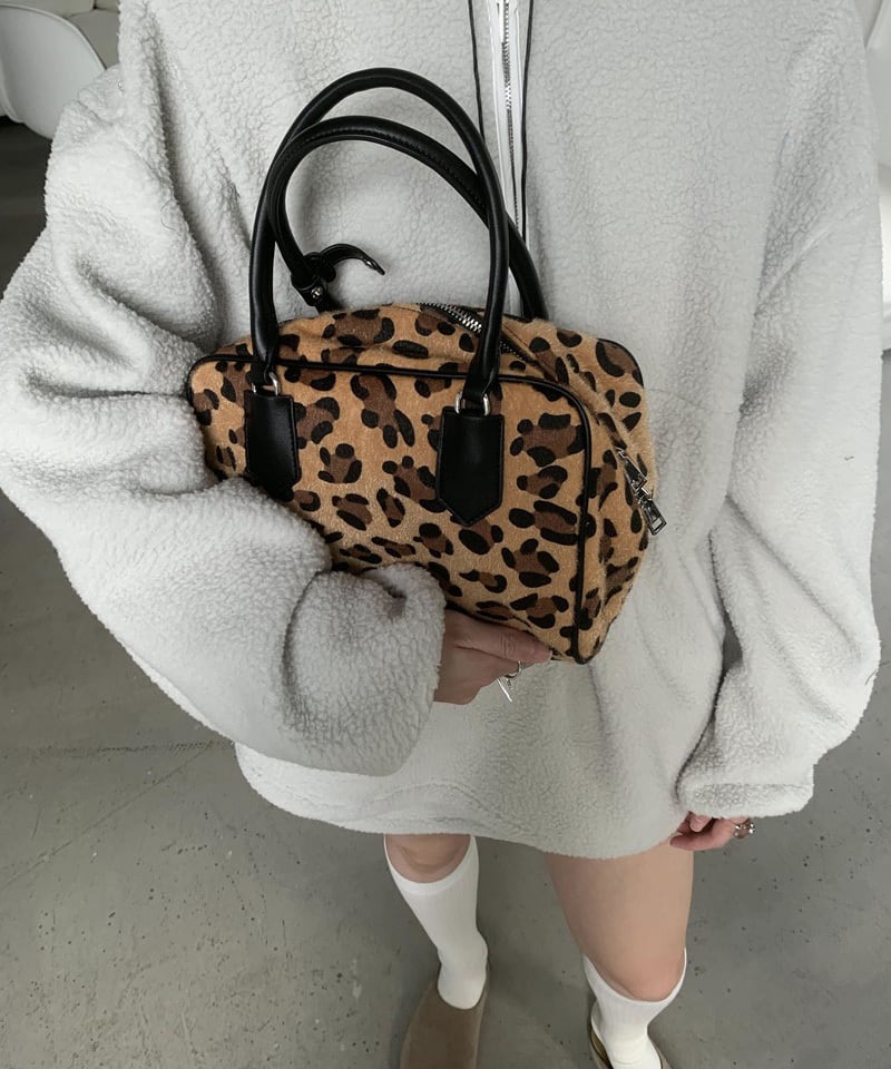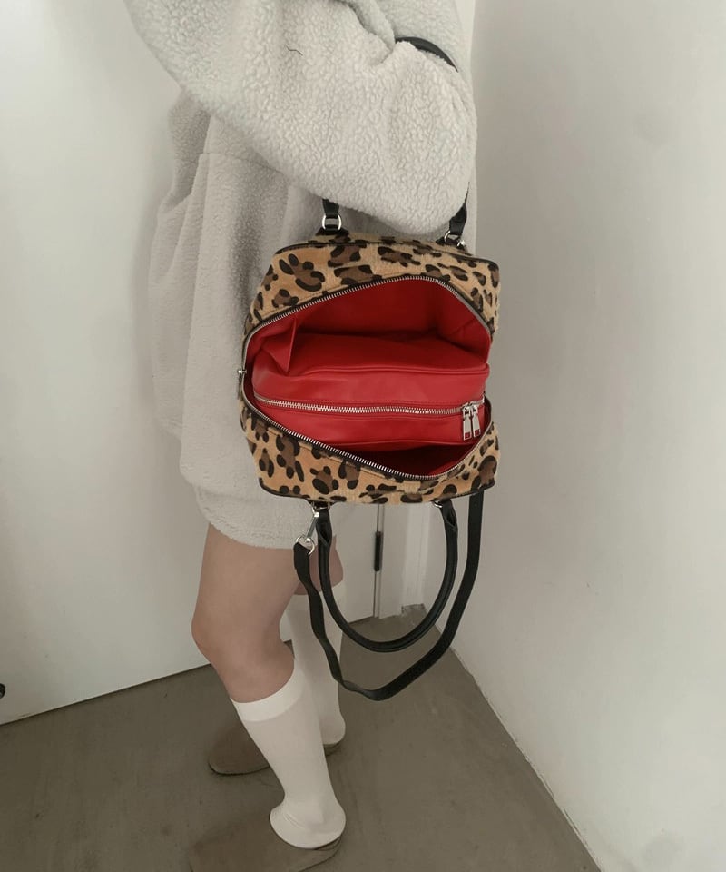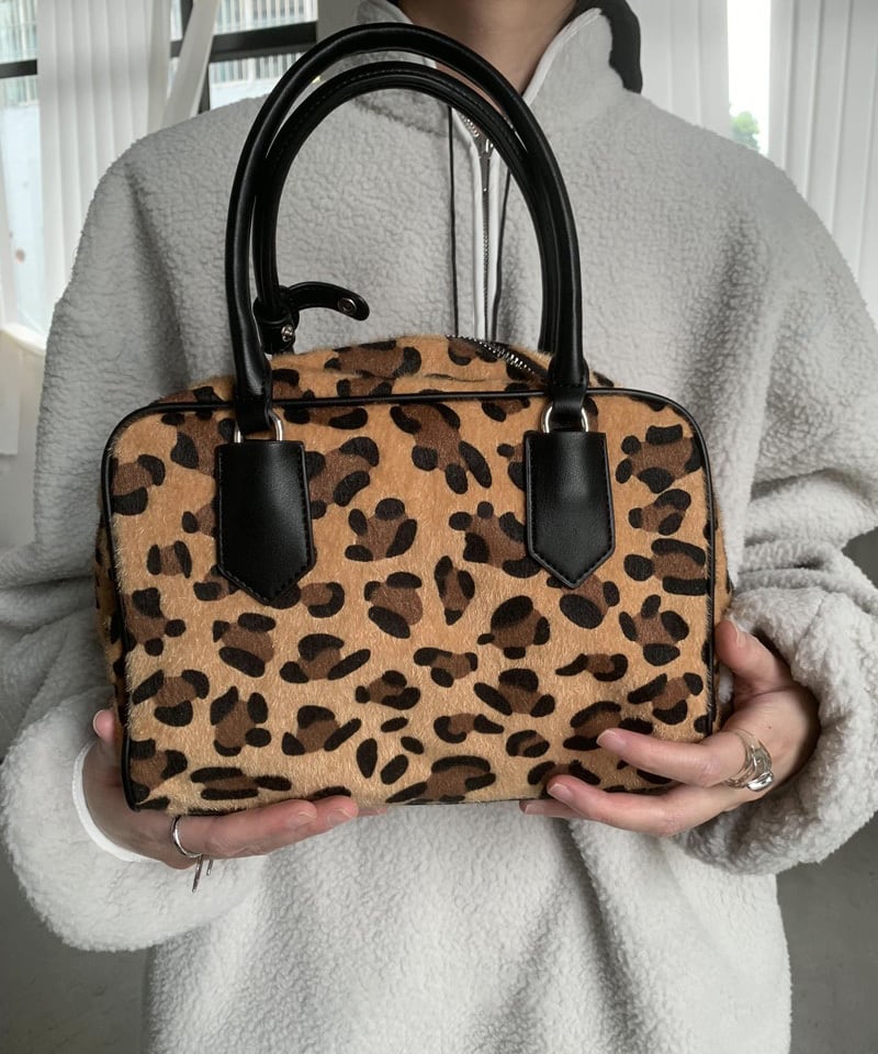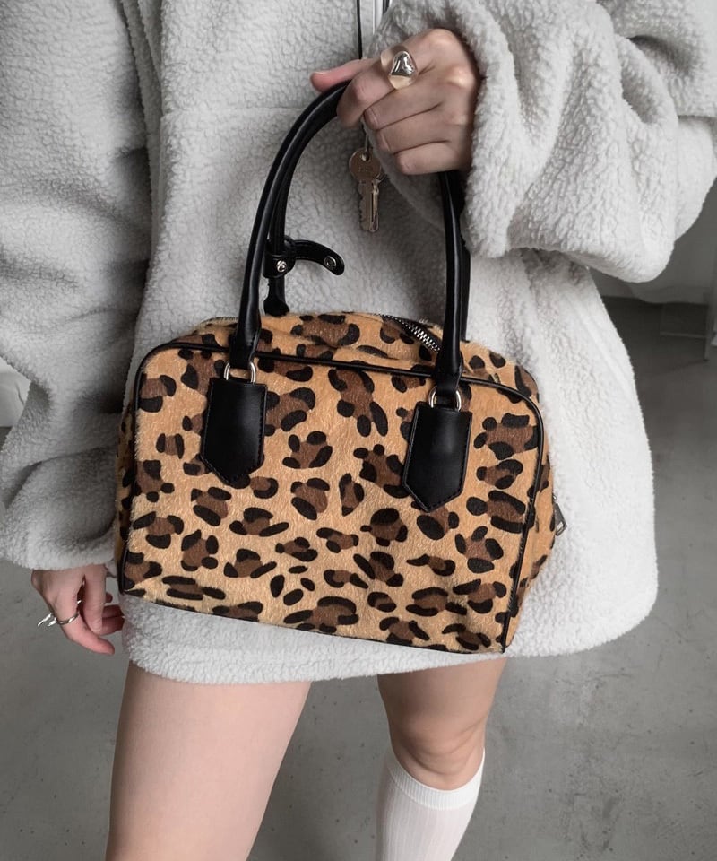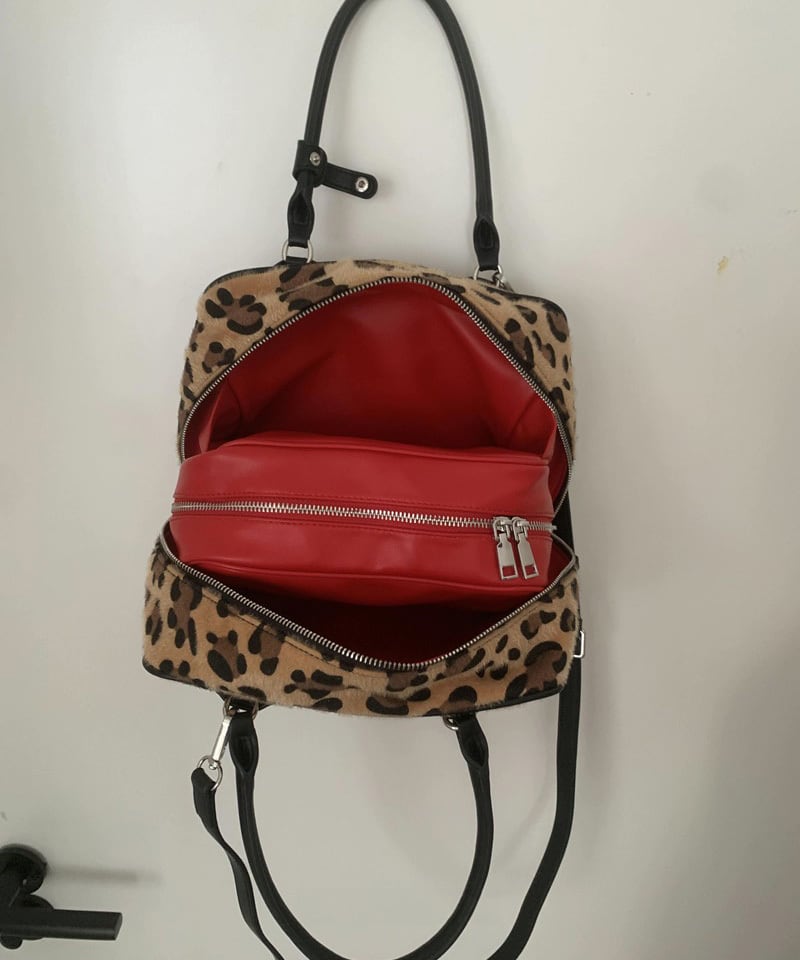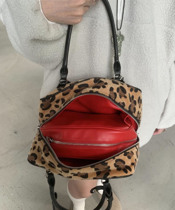 鮮やかな赤のライナーが印象的な、レオパード柄の2wayハンドバッグ。