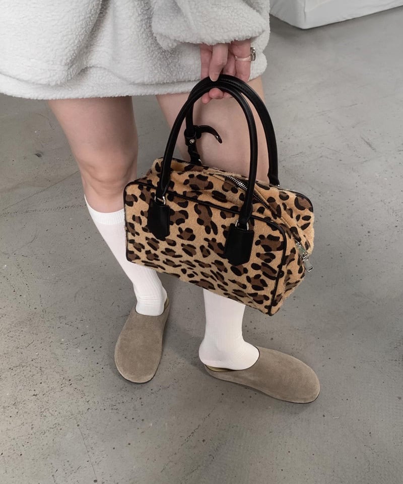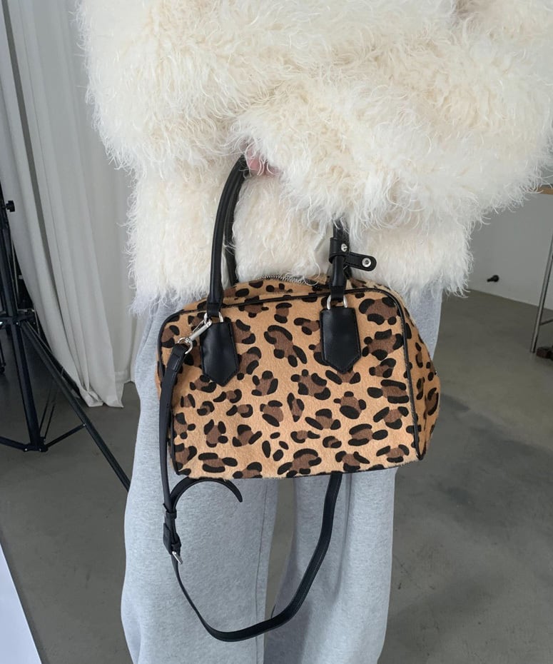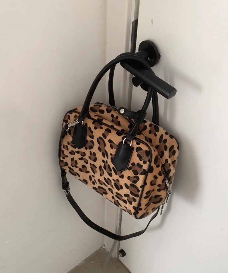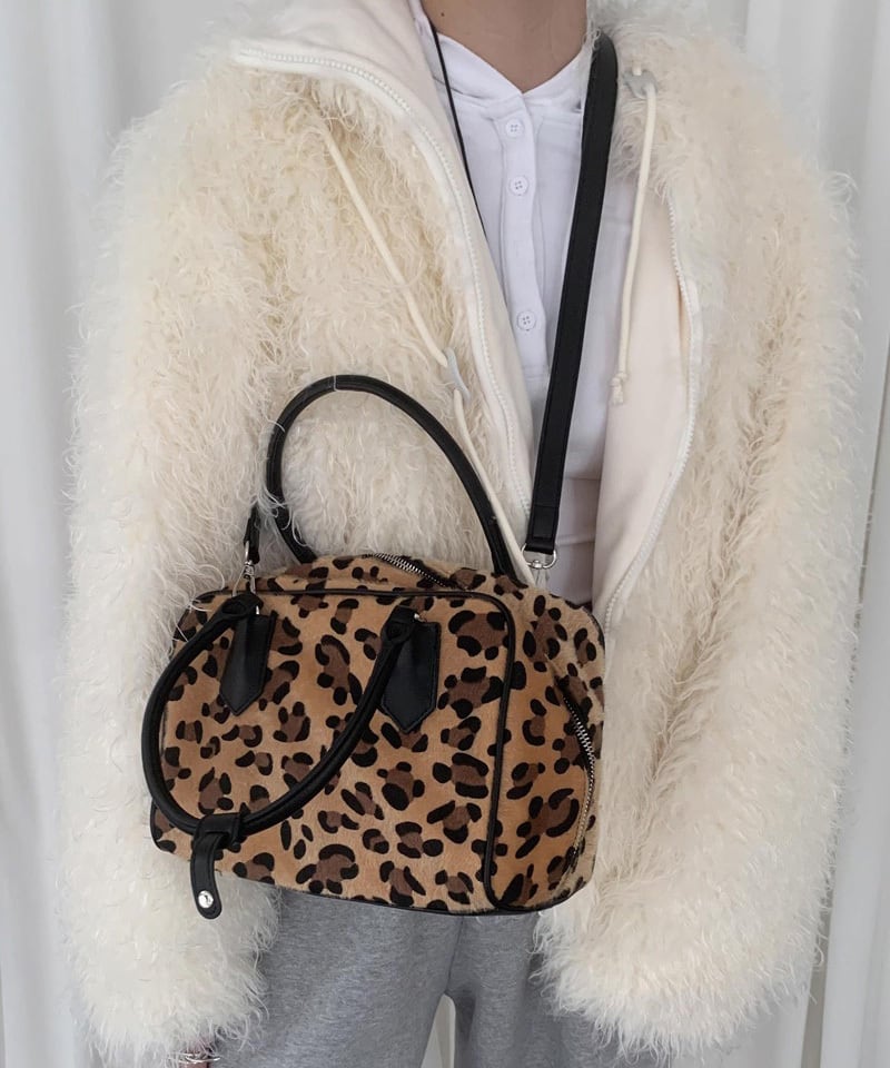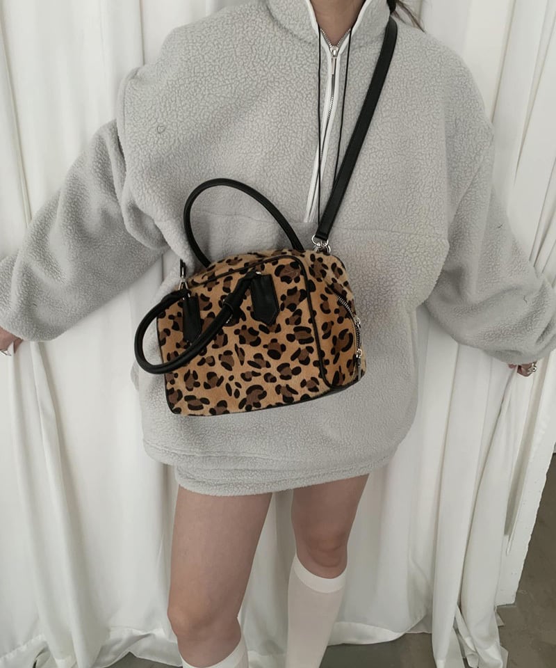 鮮やかな赤のライナーが印象的な、レオパード柄の2wayハンドバッグ。