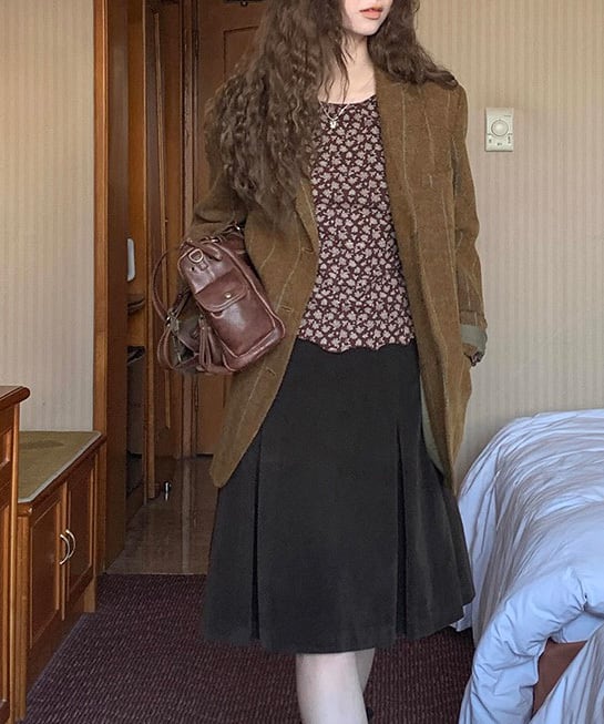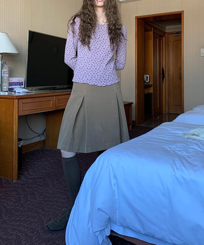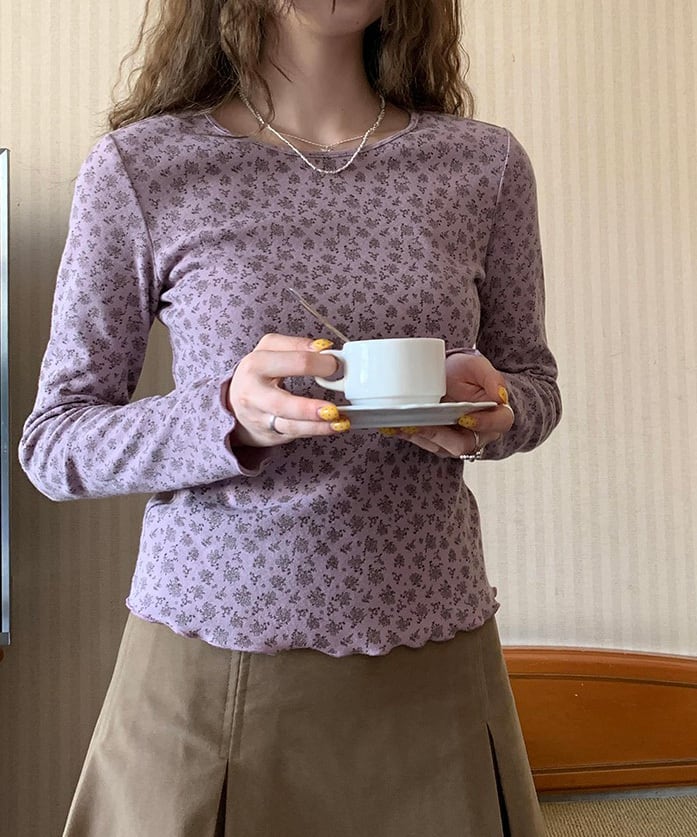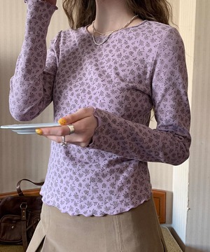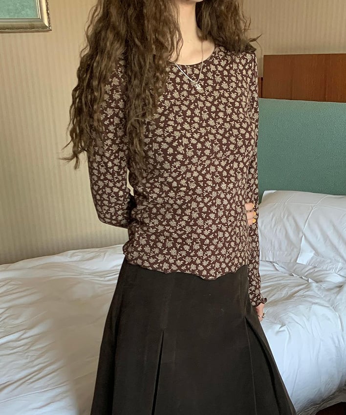 小花柄がレトロ可愛い長袖カットソー。伸びの良い柔らかな素材で、一枚ではもちろん、ニットやジャケットのインナーにも最適。甘さ控えめのカラーリングで大人でも取り入れやすく、季節問わず着回せる万能アイテム。コーデのアクセントにぴったり。