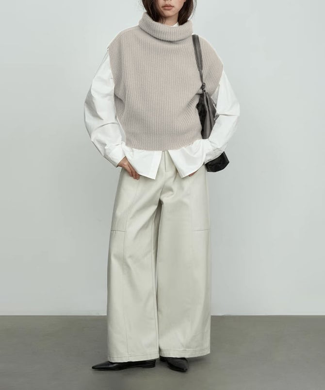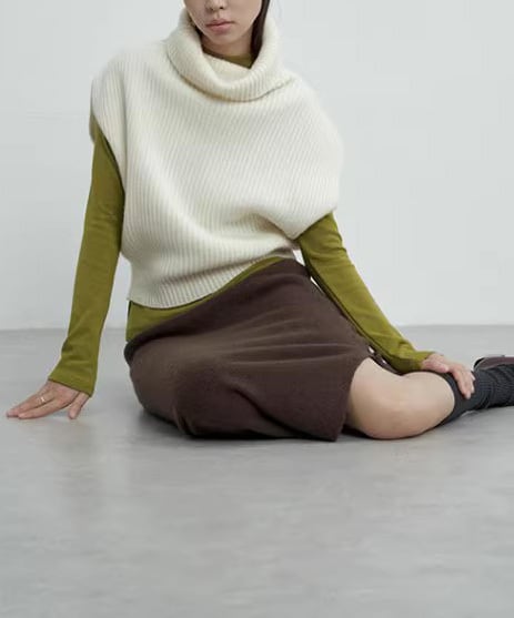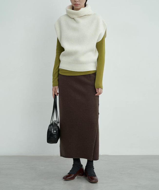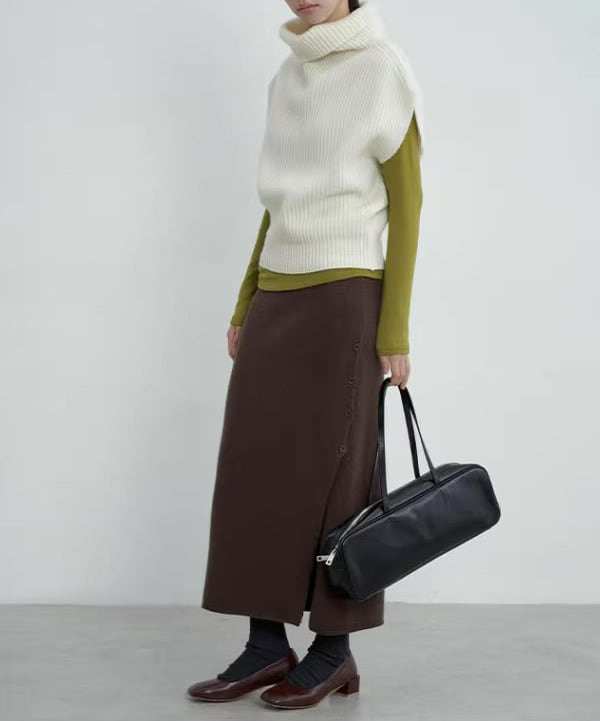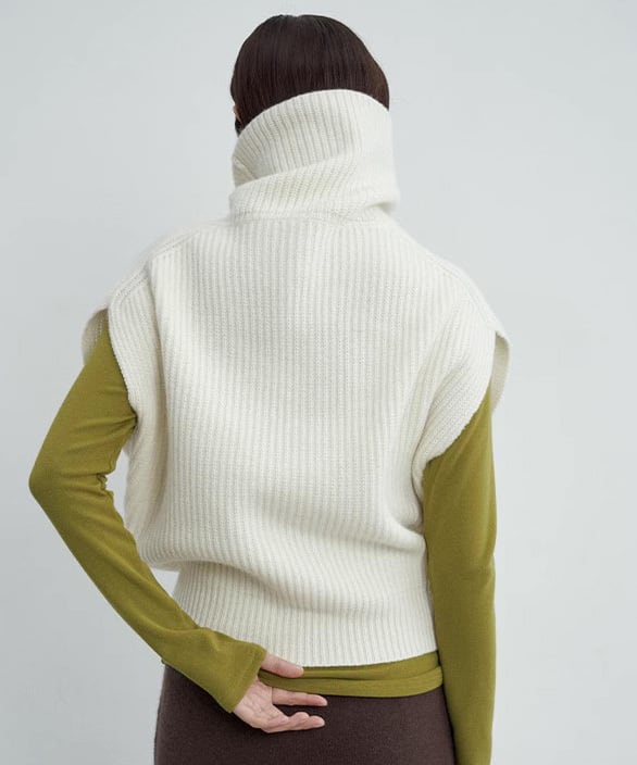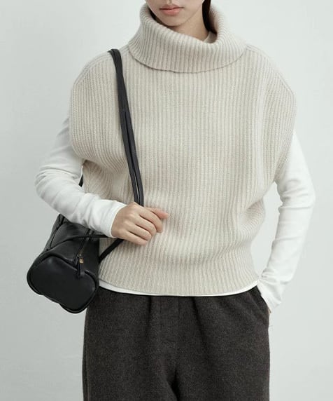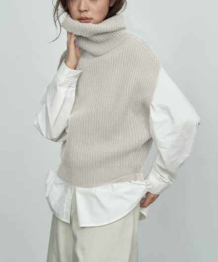 ハイネックが首元までしっかり暖かく、シンプルなシャツやロンTに重ねるだけで即お洒落に。