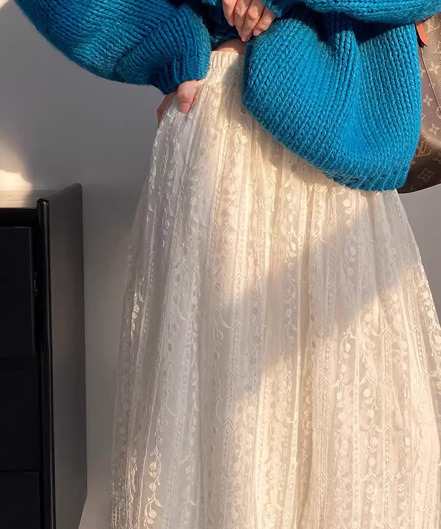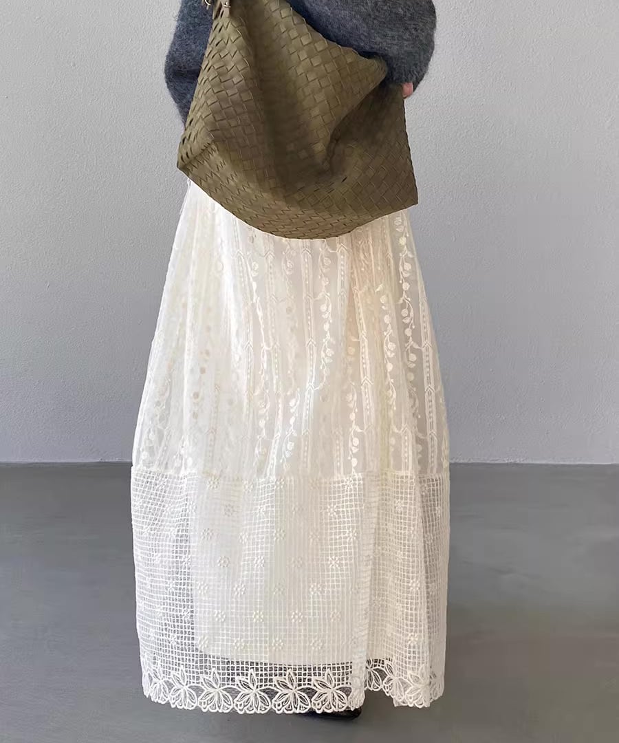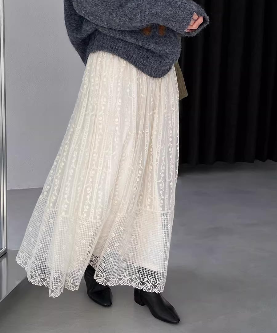 繊細なレース素材を贅沢に使用した、女性らしいフレアロングスカート。