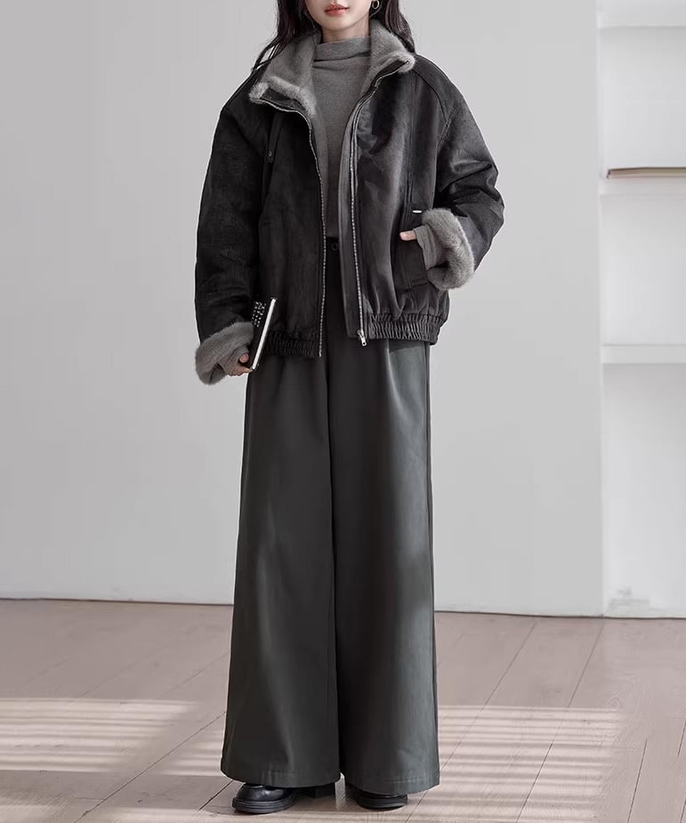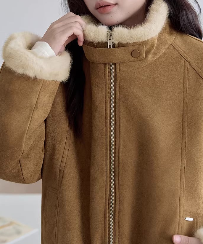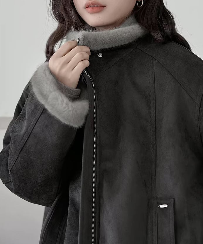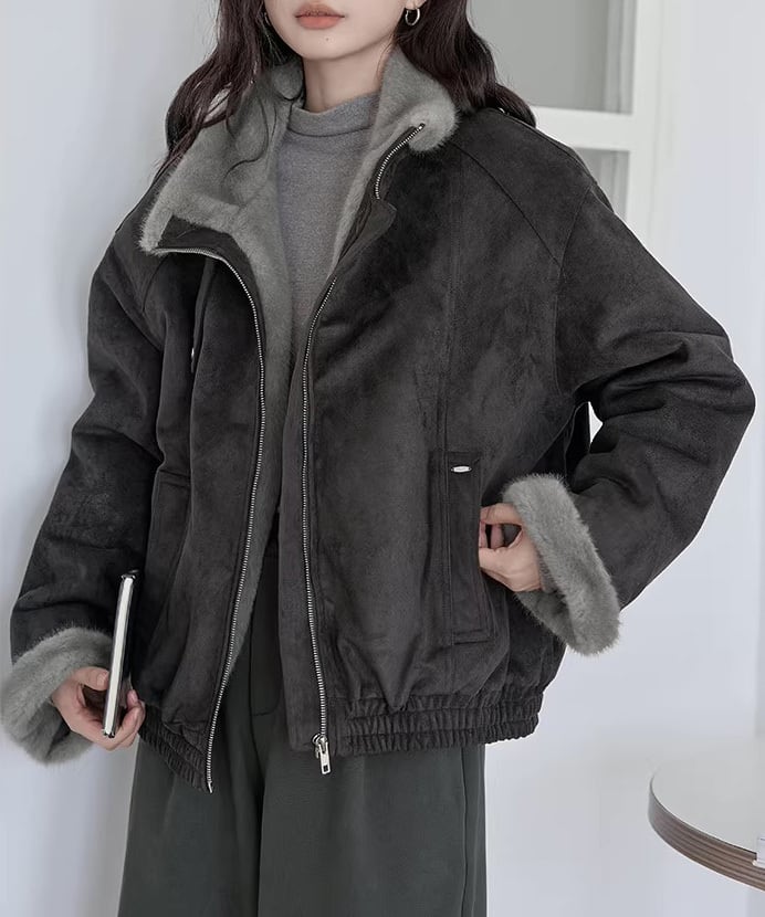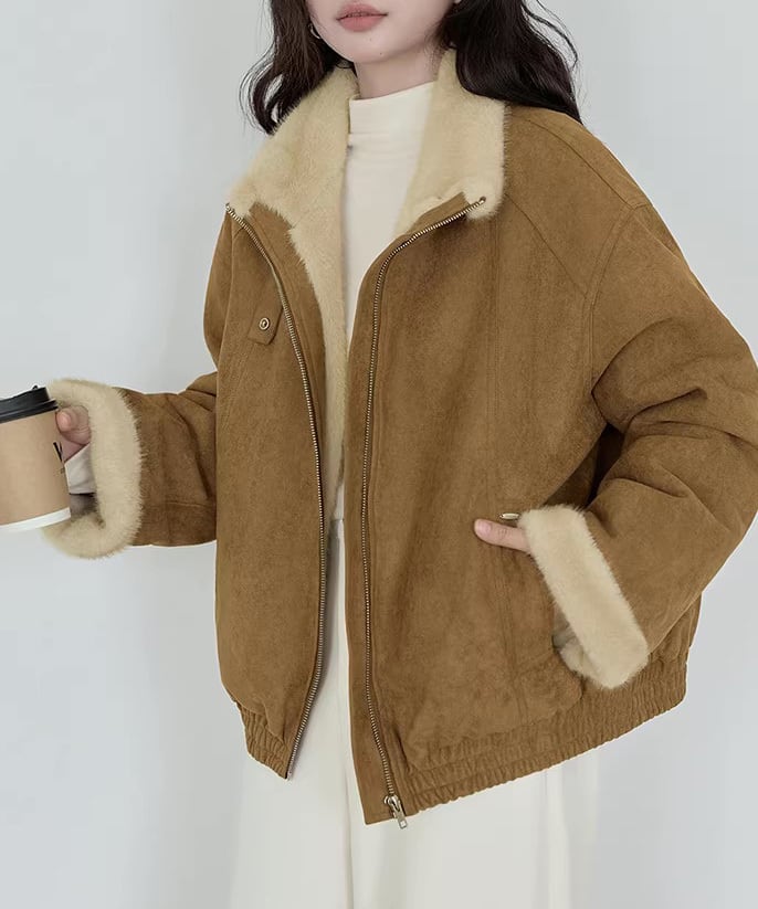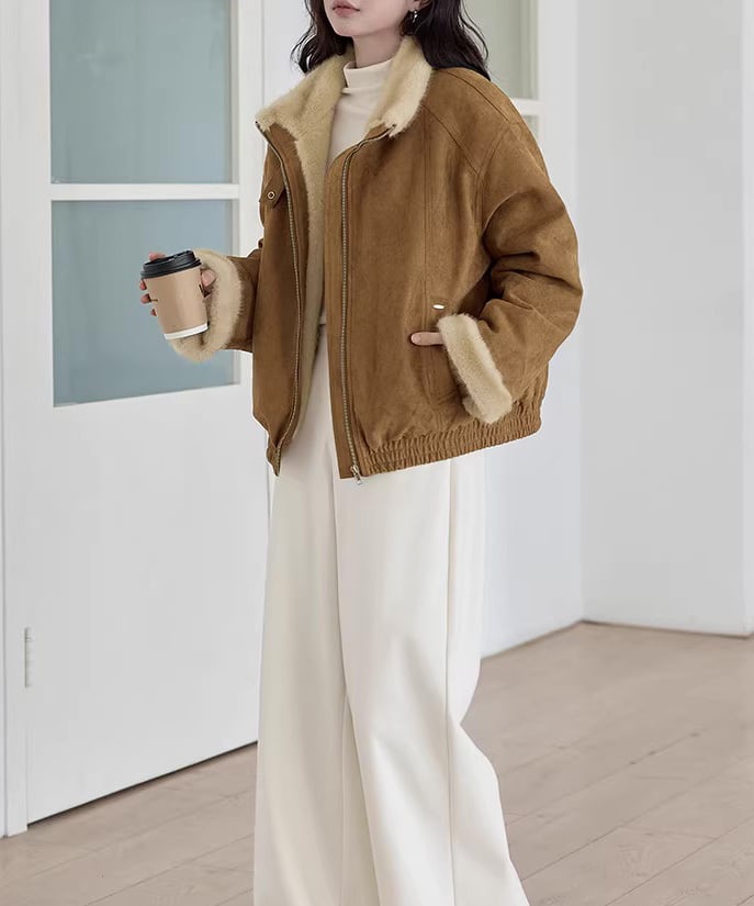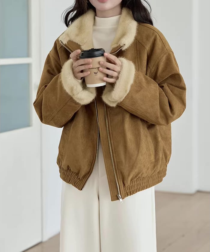 ふんわりとしたファー素材が目を惹く、レトロムード漂うジャケット。