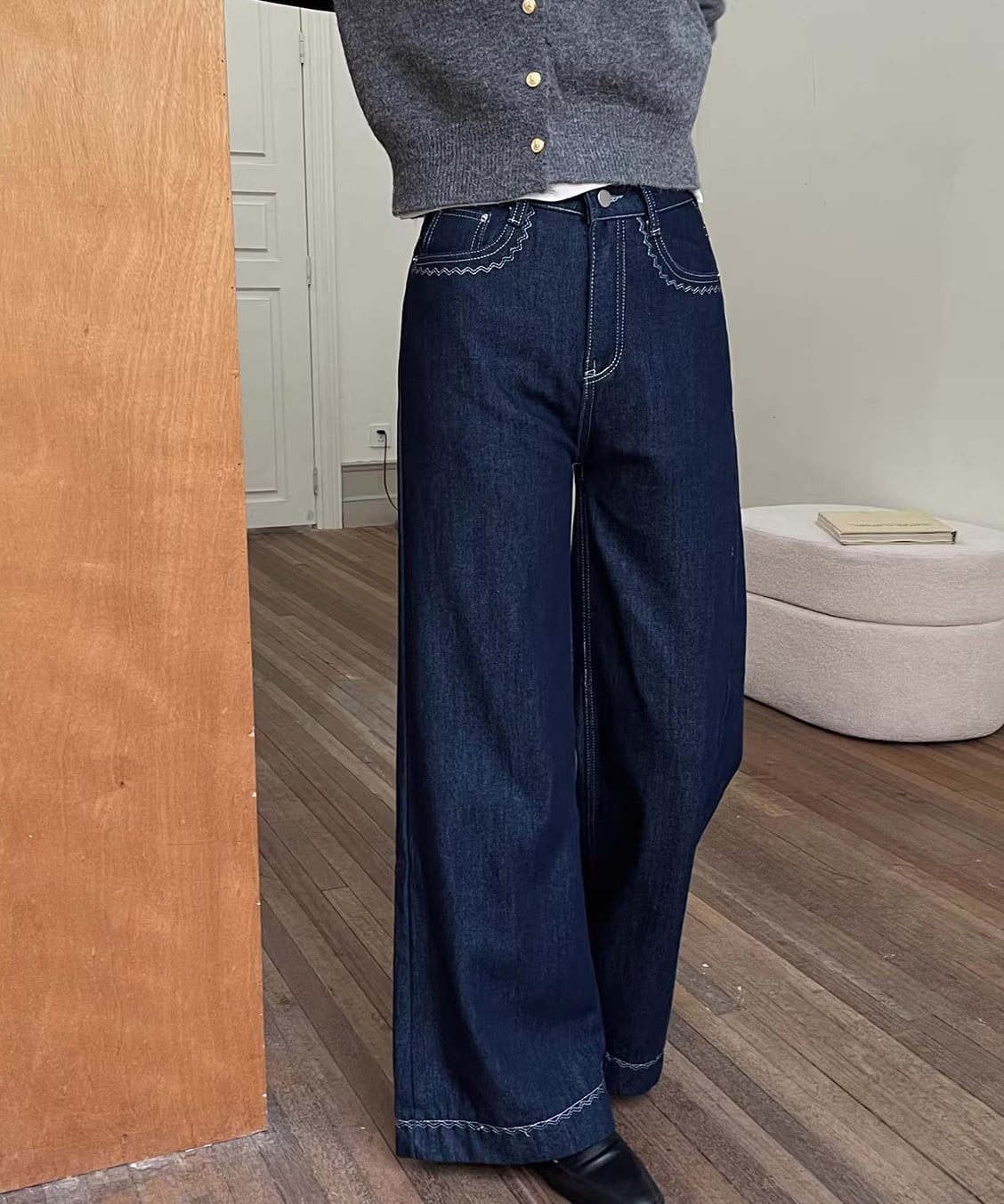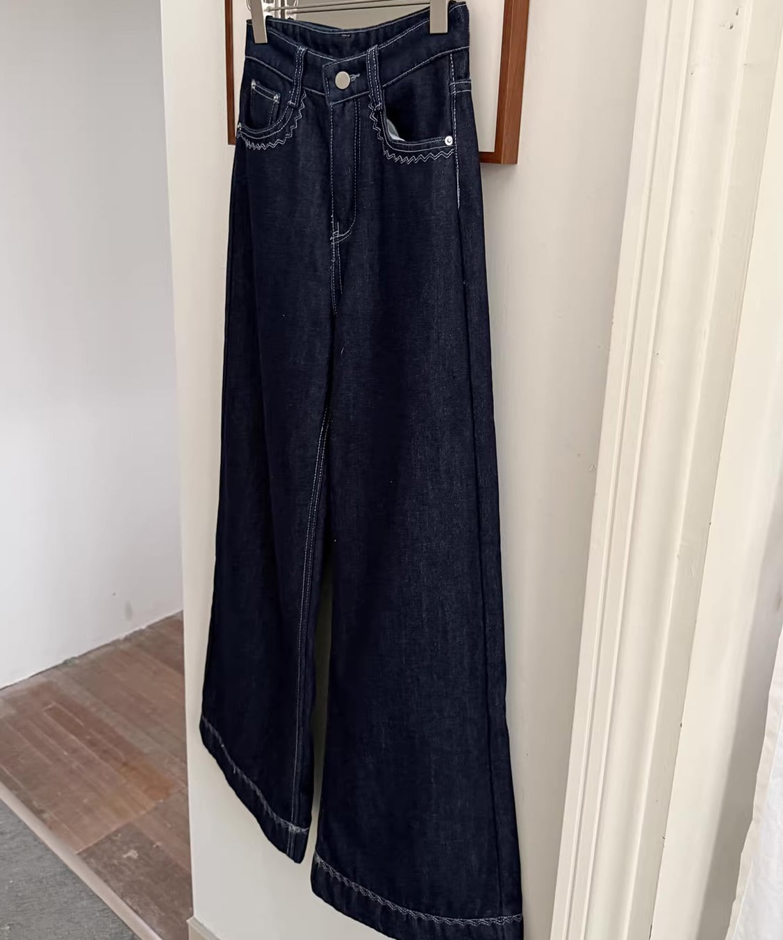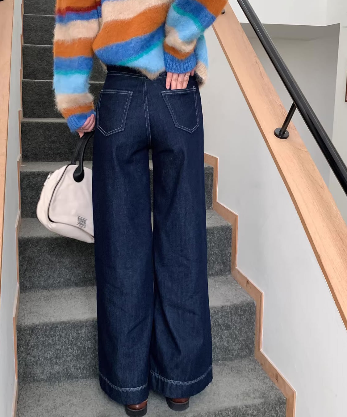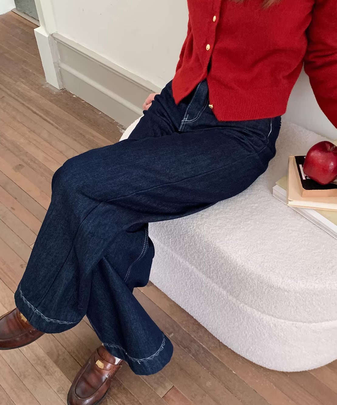 太めのシルエットと配色ステッチが特徴のワイドデニム。
