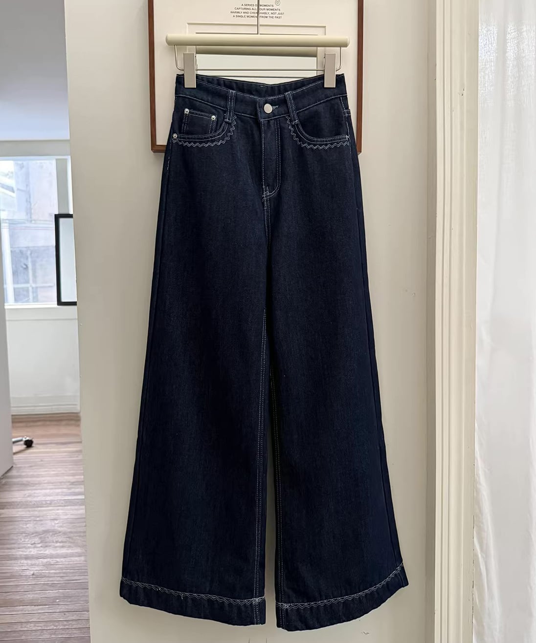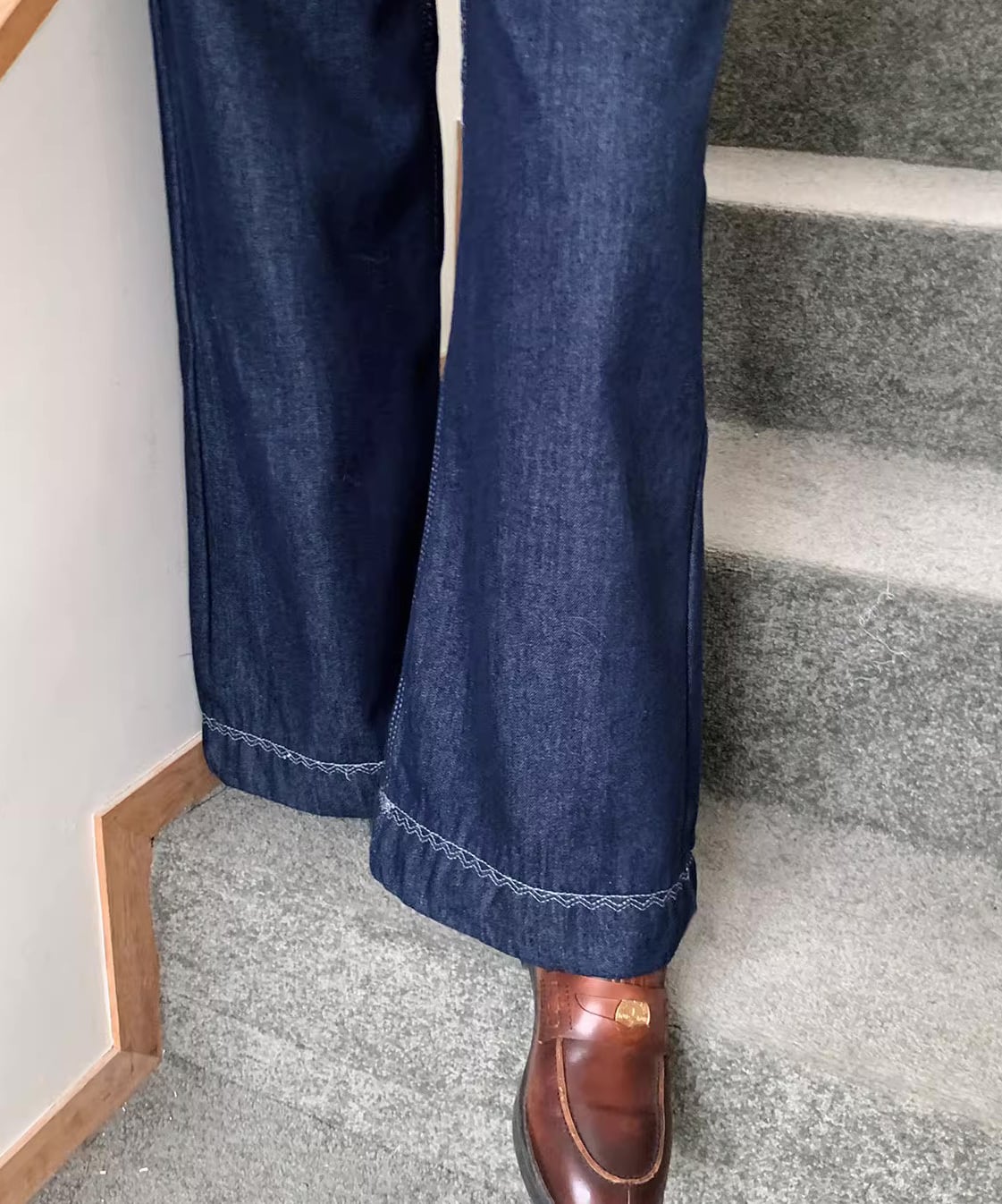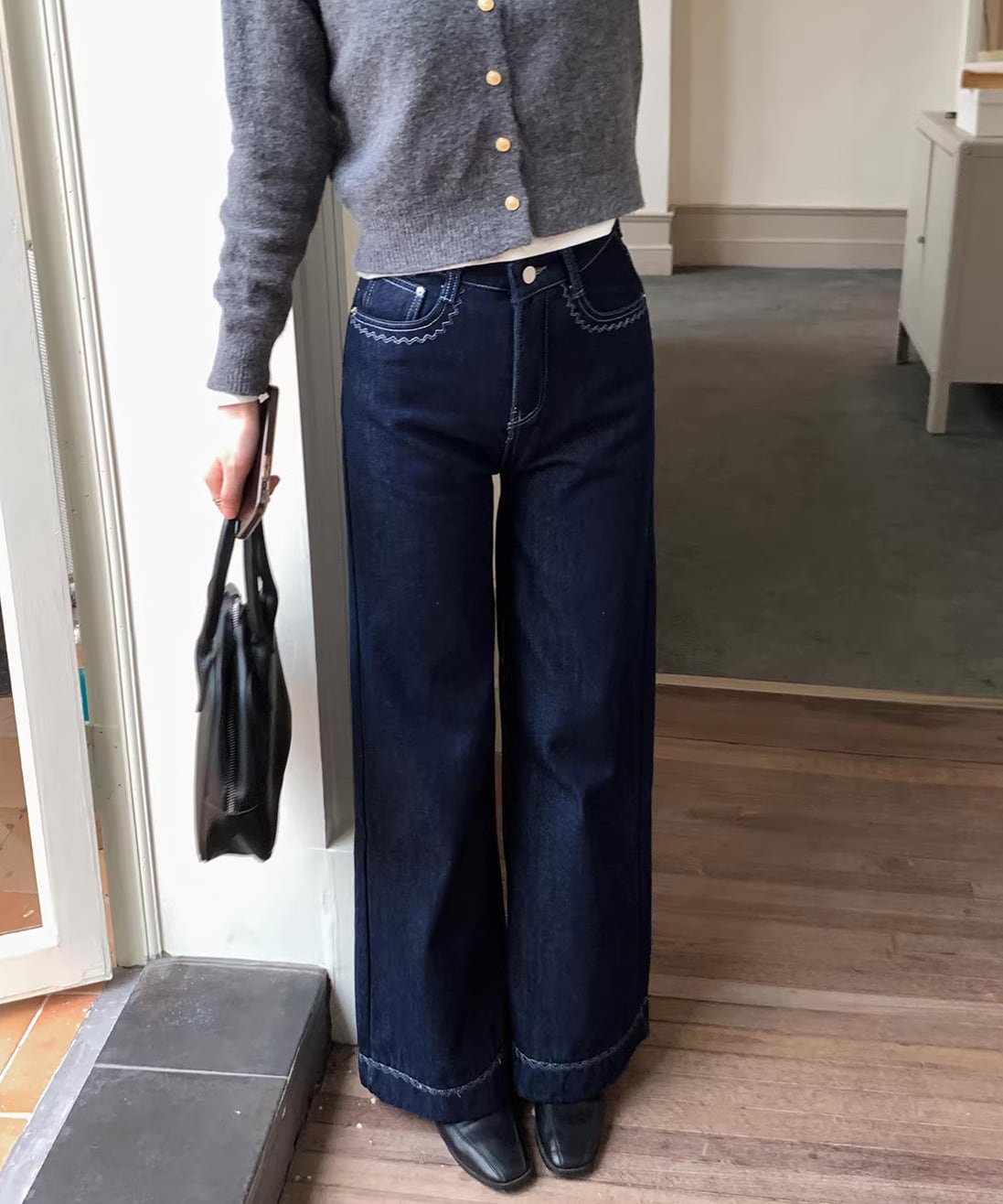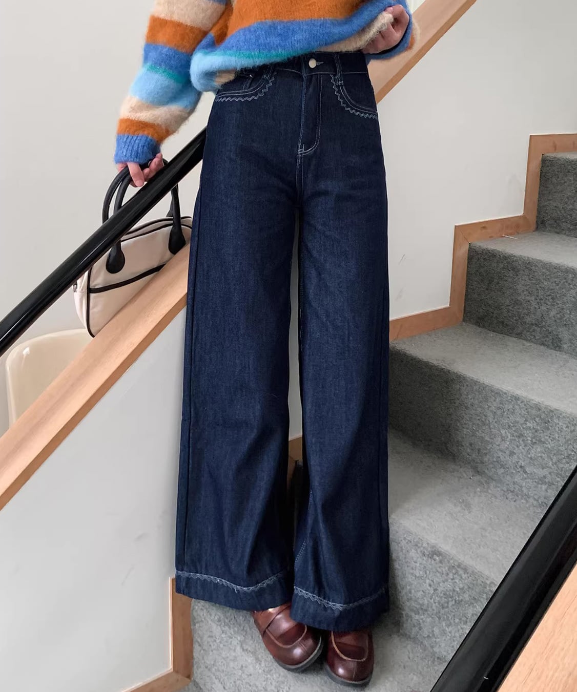 太めのシルエットと配色ステッチが特徴のワイドデニム。