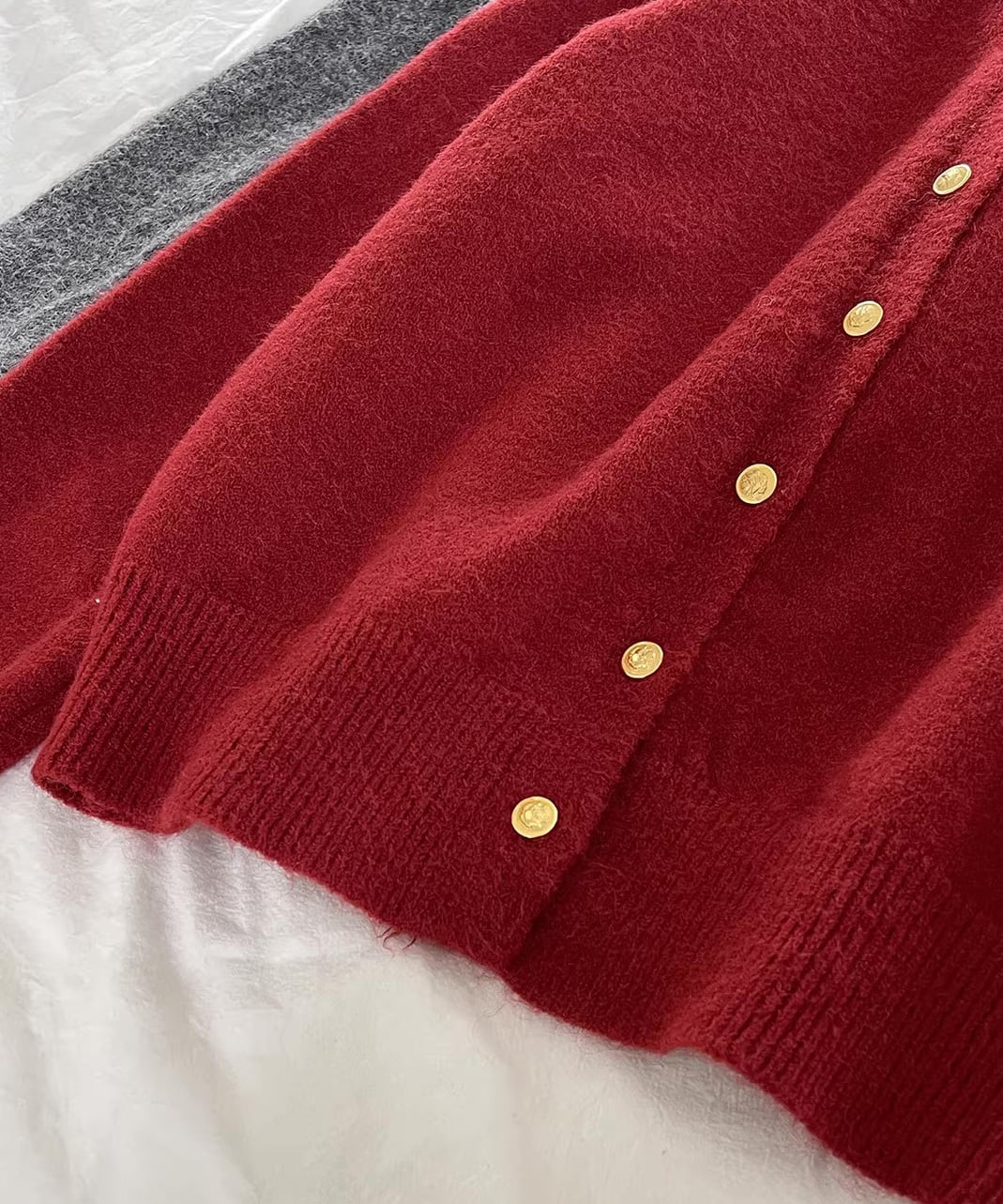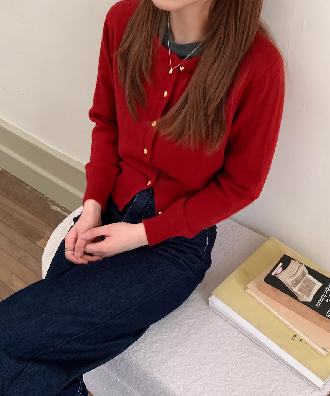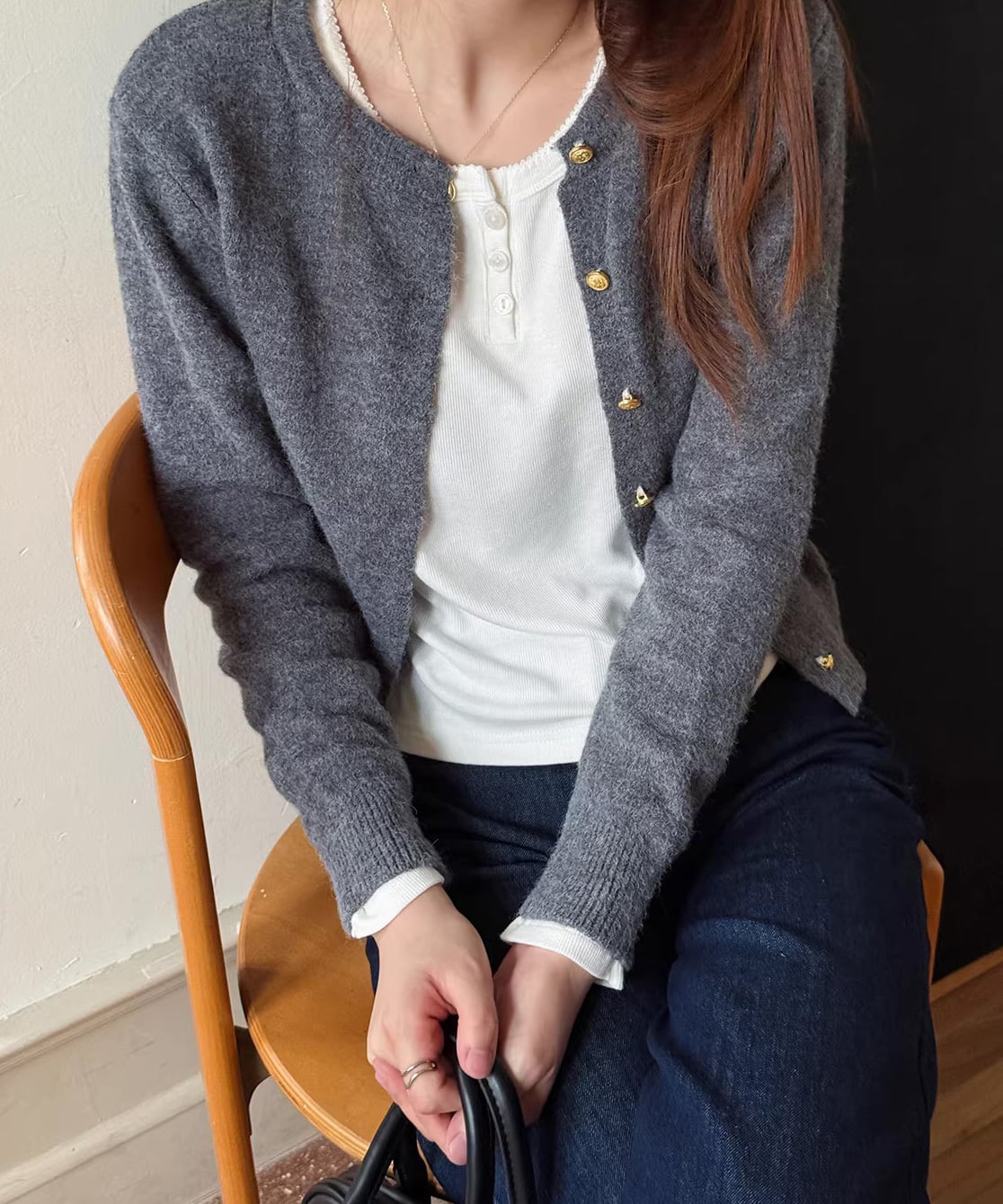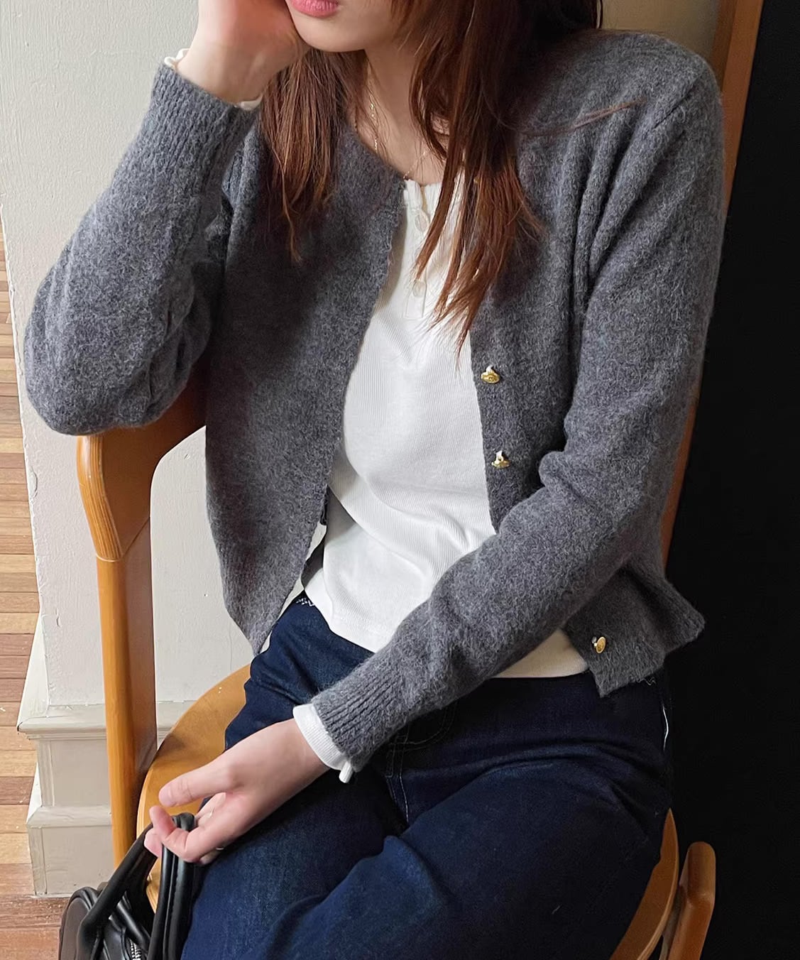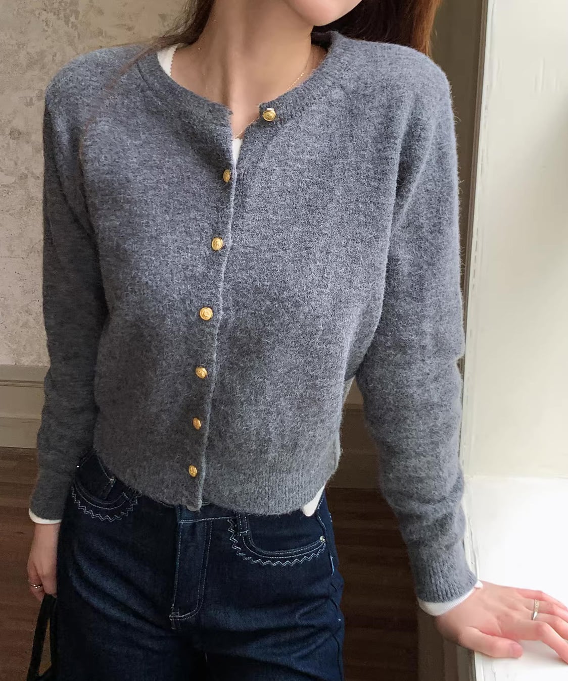 クラシカルな小粒のゴールドボタンがアクセントになったニットカーディガン。
