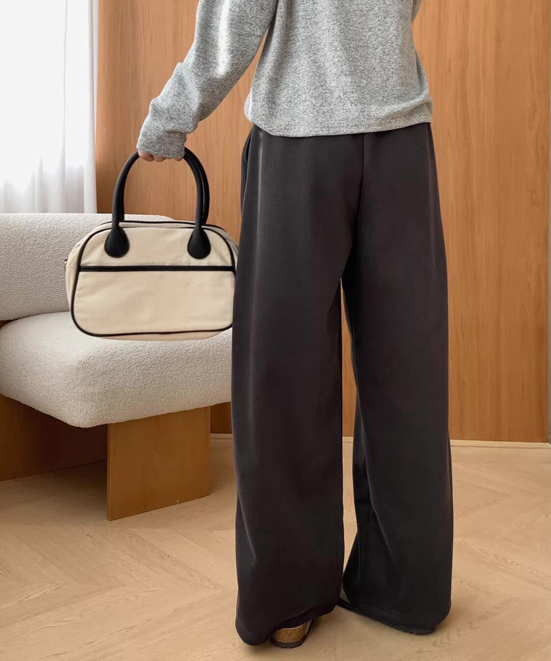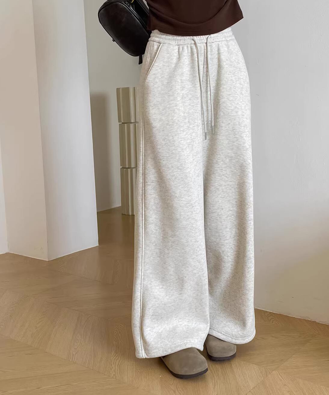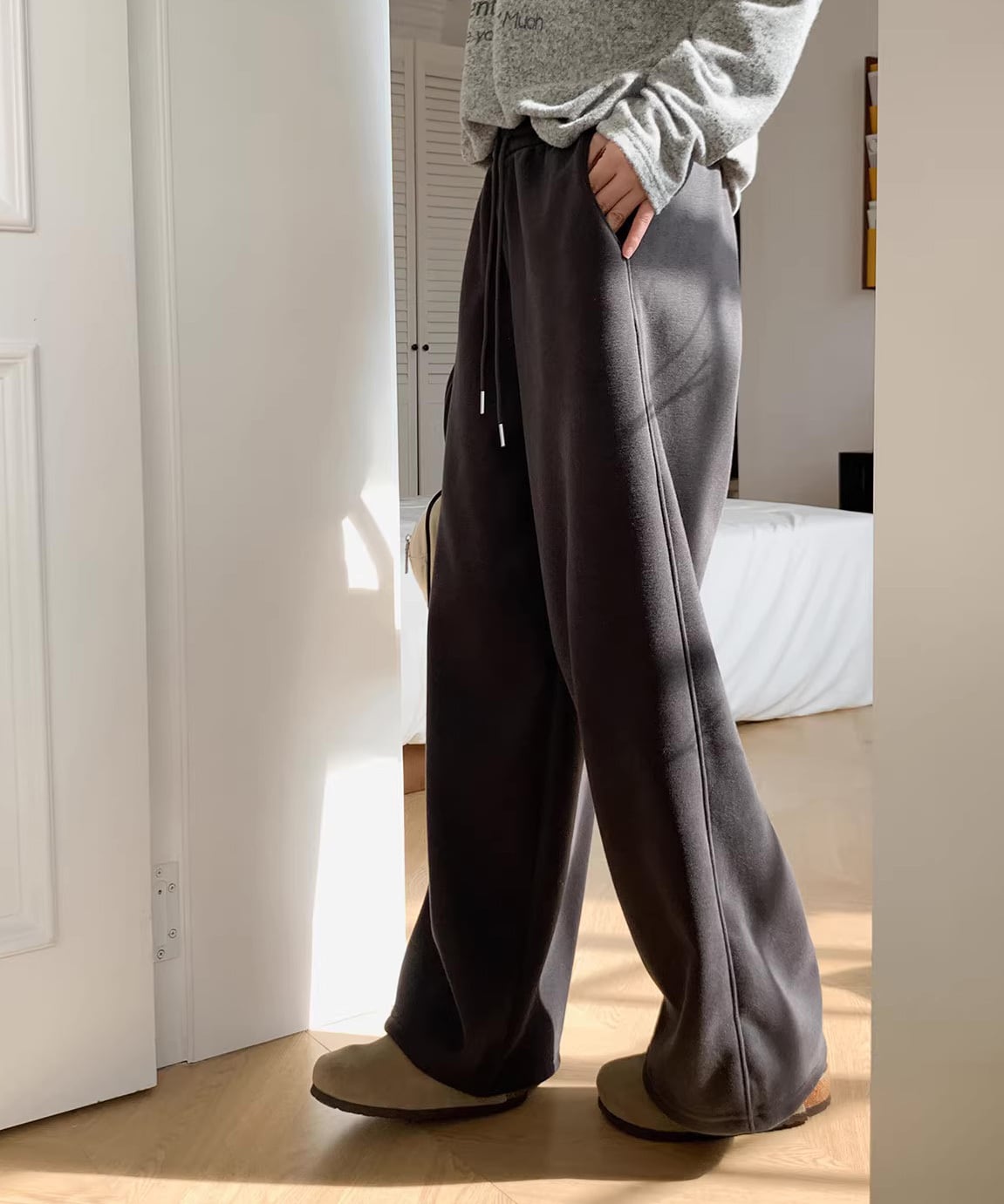 内側は裏起毛仕様で、寒い季節も快適な履き心地。ハイウエスト設計で脚長効果があり、スウェットながらもラフすぎない印象に。トップスをインしてもアウトしてもバランスが取りやすく、デイリー使いに最適。おうち時間まで幅広く活躍します。