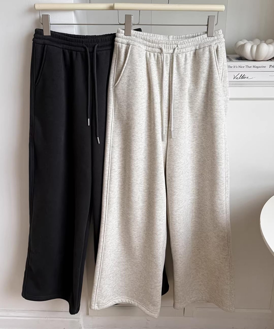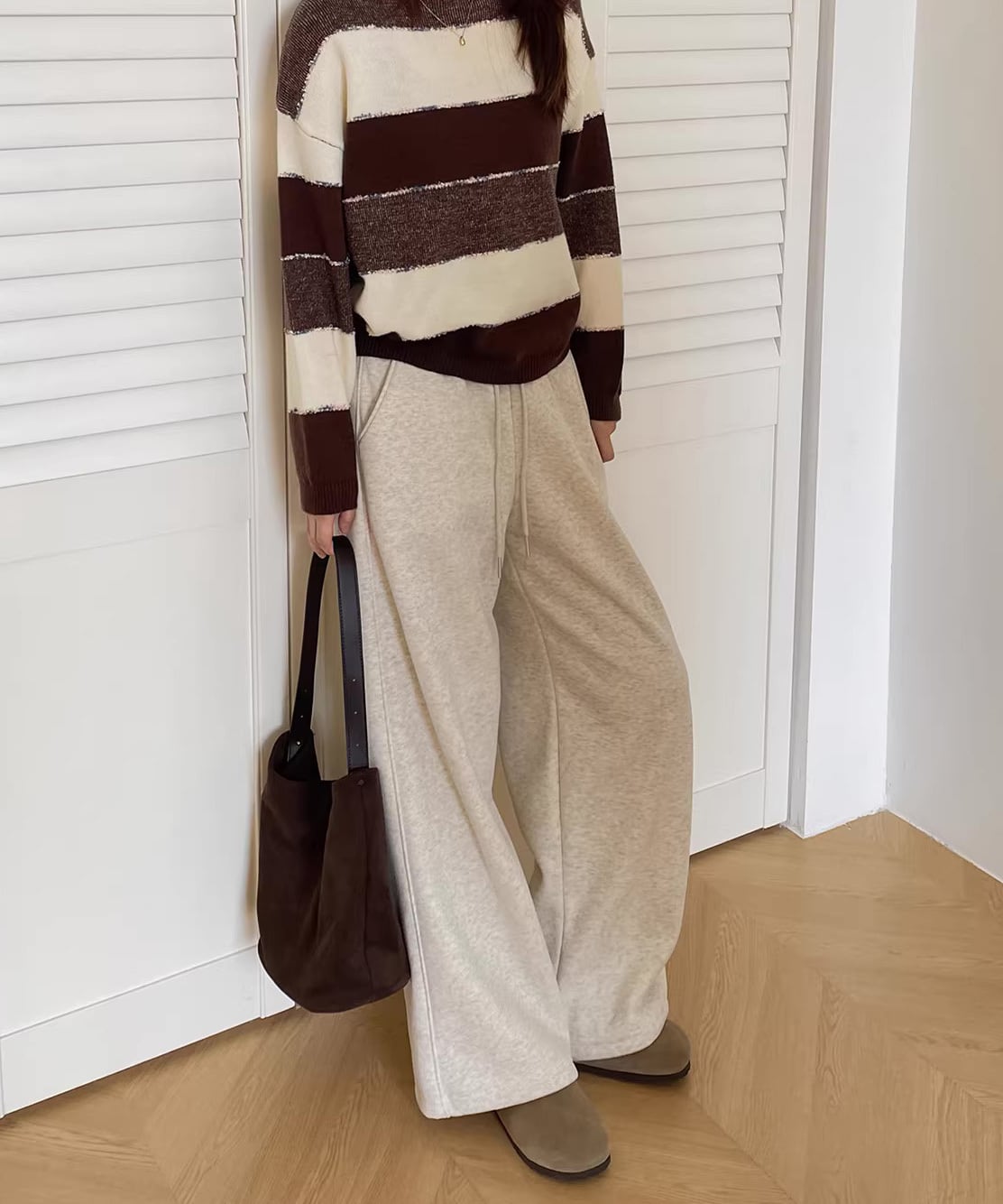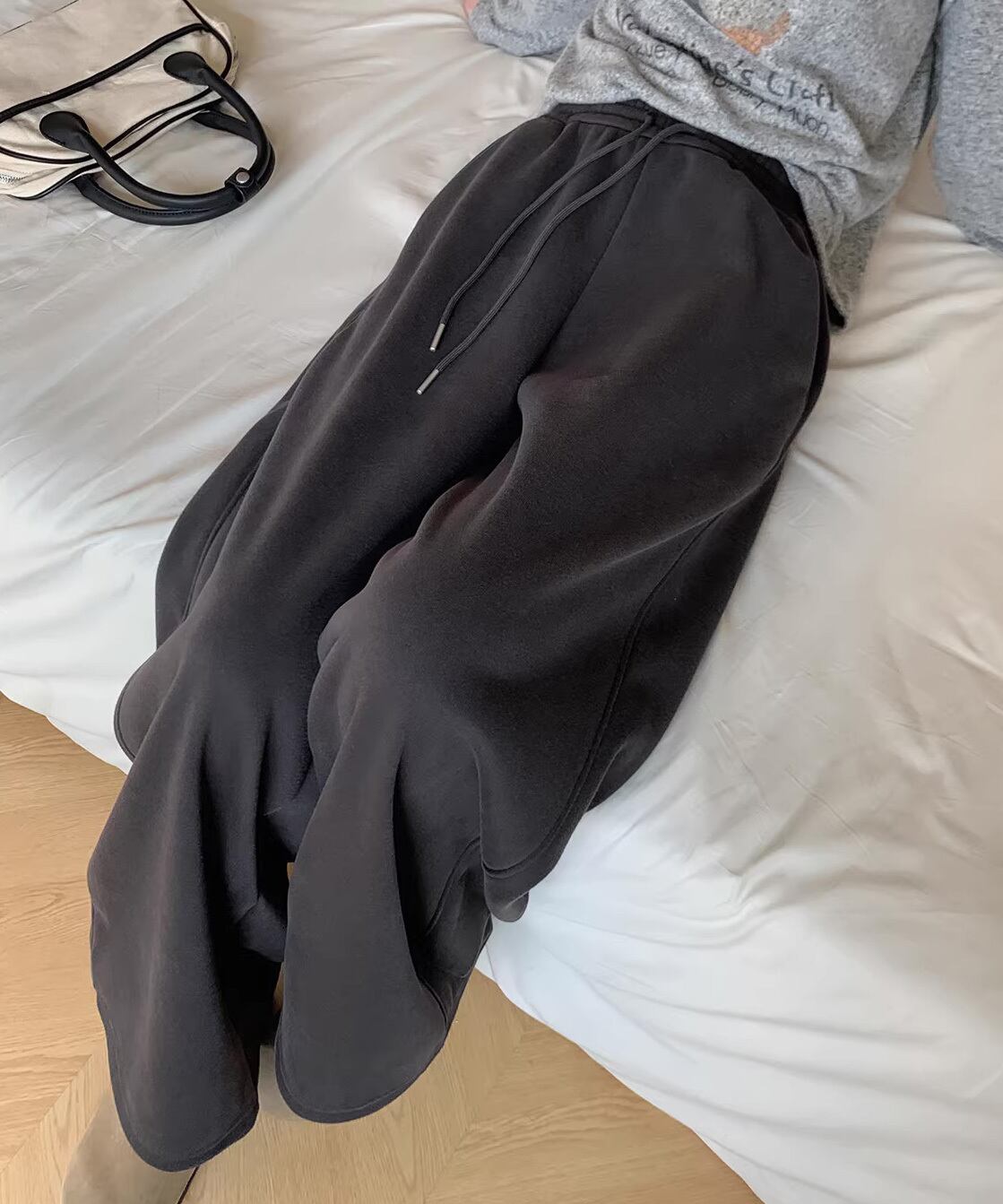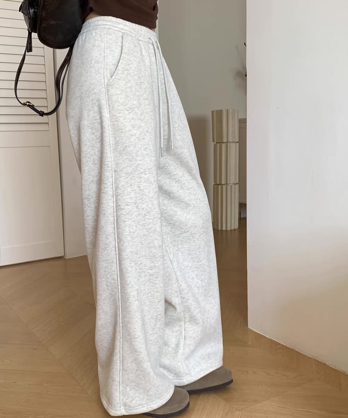 内側は裏起毛仕様で、寒い季節も快適な履き心地。ハイウエスト設計で脚長効果があり、スウェットながらもラフすぎない印象に。トップスをインしてもアウトしてもバランスが取りやすく、デイリー使いに最適。おうち時間まで幅広く活躍します。