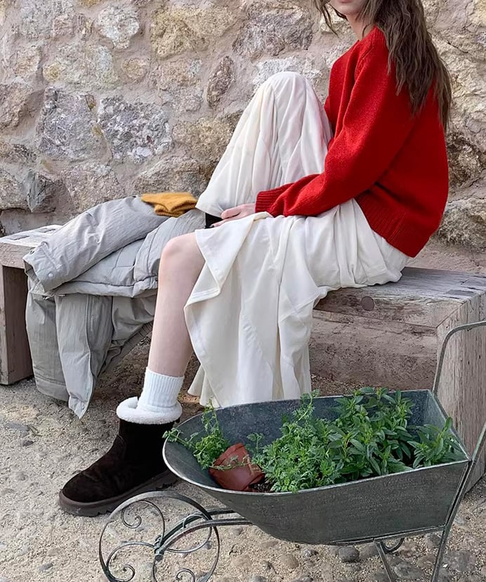 ニットやスウェットとも相性が良く、甘さを抑えた大人カジュアルに。