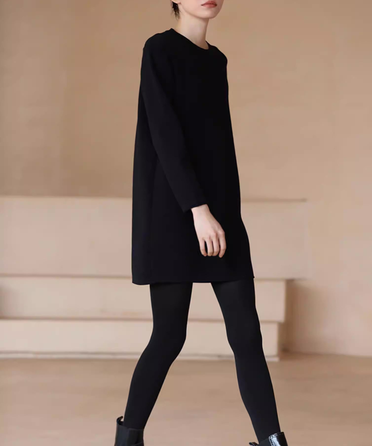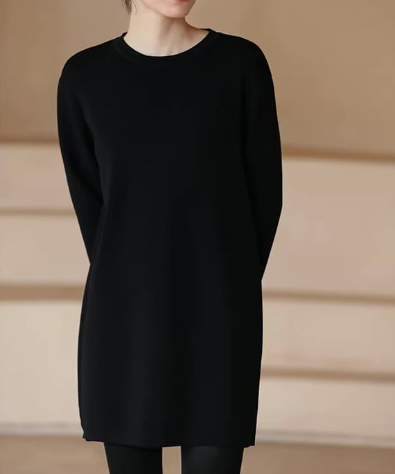 装飾を抑えたミニマルなデザインが魅力のブラックワンピース。