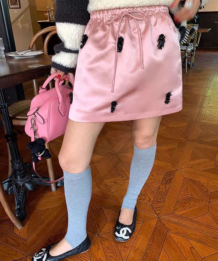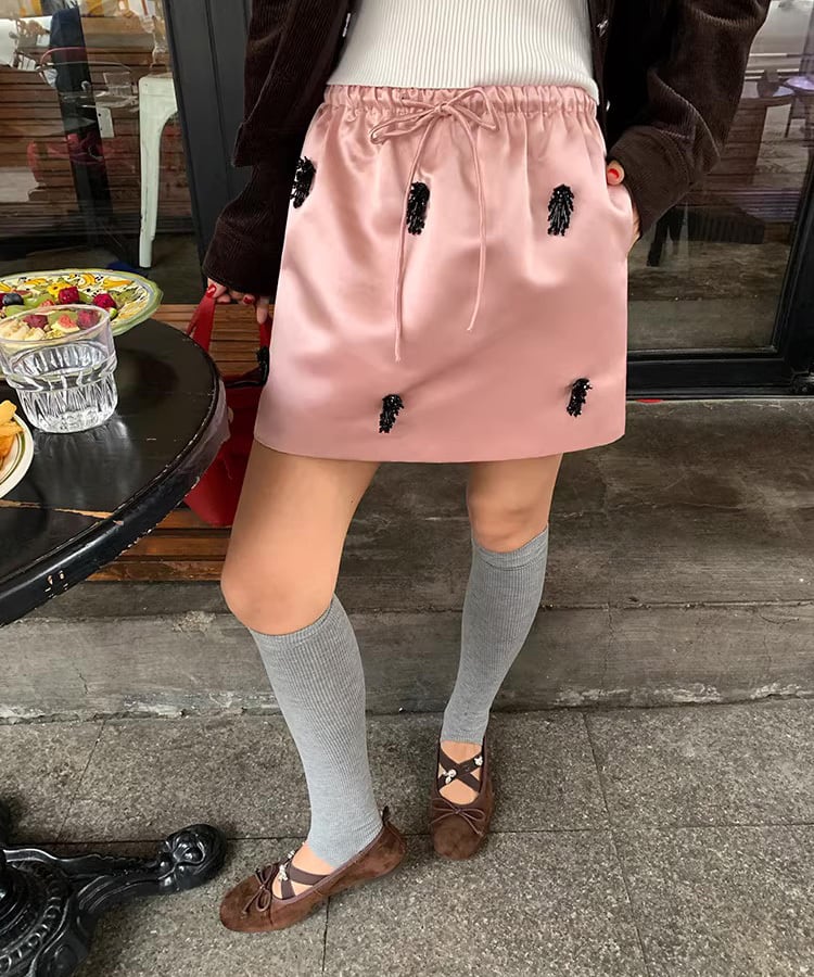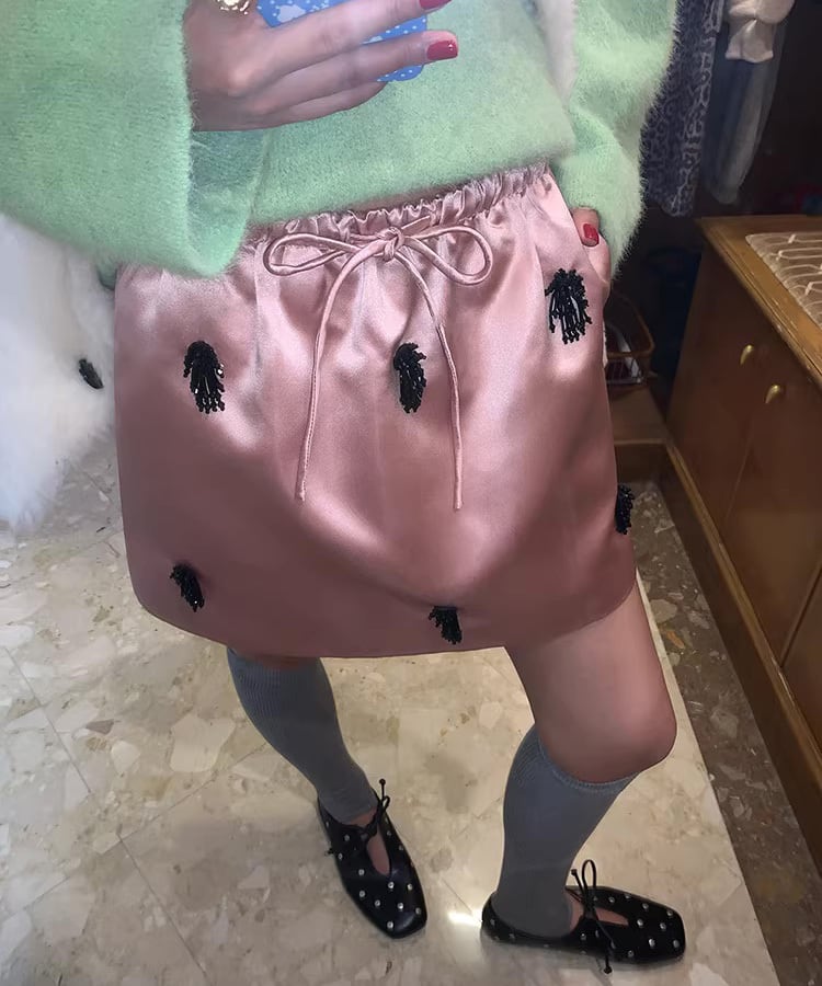 上品な光沢感が魅力のサテン素材を使用したミディ丈スカート。