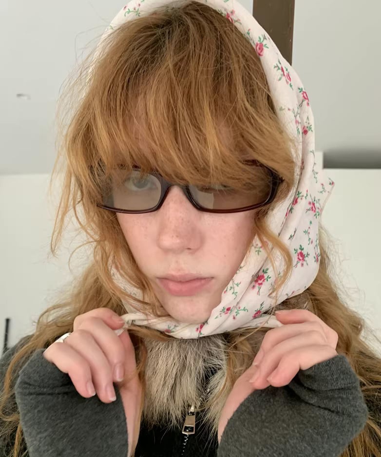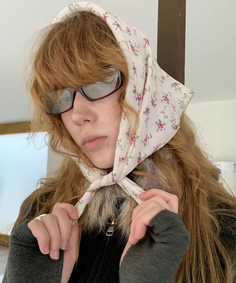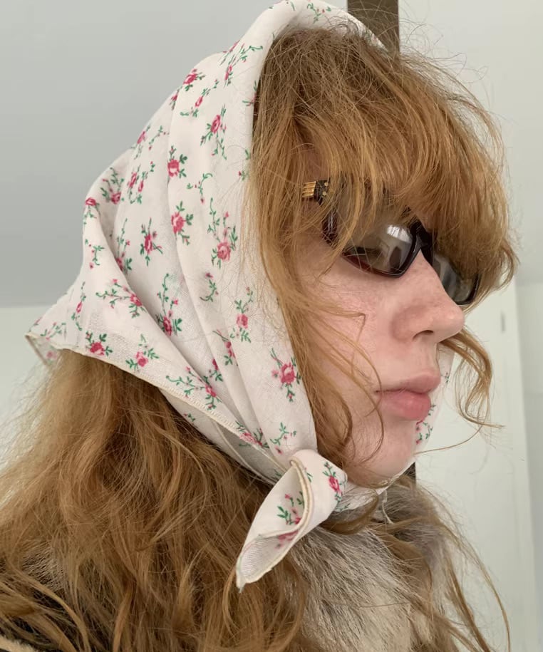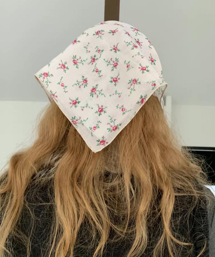 レトロなフラワーモチーフが印象的なヘッドスカーフ。