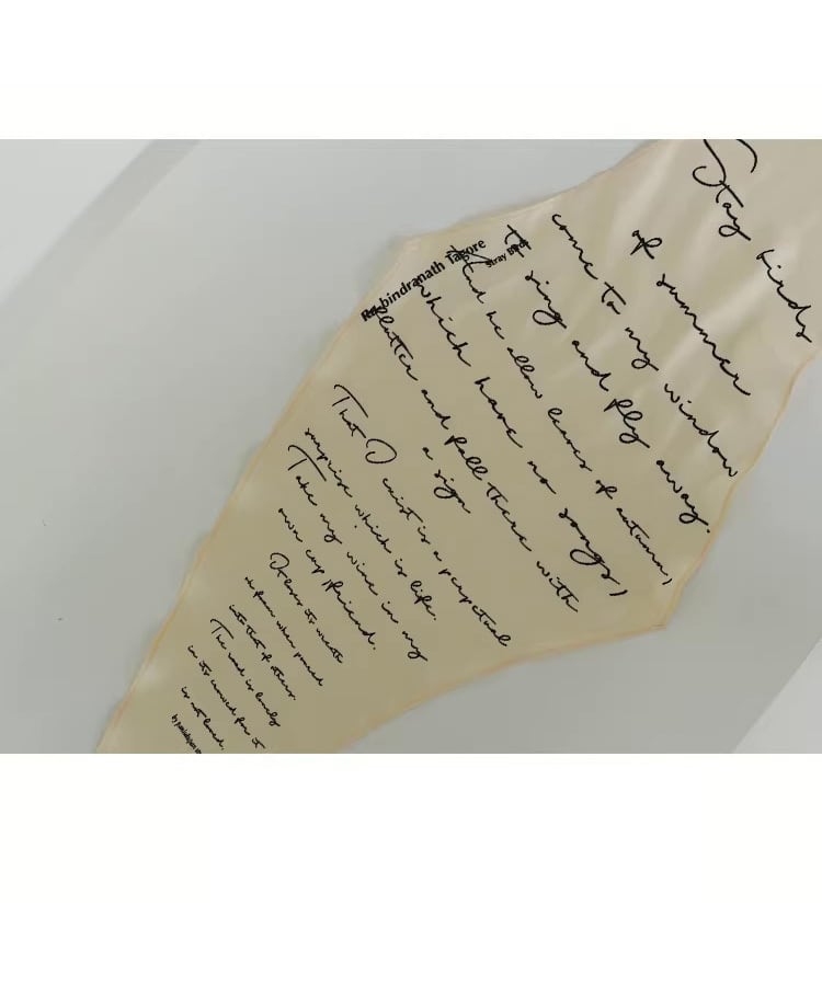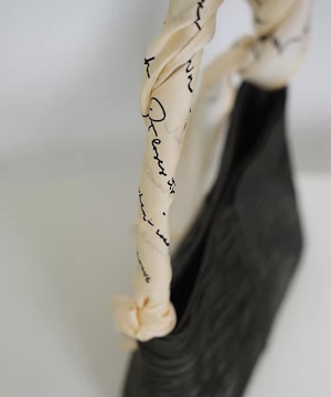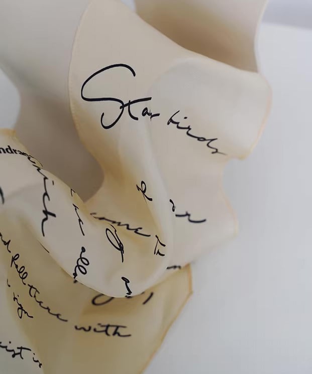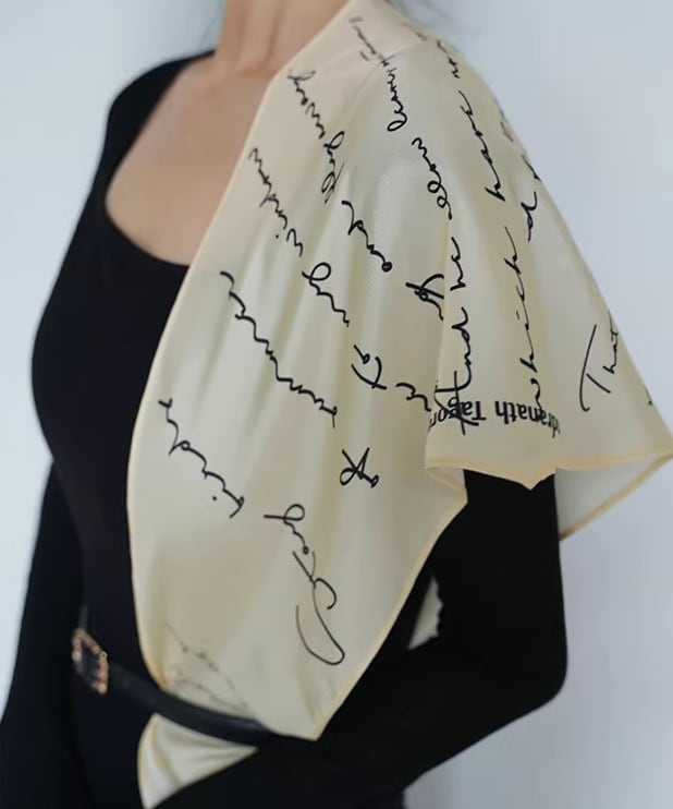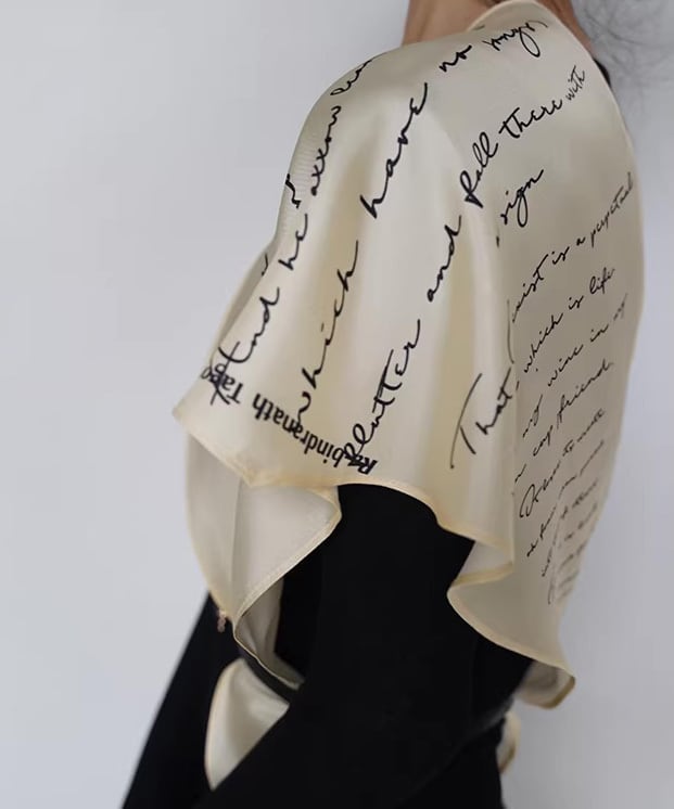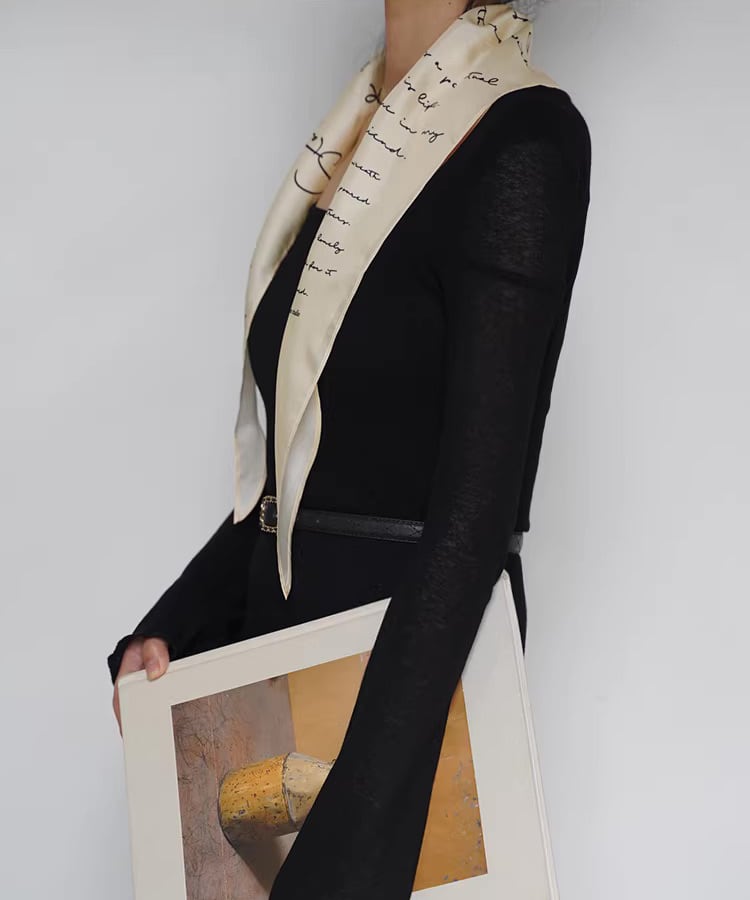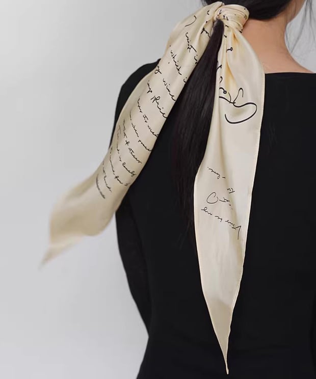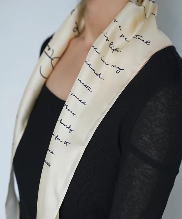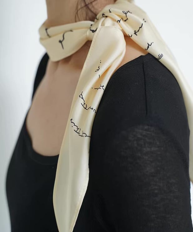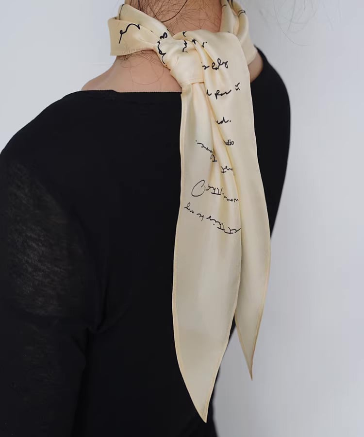 レトロなタイポグラフィ柄が印象的なシルクタッチスカーフ。