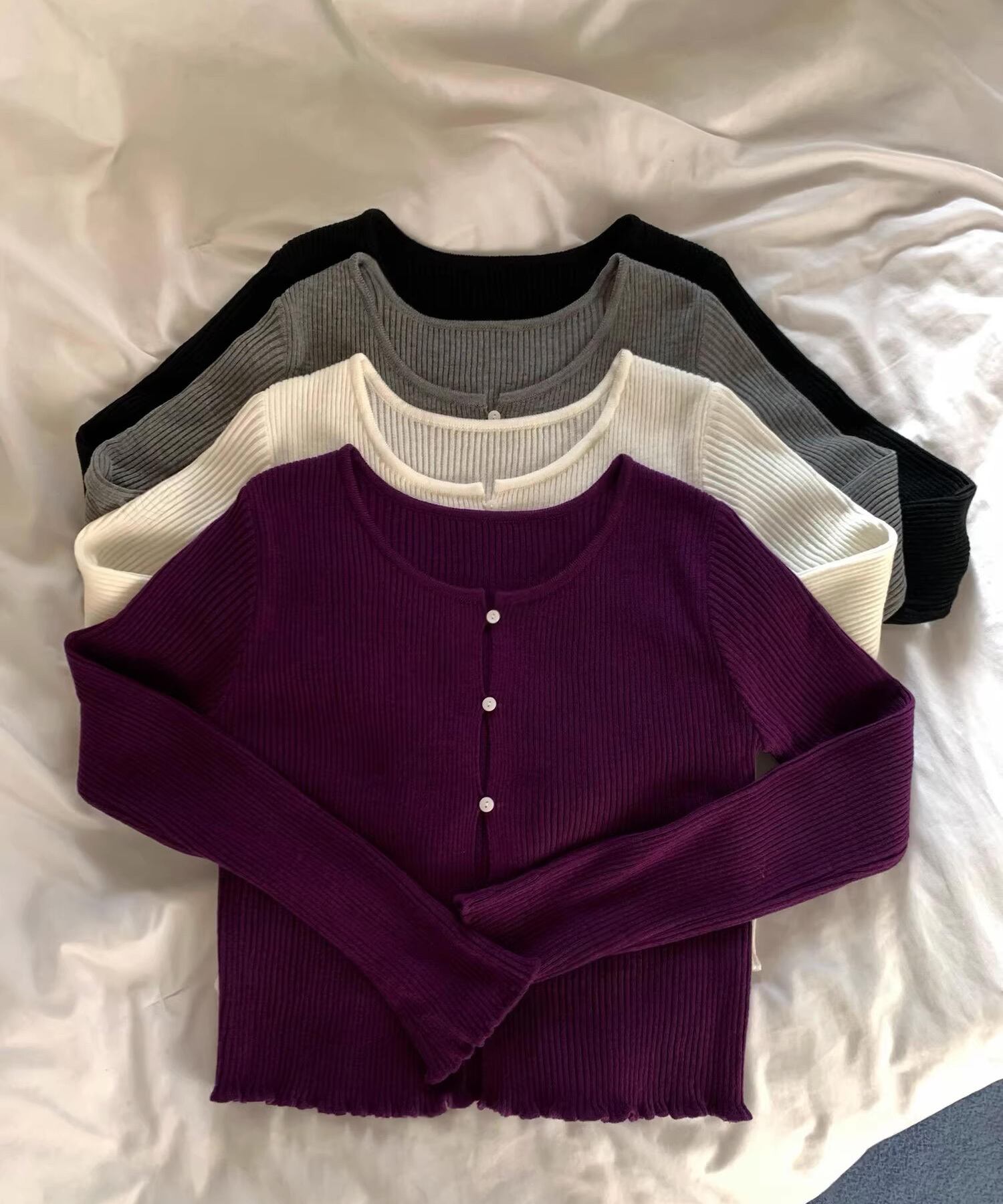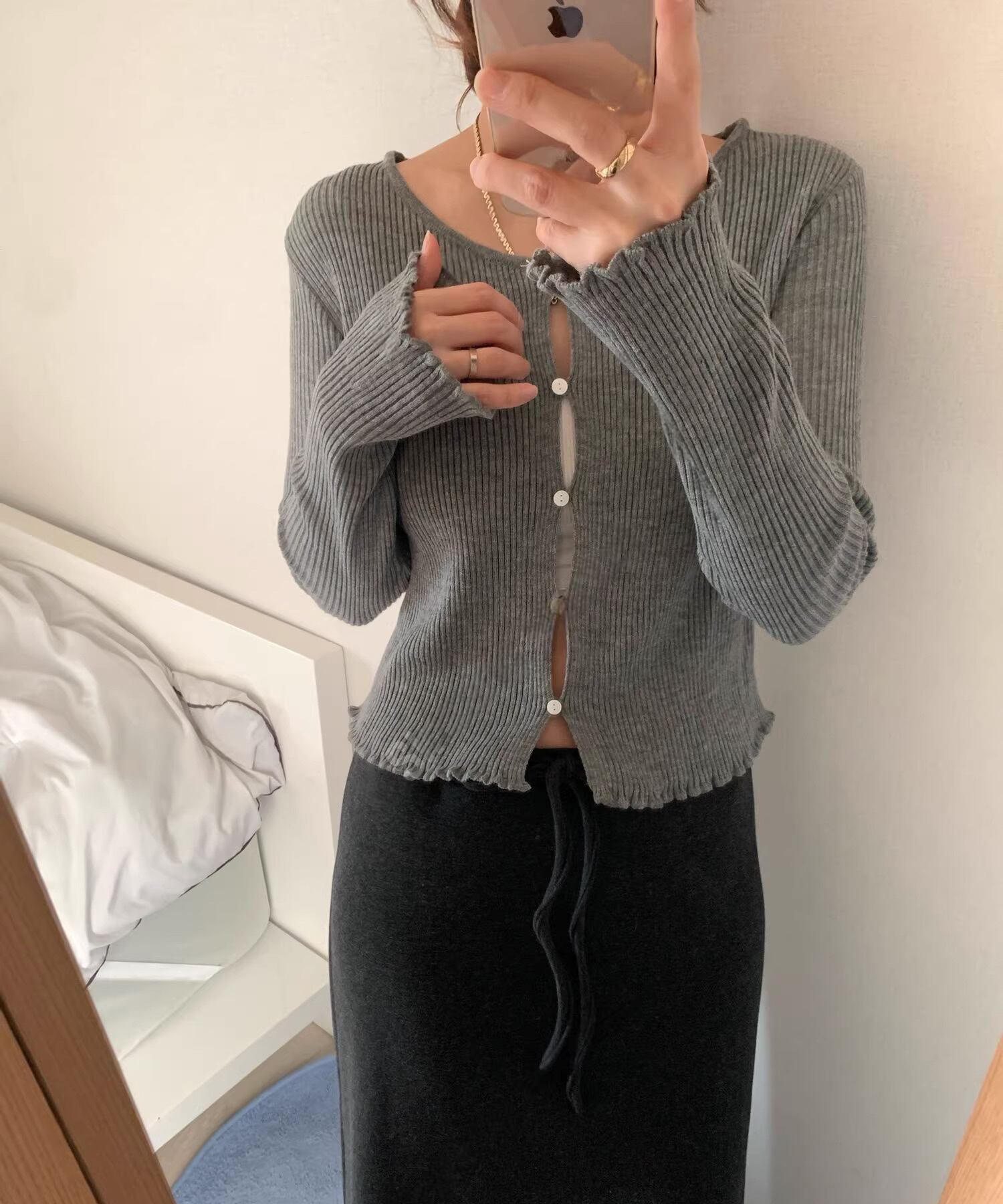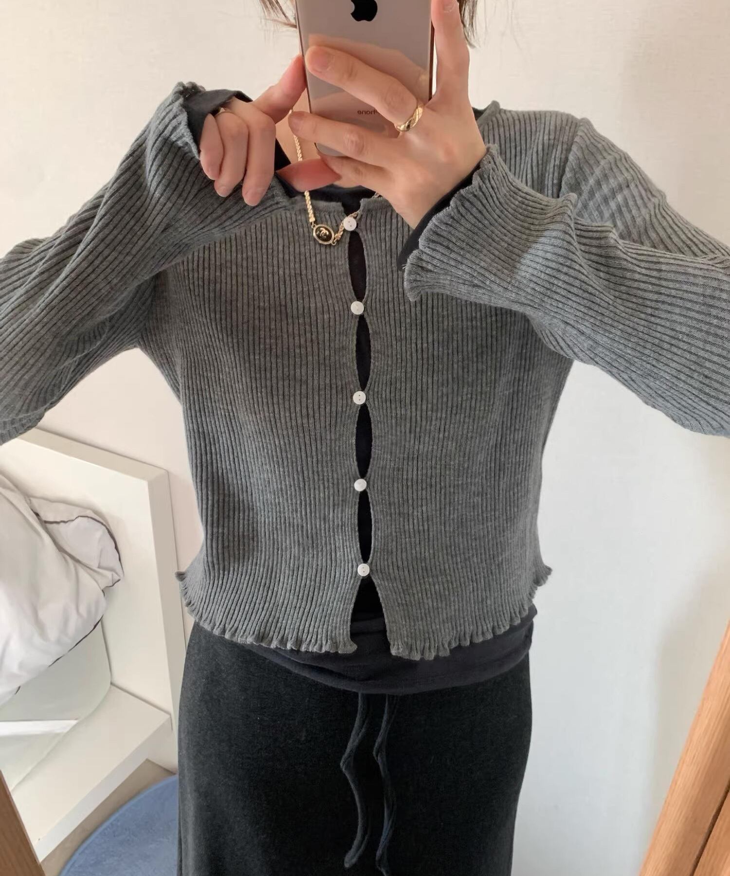 ボタンを留めても程よく隙間が生まれる、計算されたニュアンスデザインのカーディガン。