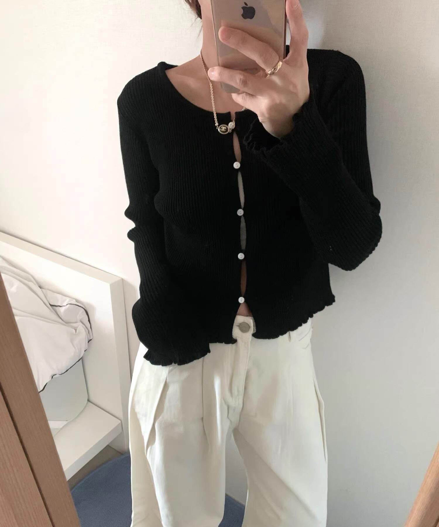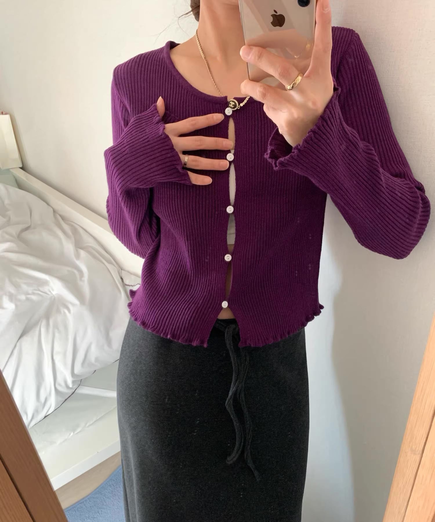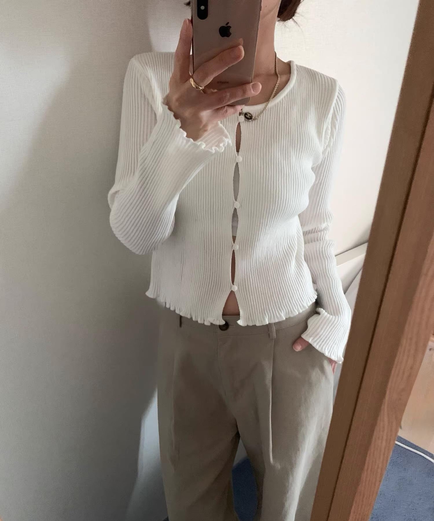 ボタンを留めても程よく隙間が生まれる、計算されたニュアンスデザインのカーディガン。