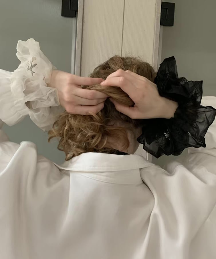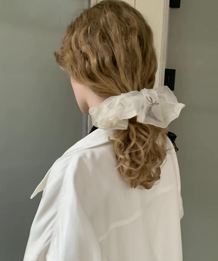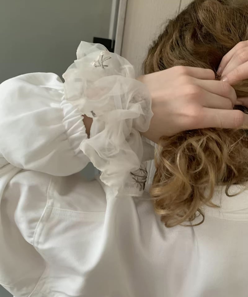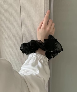 繊細なチュール素材にフラワー刺繍をあしらったシュシュ。