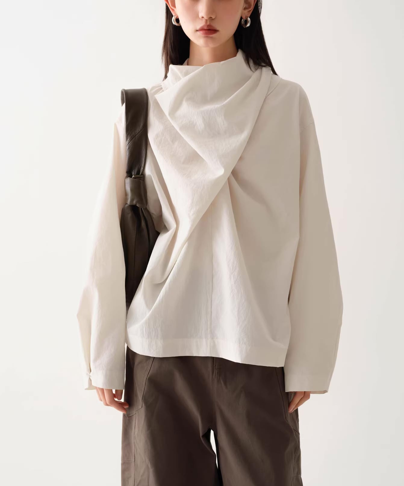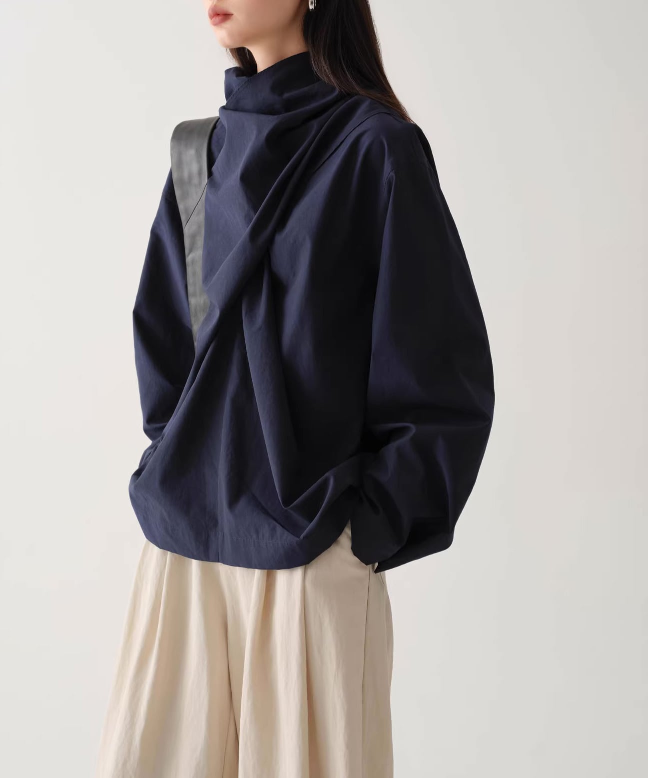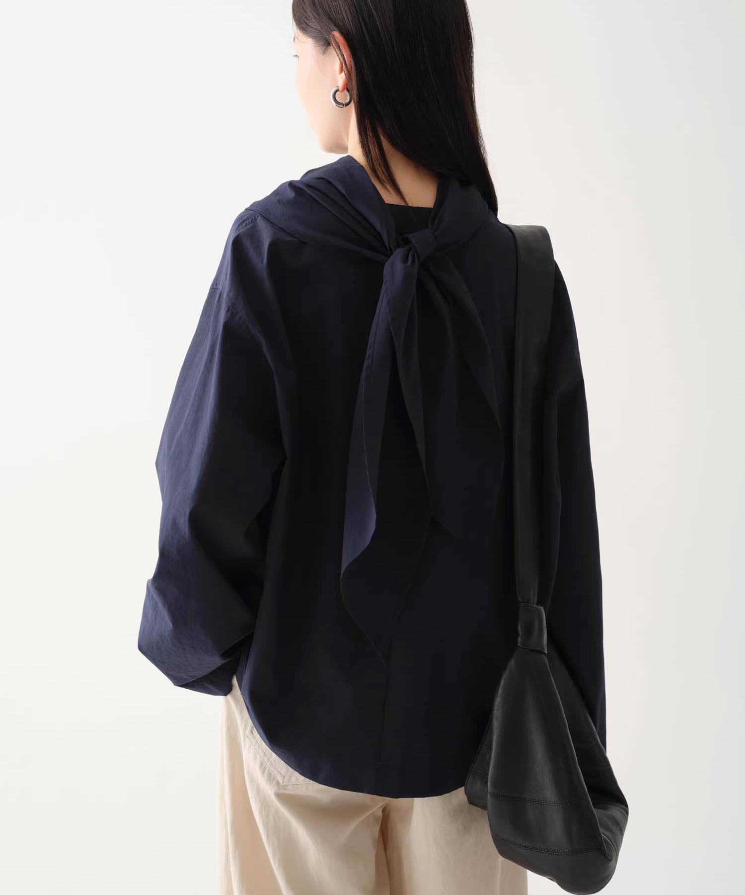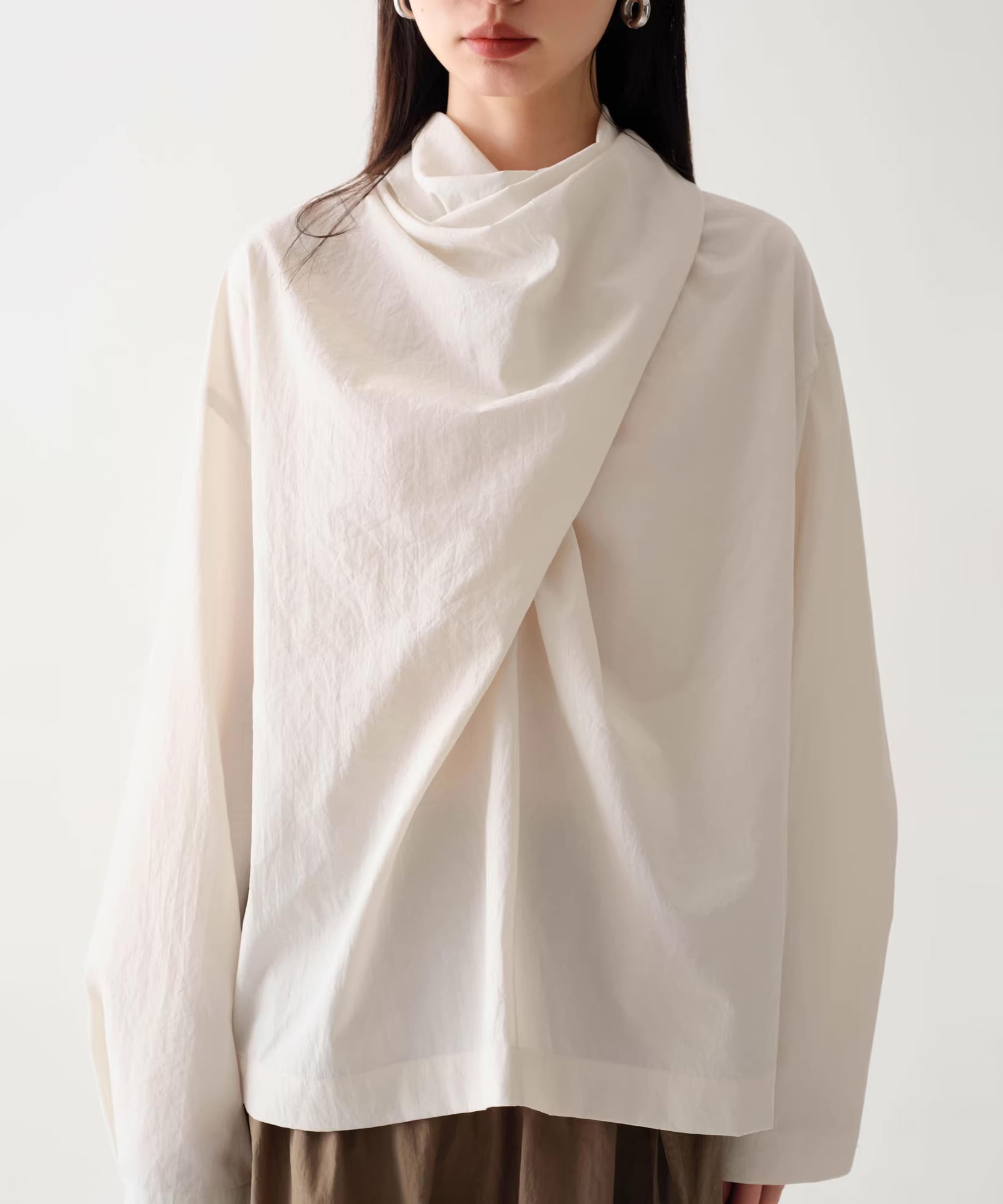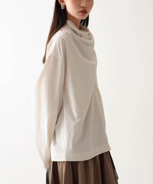 首元にニュアンスを添えるスカーフネックデザイン。