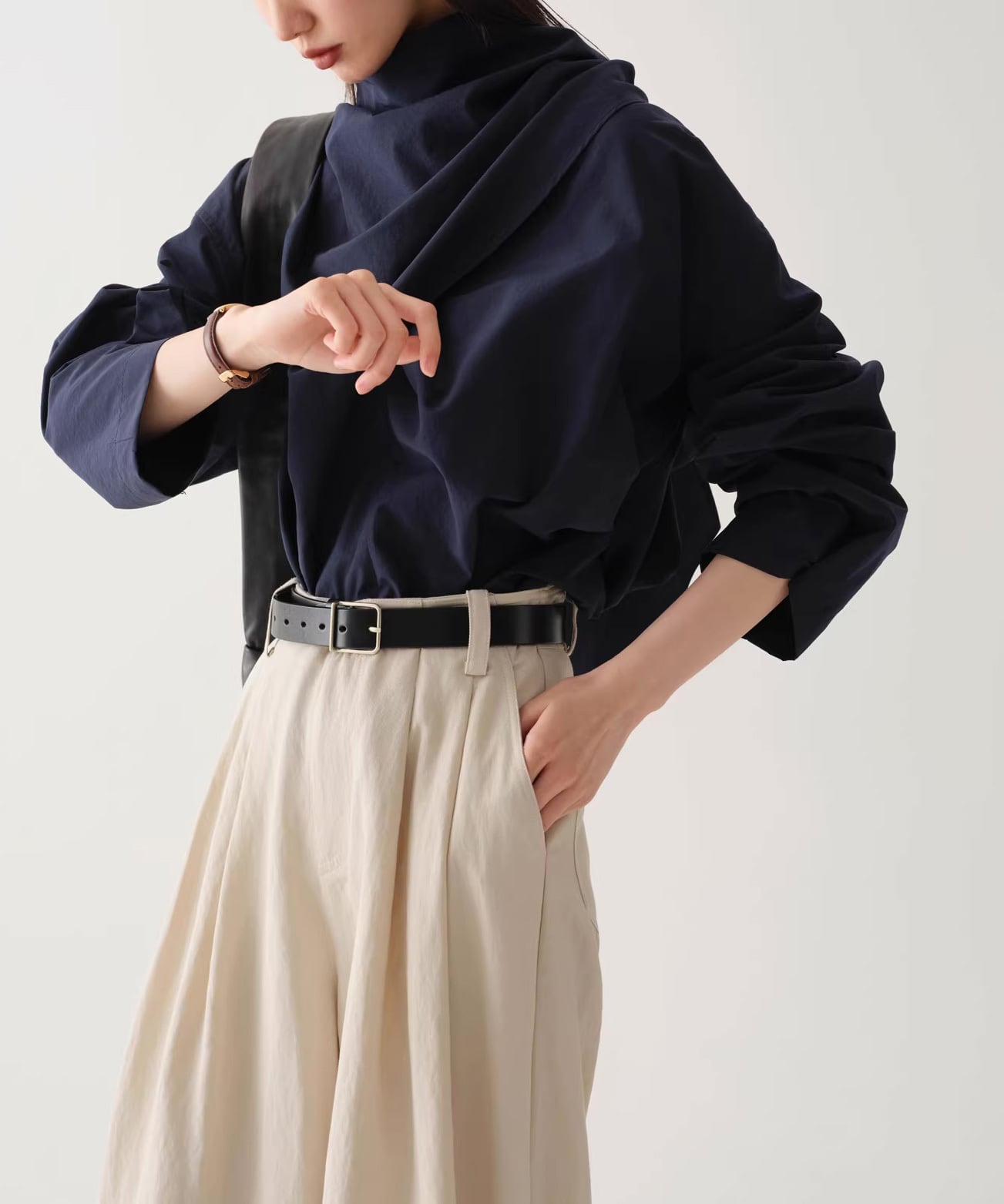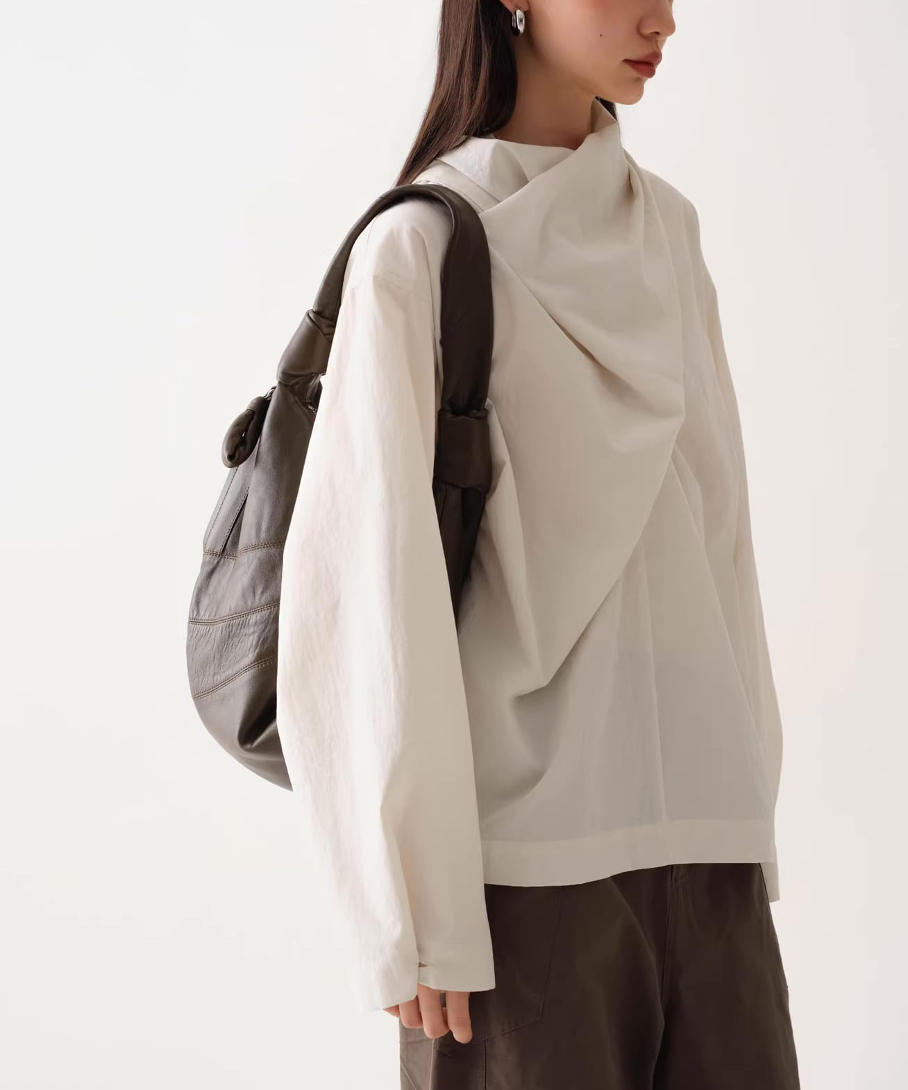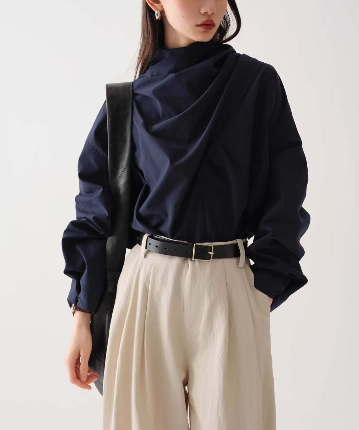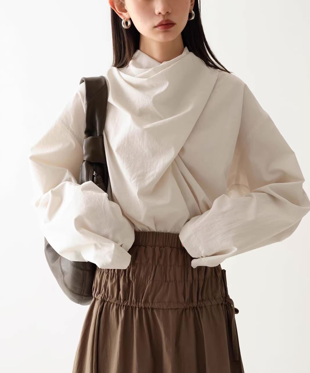 首元にニュアンスを添えるスカーフネックデザイン。