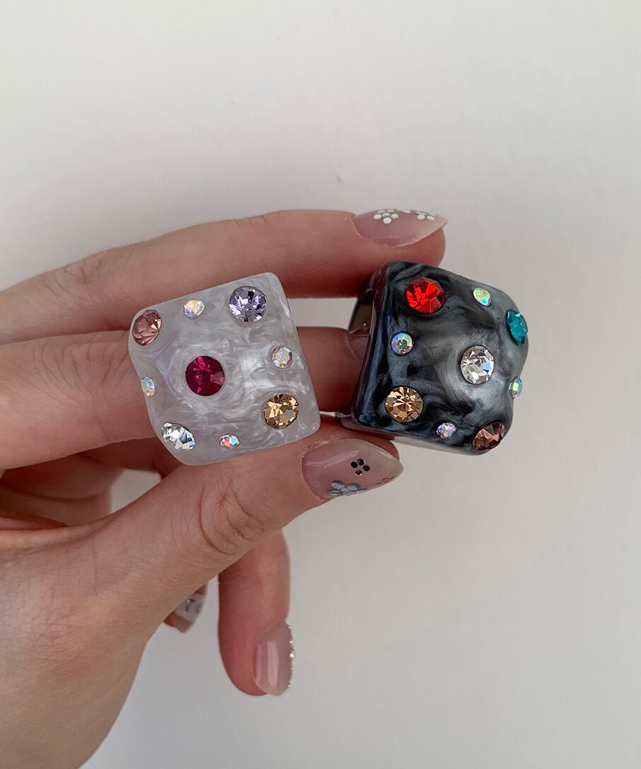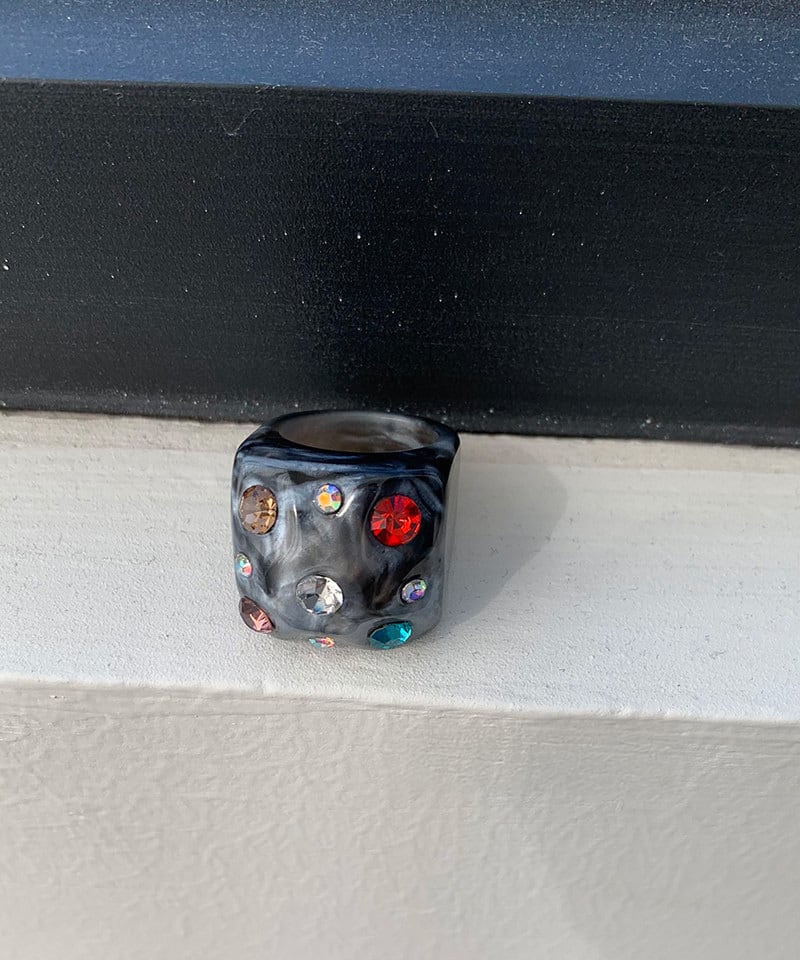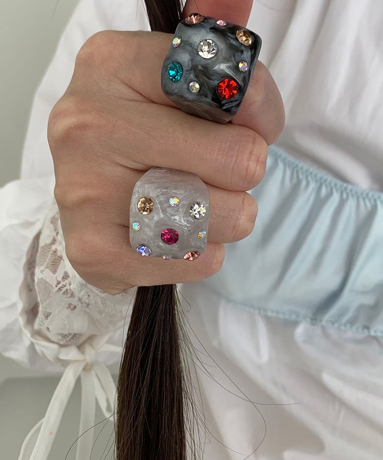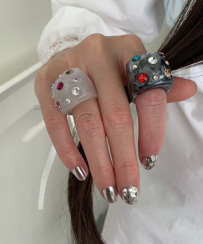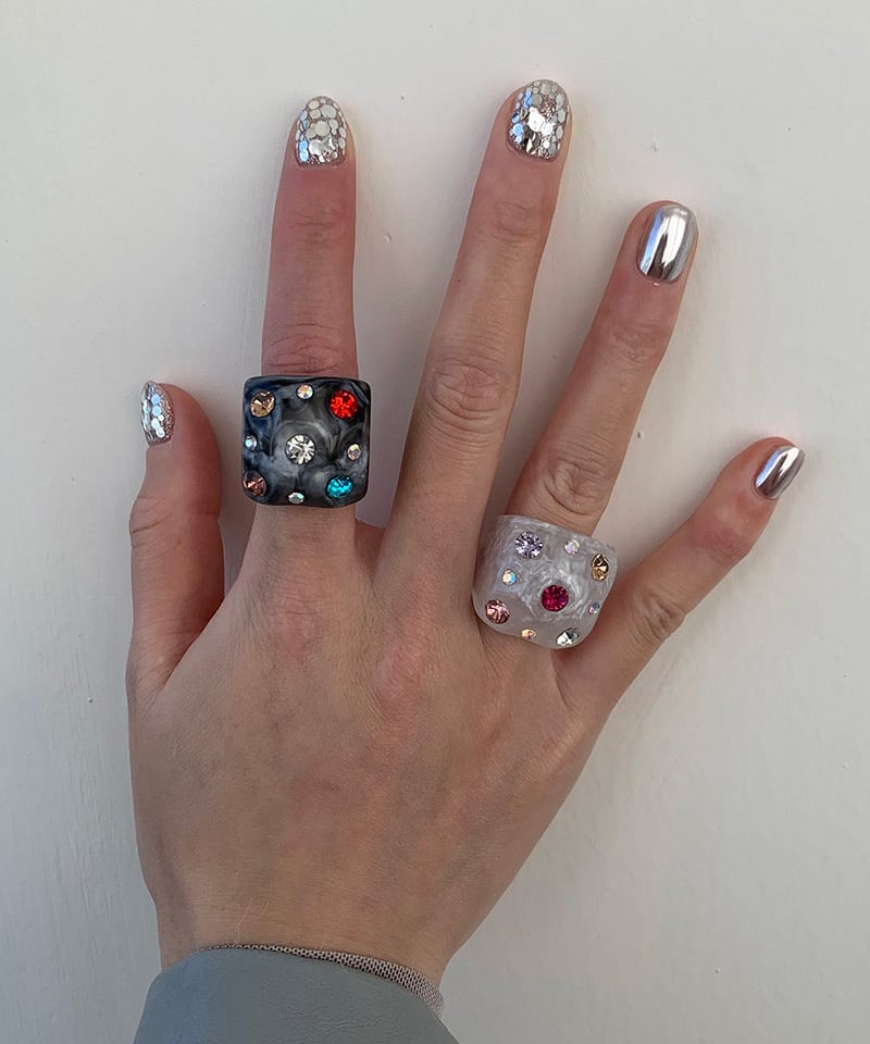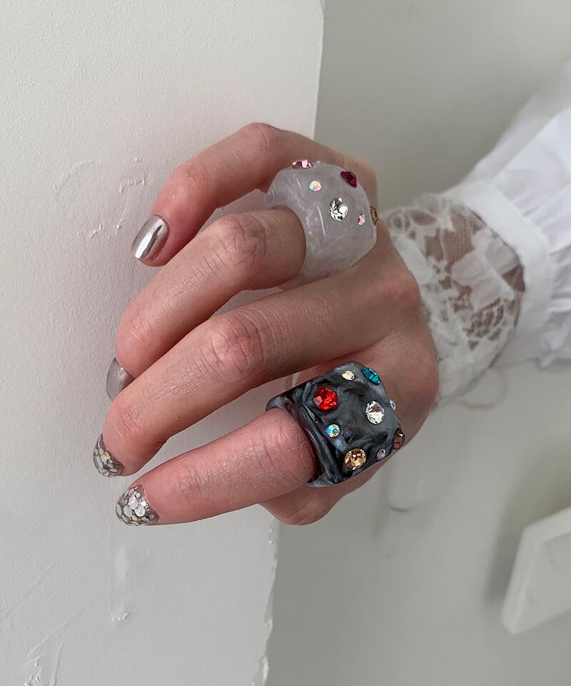 スクエアフォルムに繊細な輝きを閉じ込めたデザインリング。