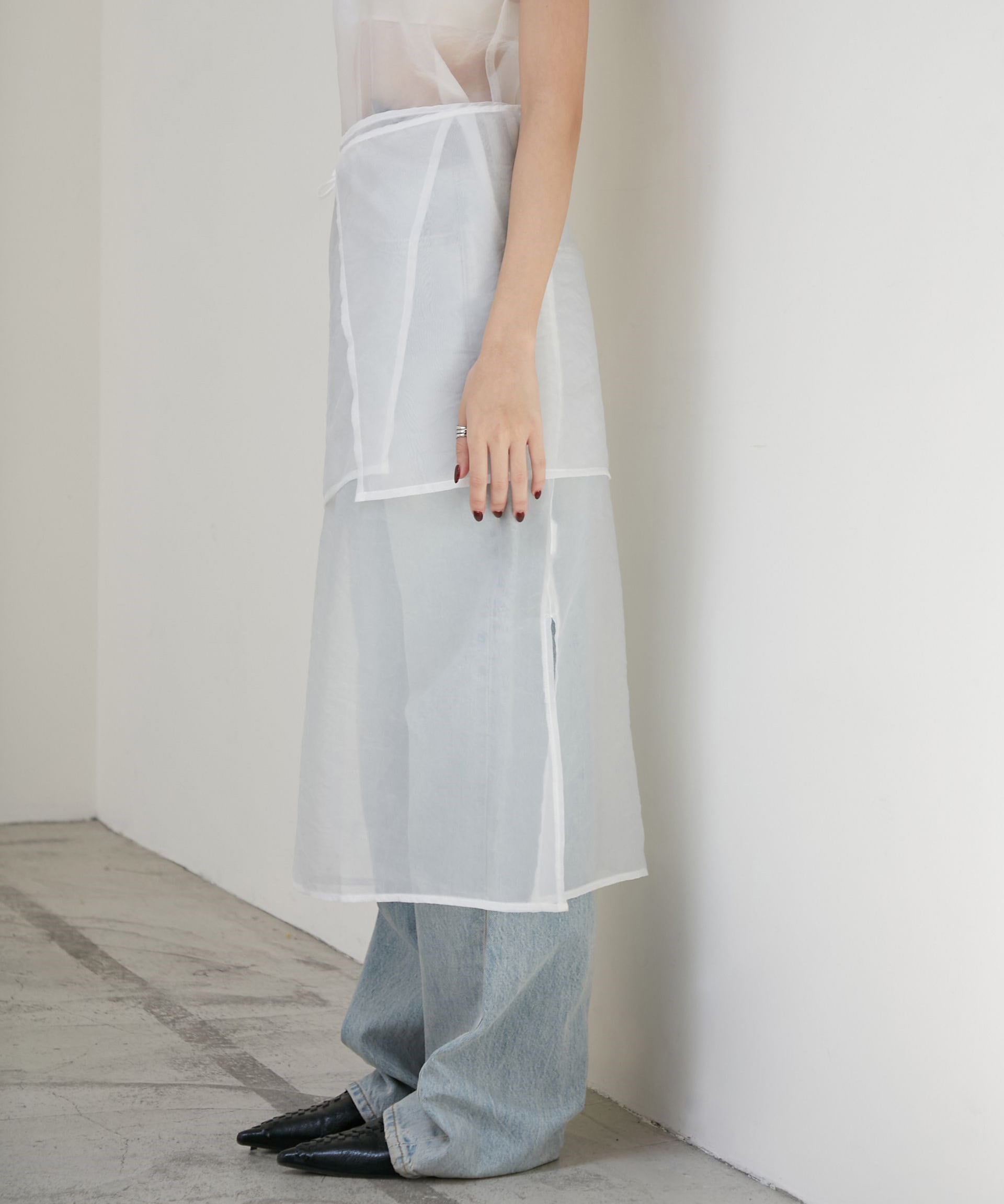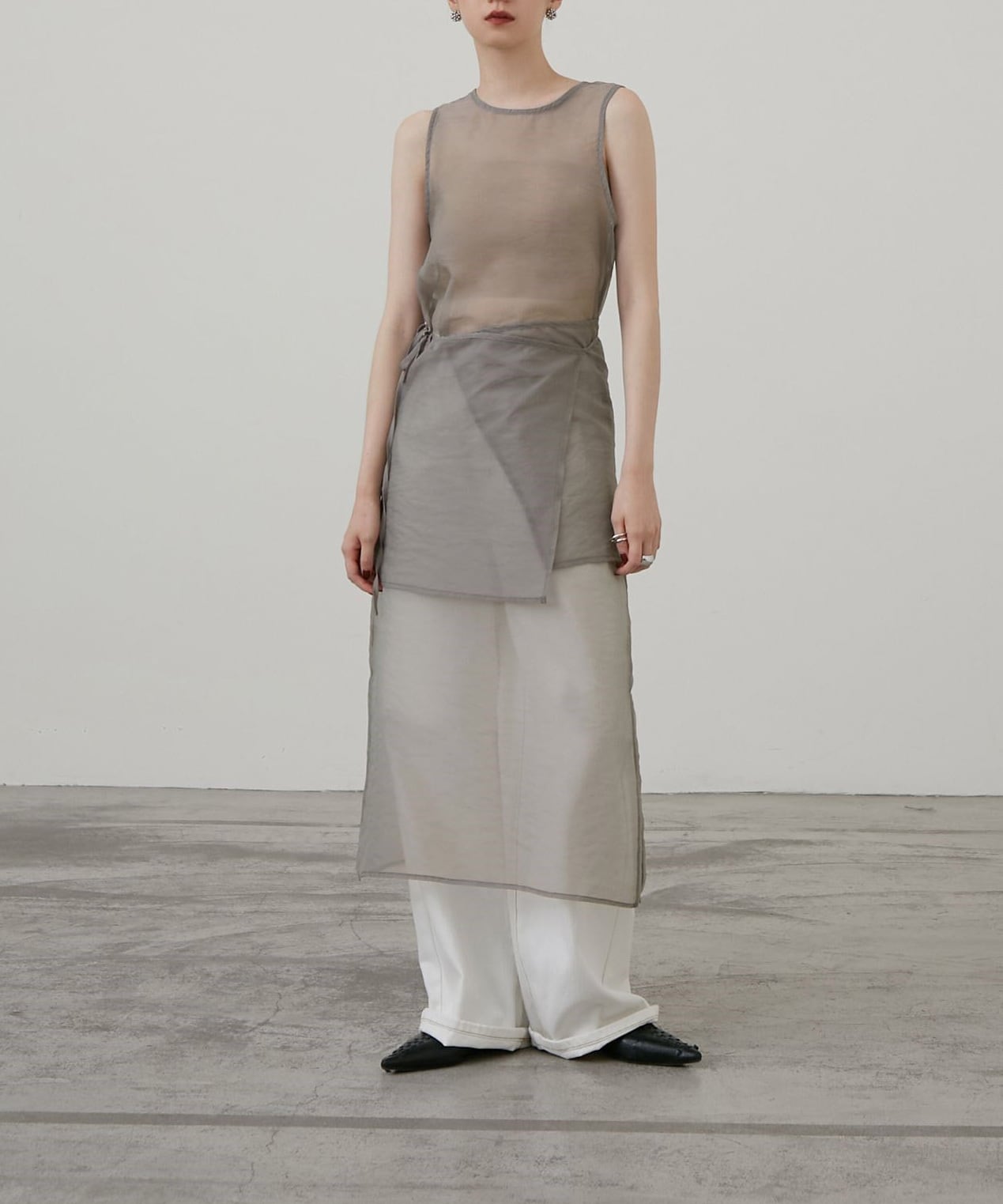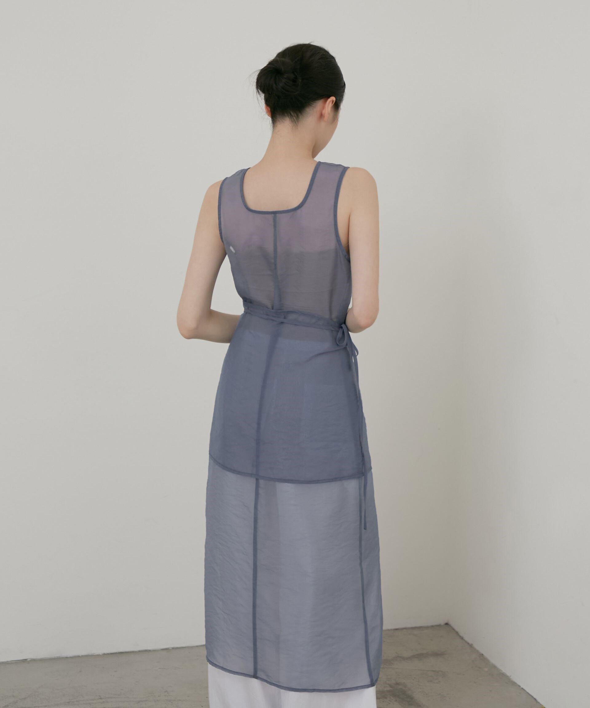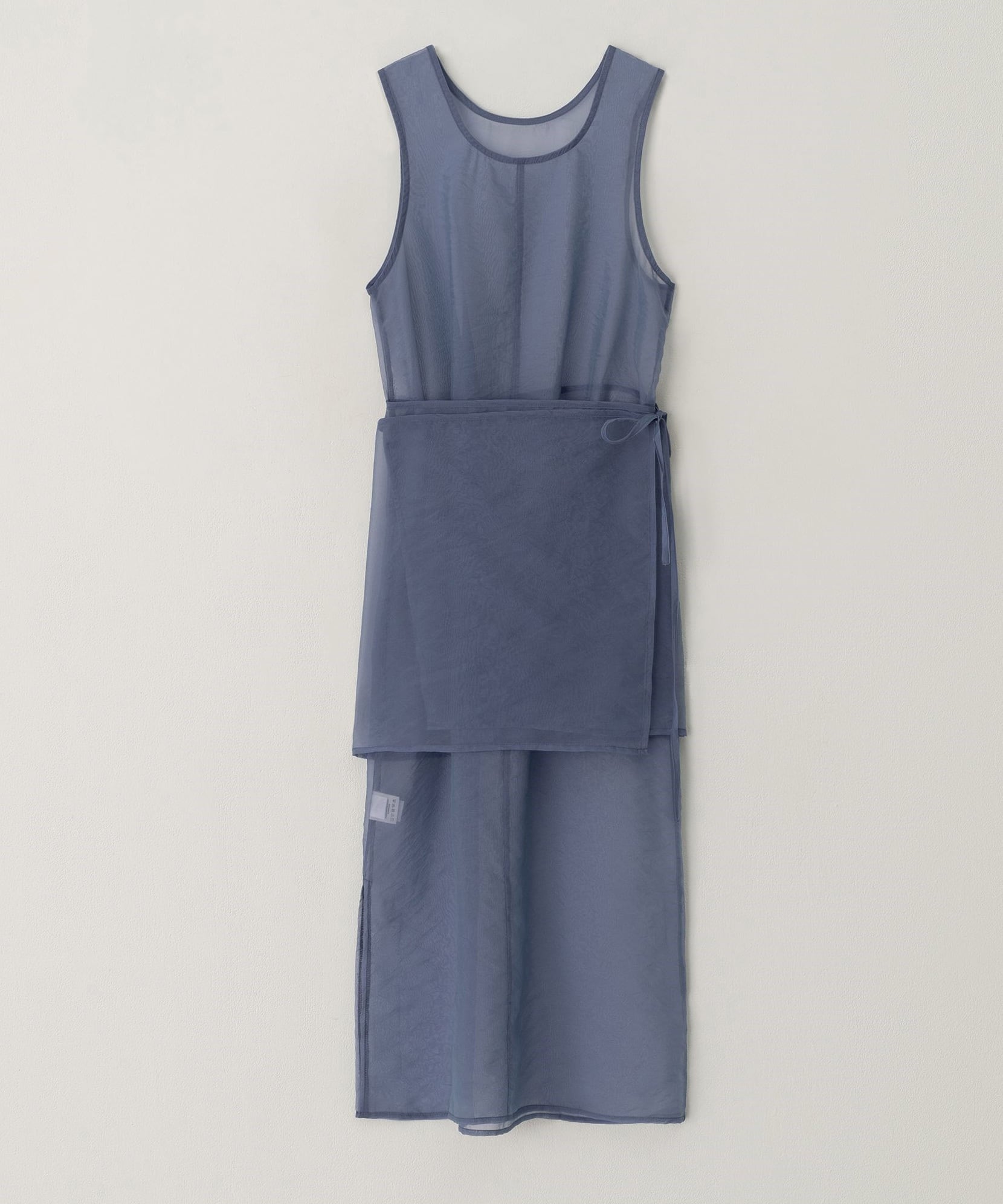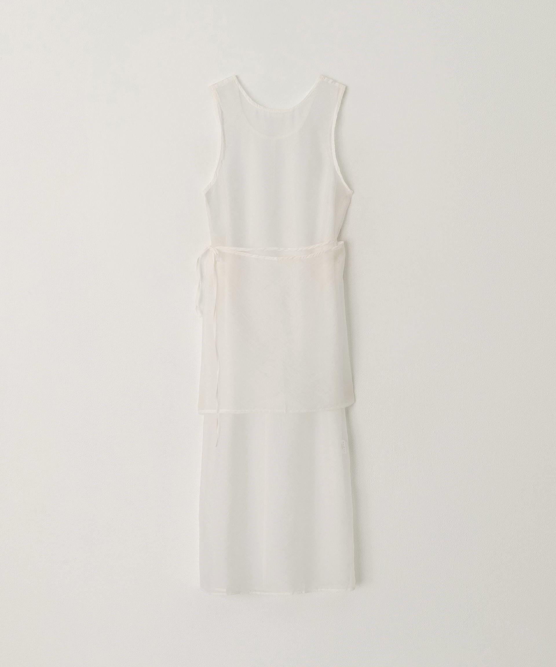 シアー素材のラップデザインを重ねた、奥行きのあるレイヤードワンピース。