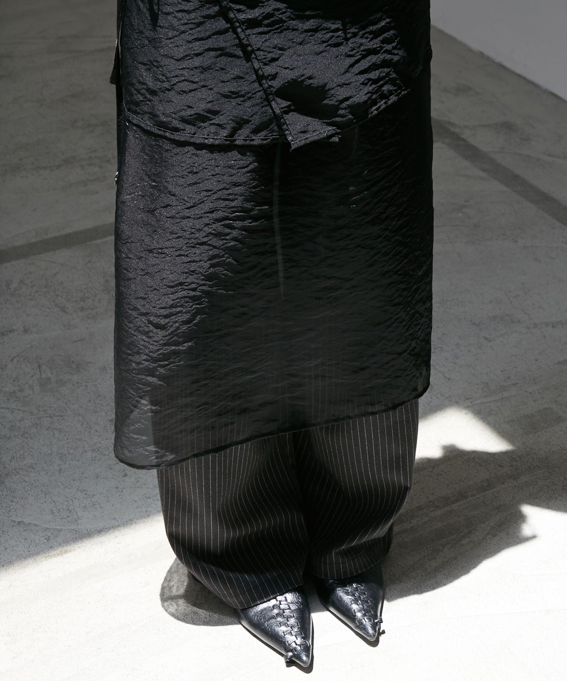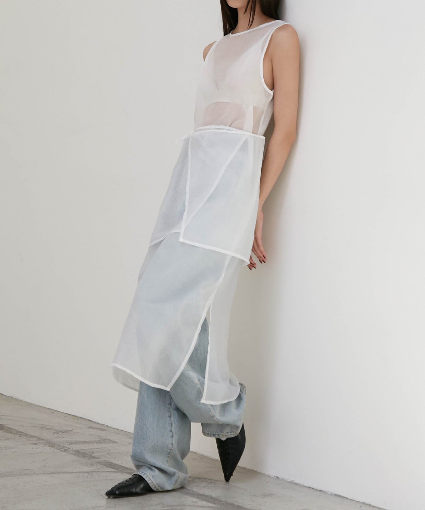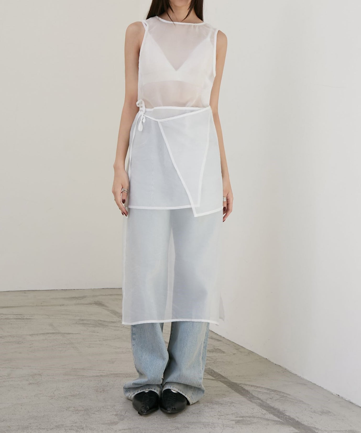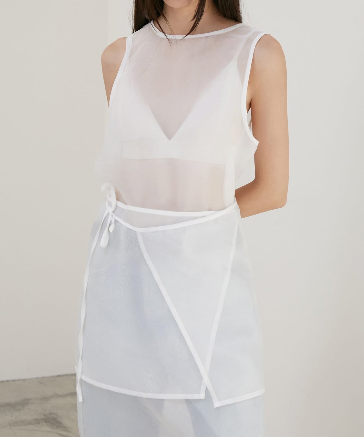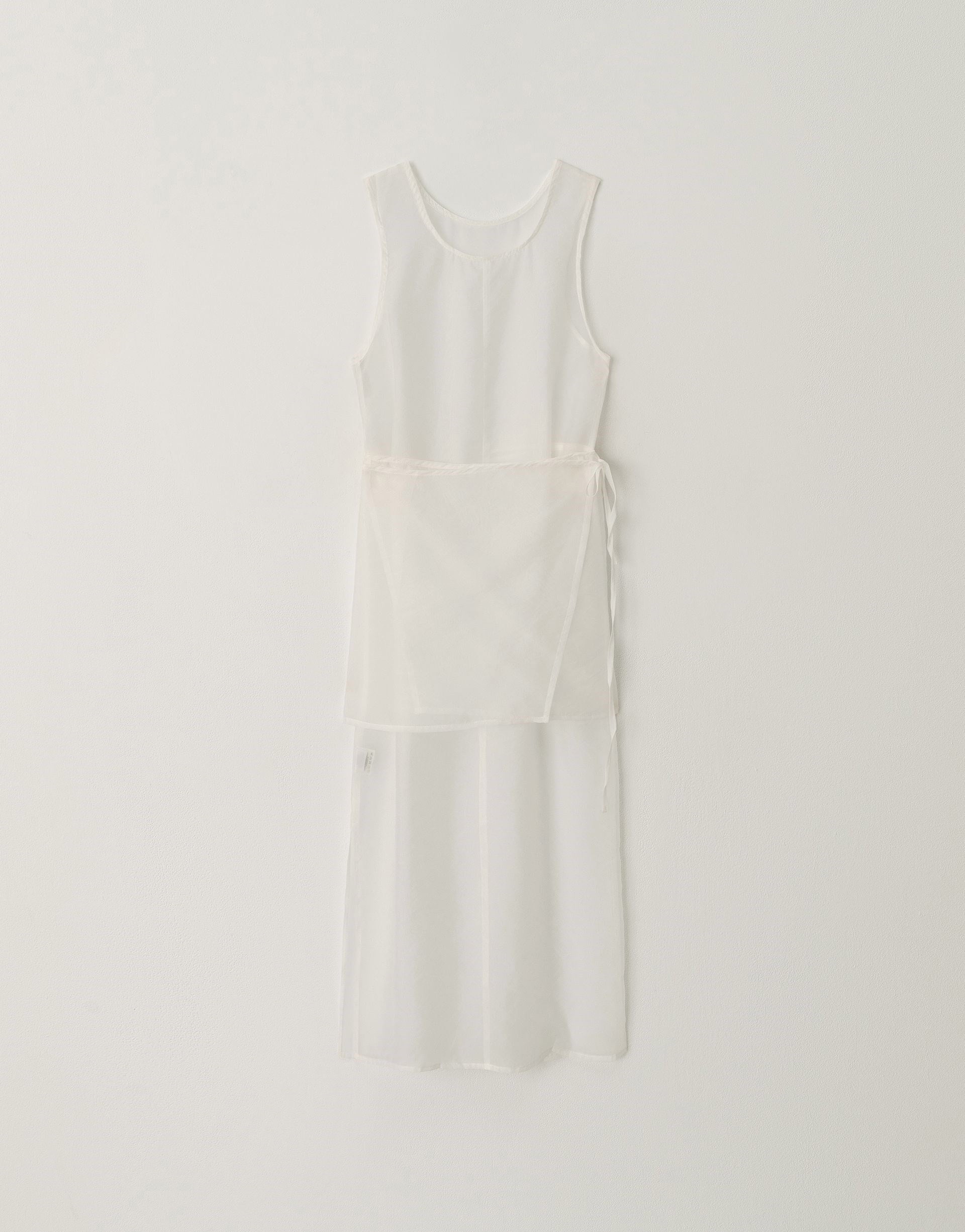 シアー素材のラップデザインを重ねた、奥行きのあるレイヤードワンピース。