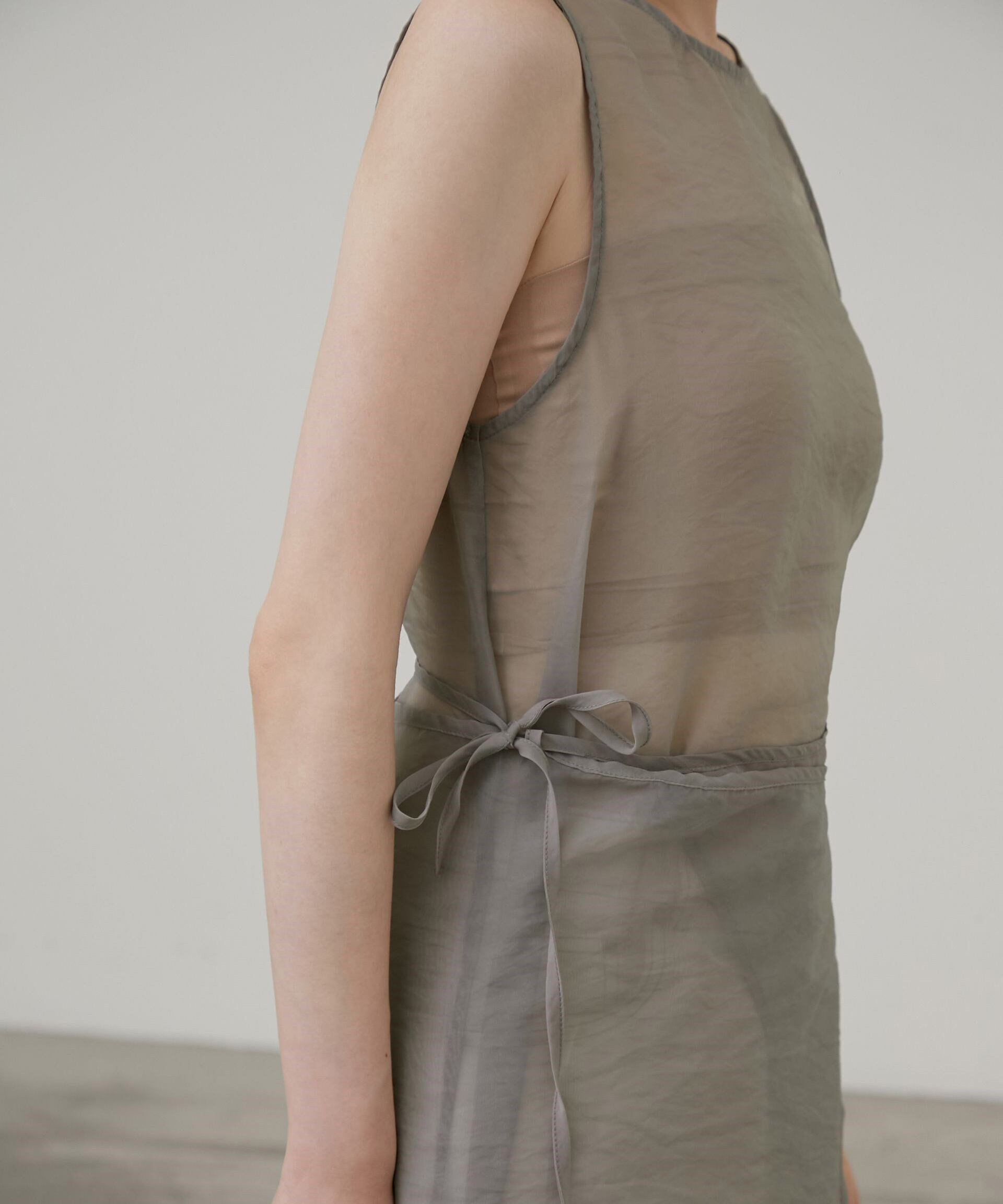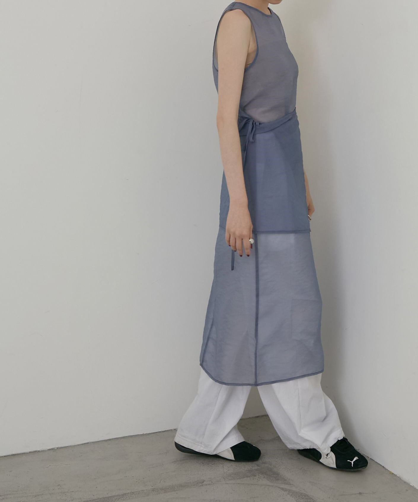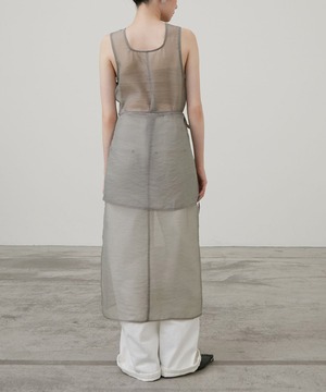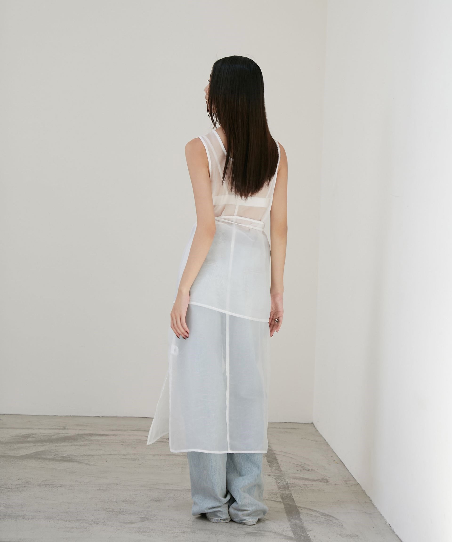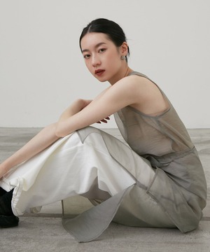 ノースリーブのロングワンピースに重ねることで、動きのある軽やかな印象に。