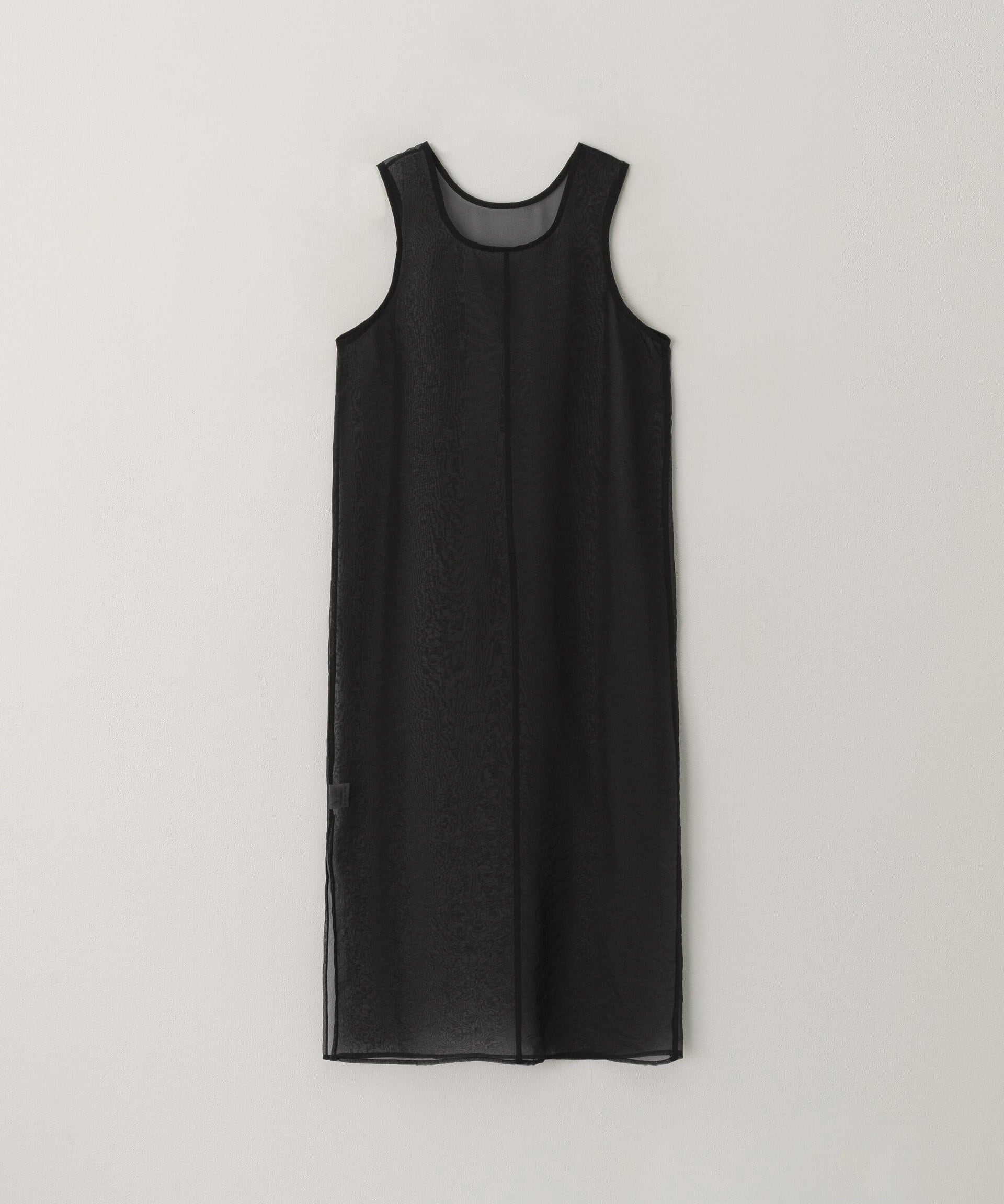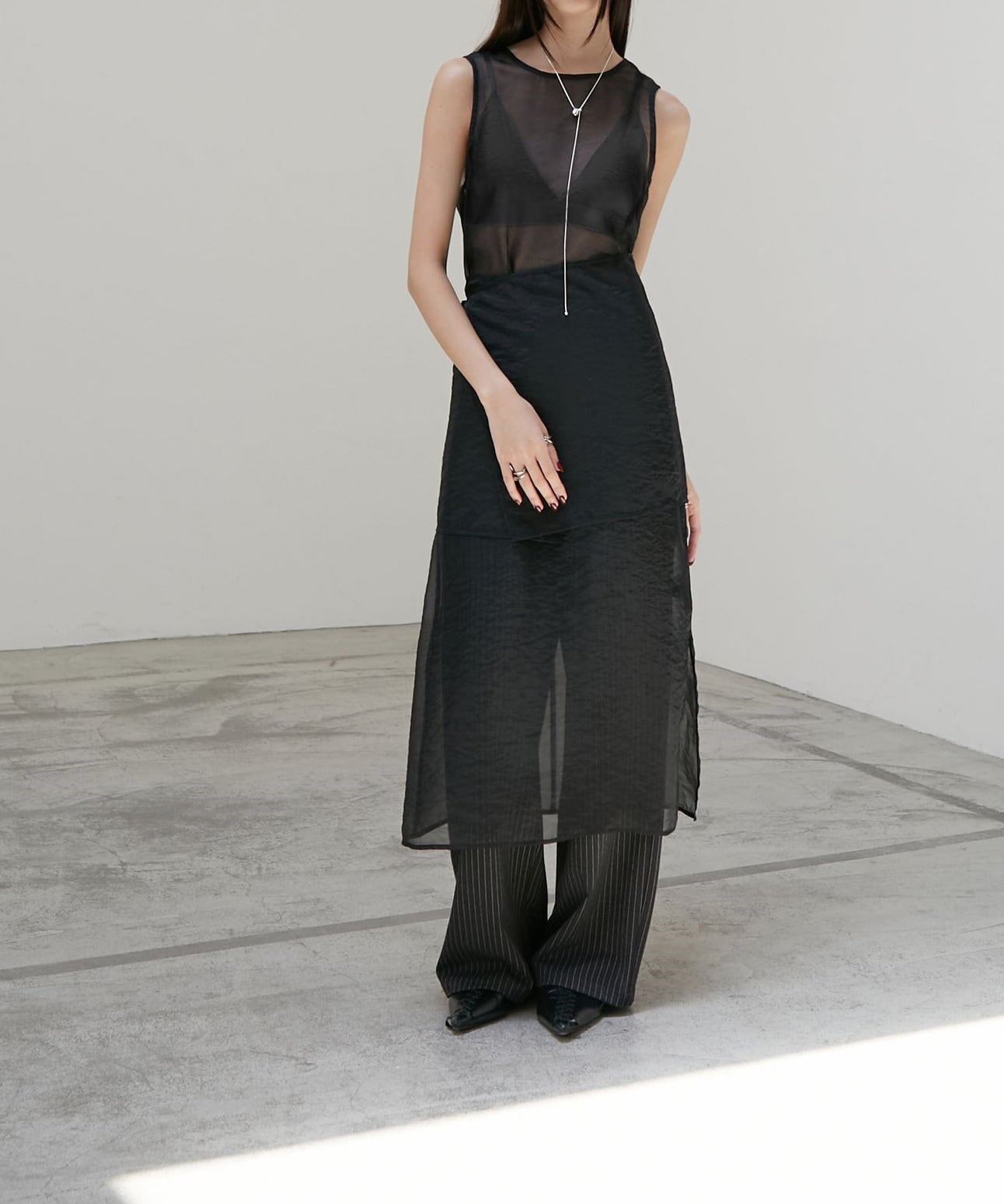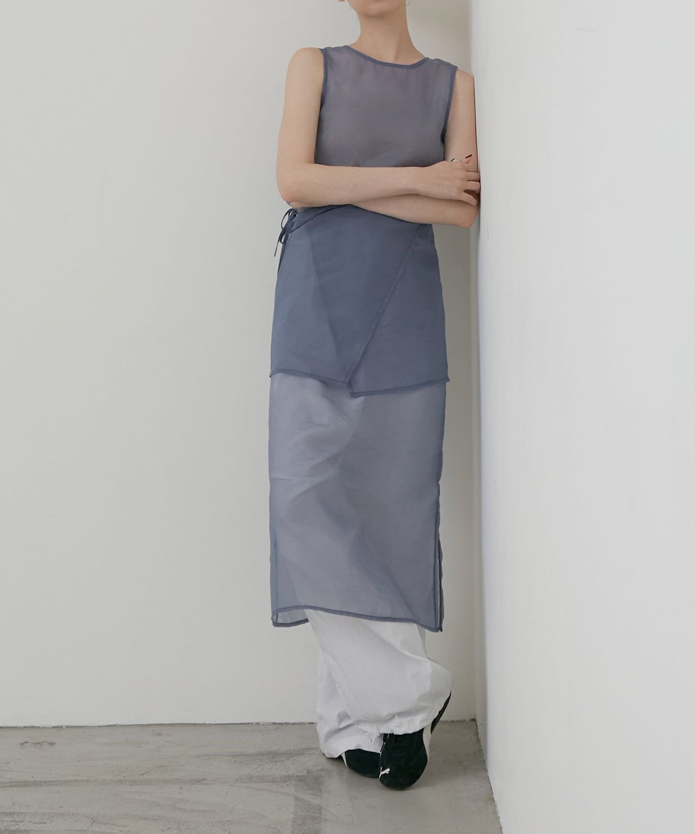 ノースリーブのロングワンピースに重ねることで、動きのある軽やかな印象に。