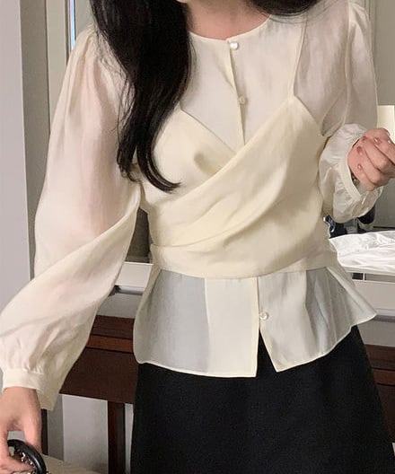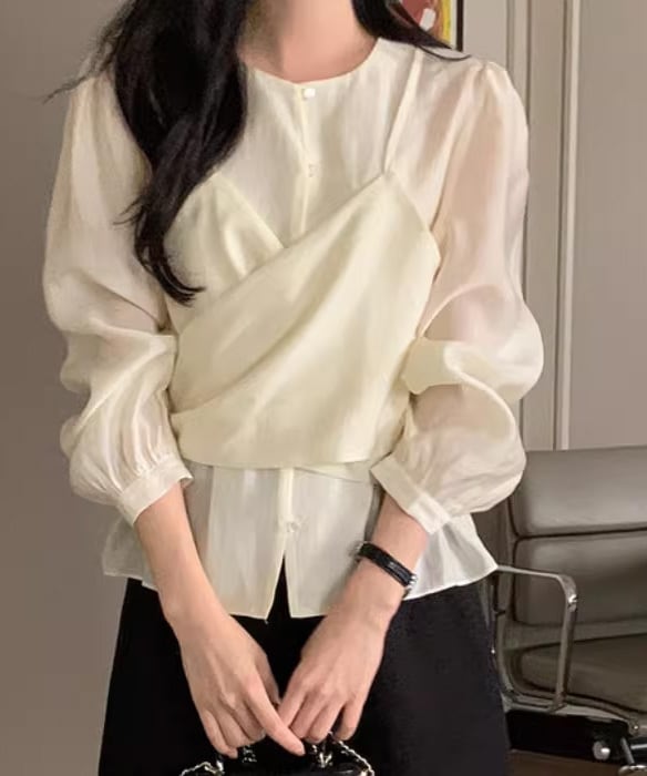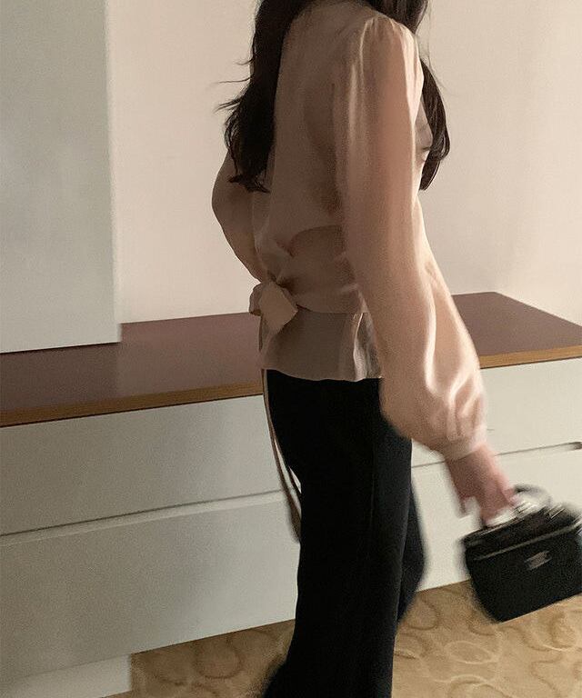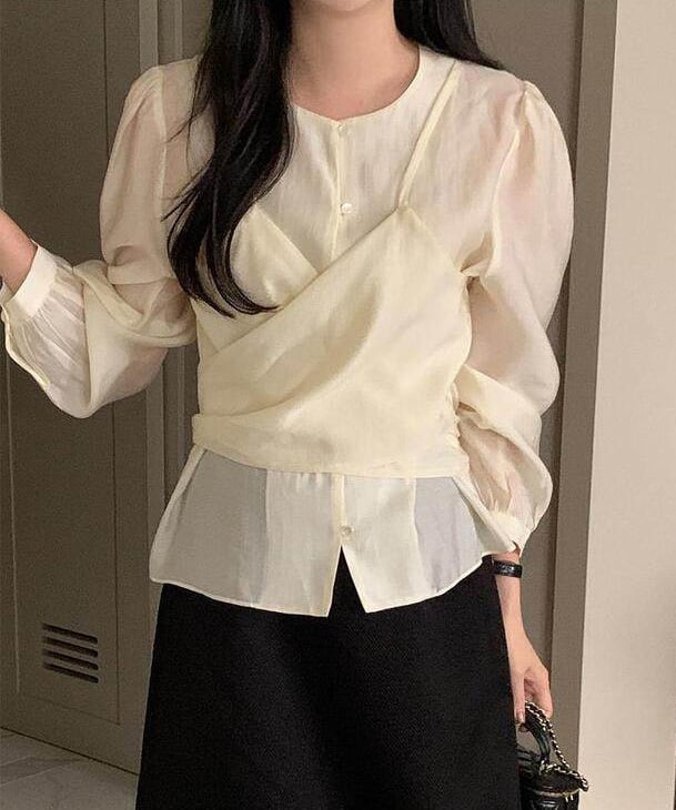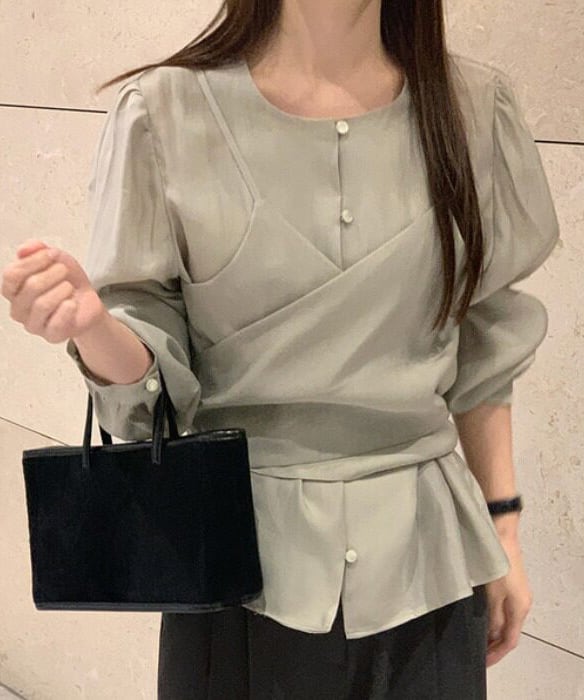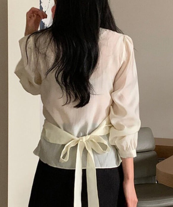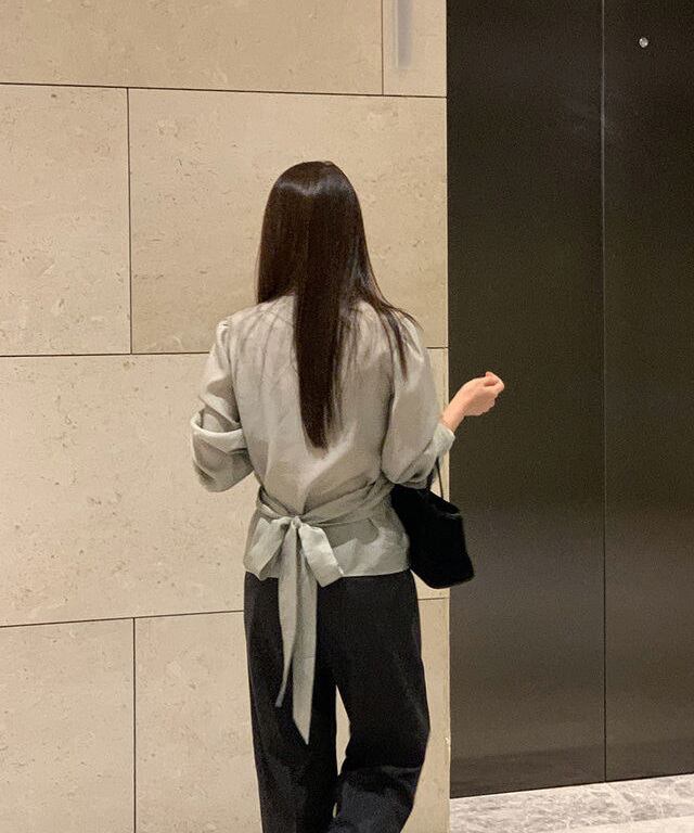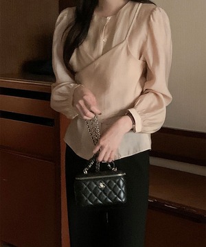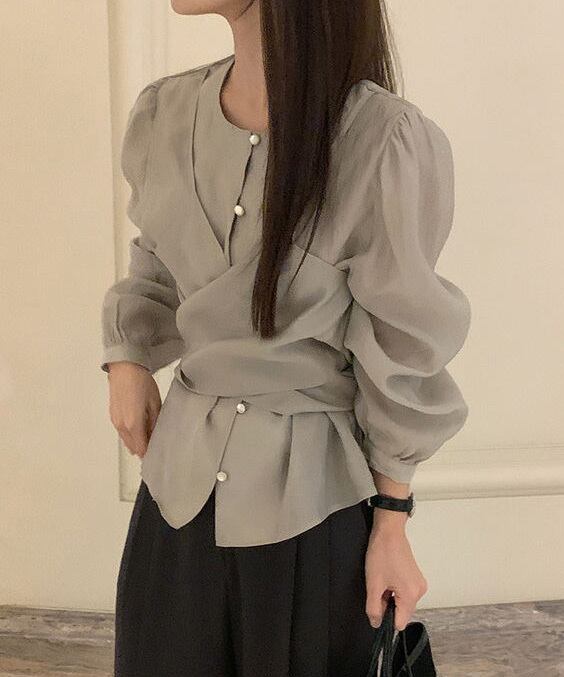 レイヤード風デザインが印象的なパフスリーブシャツ。 バックのリボンがアクセントとなり、甘さの中に程よいエッジをプラス。 一枚でコーディネートが決まる主役トップスです。
