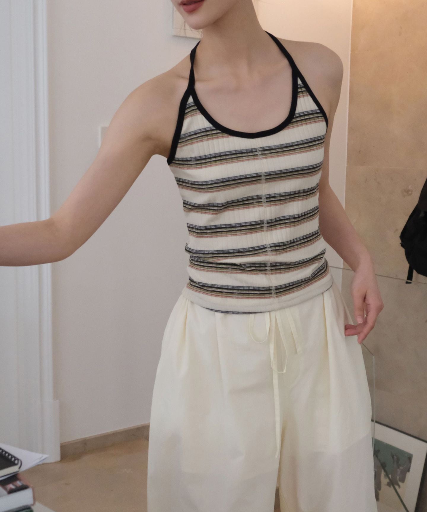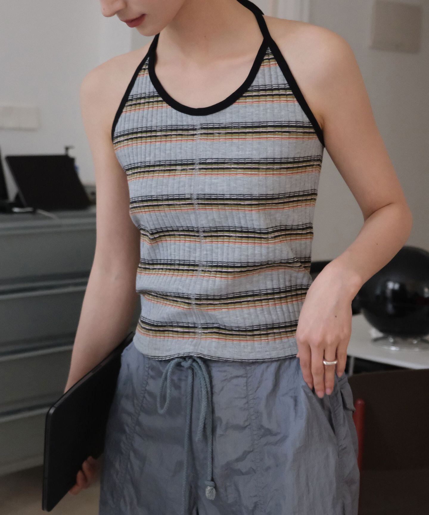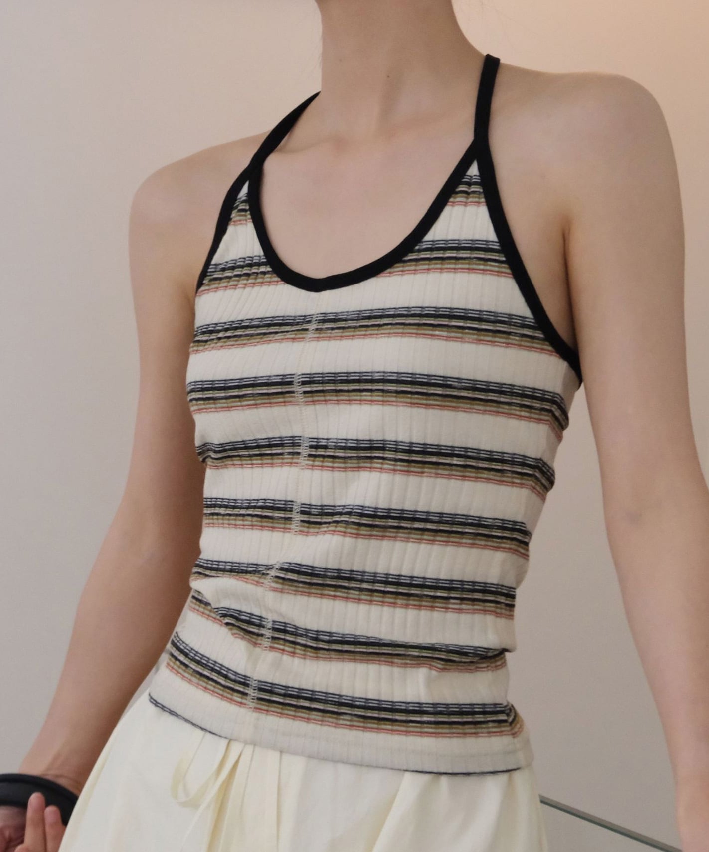 レトロなボーダー柄が目を惹くホルターネックキャミソール。