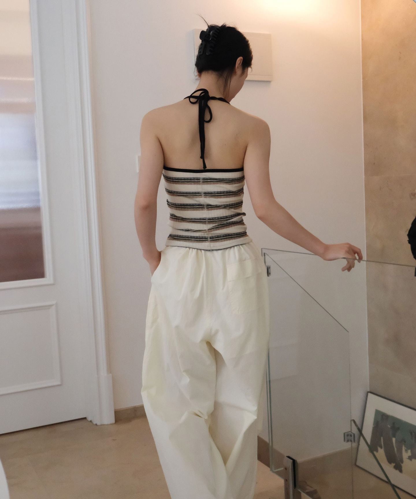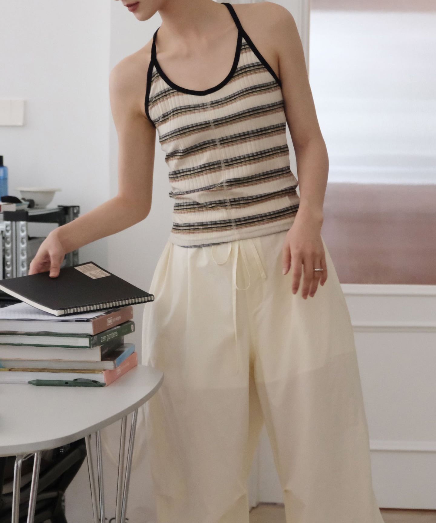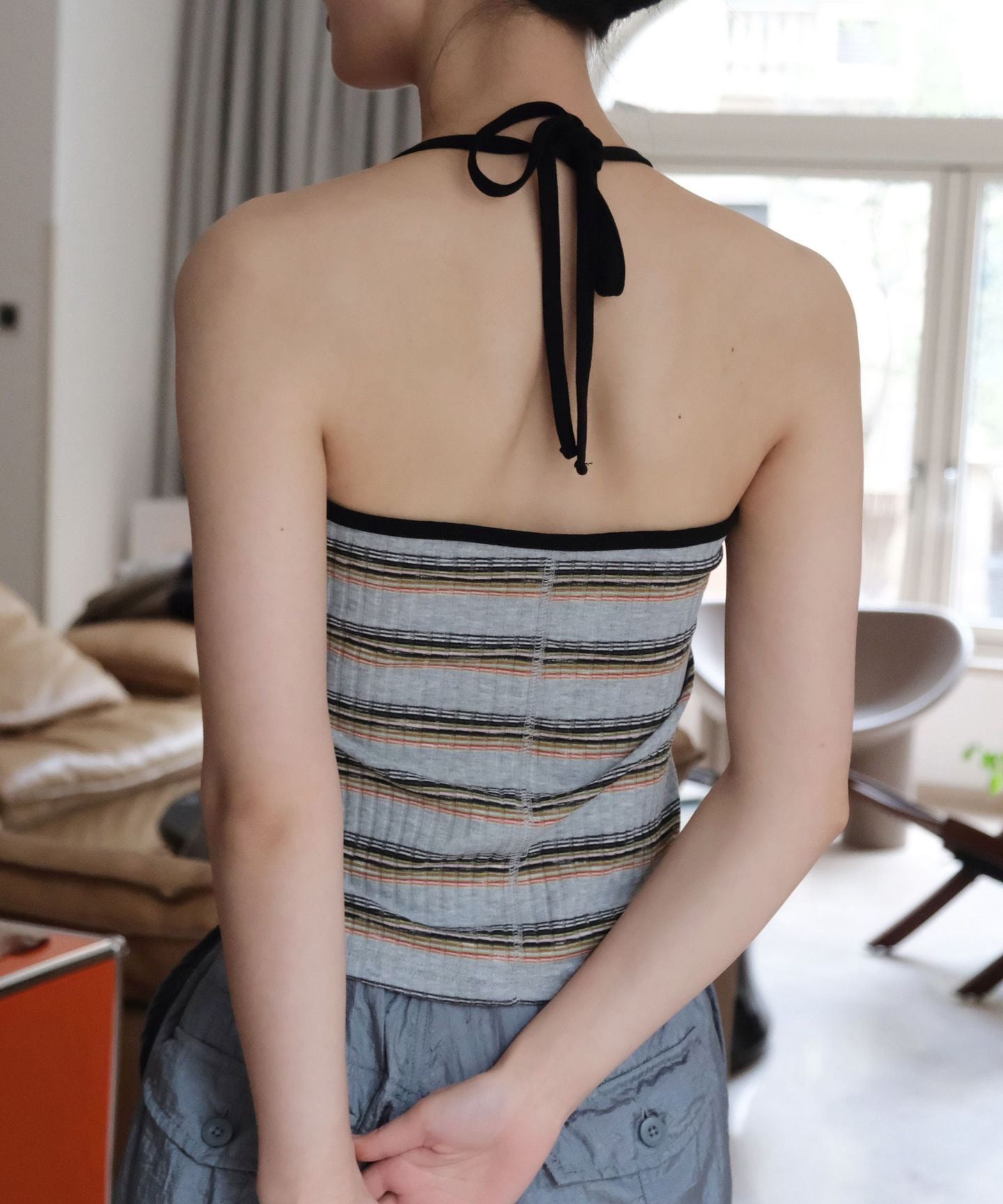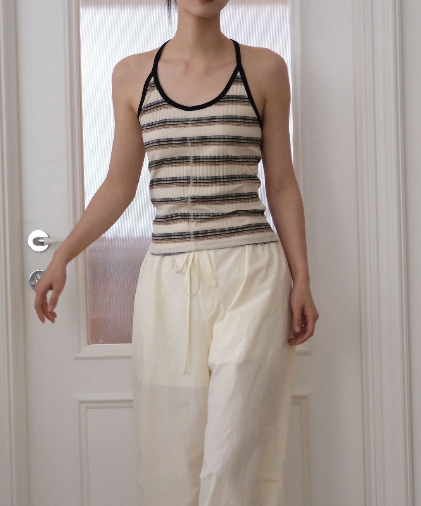 レトロなボーダー柄が目を惹くホルターネックキャミソール。